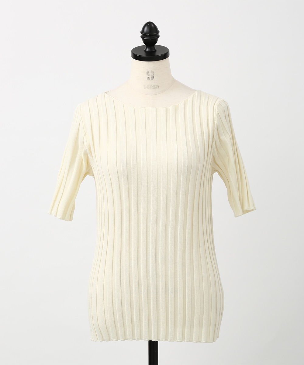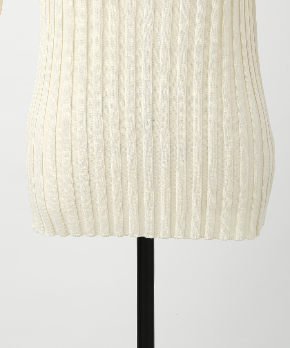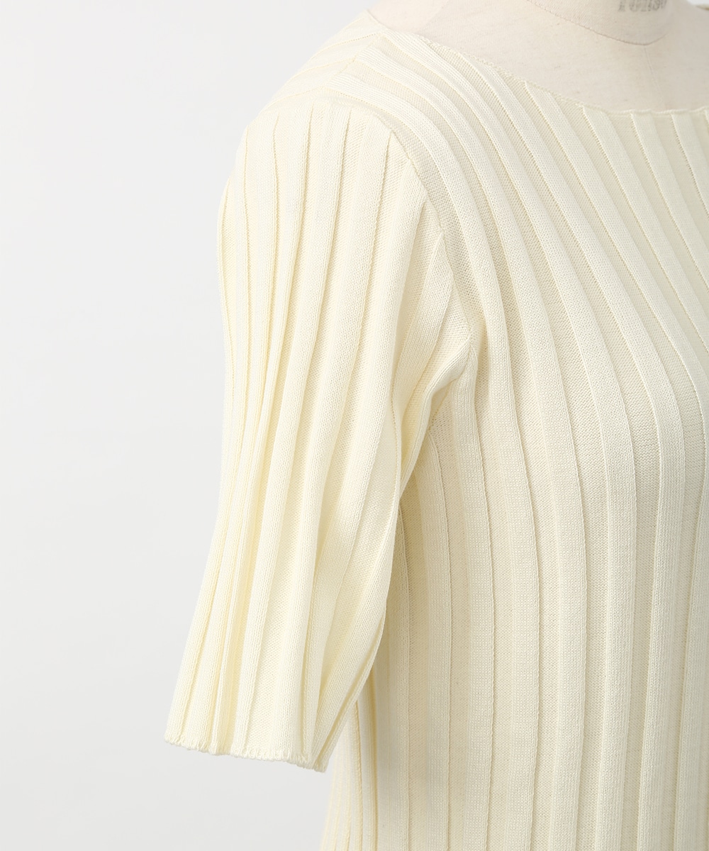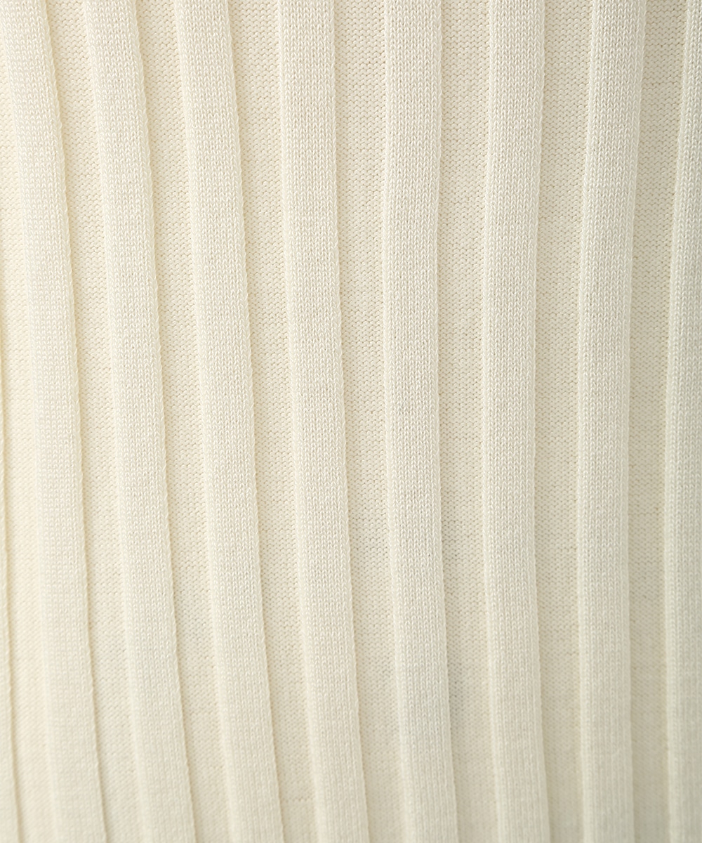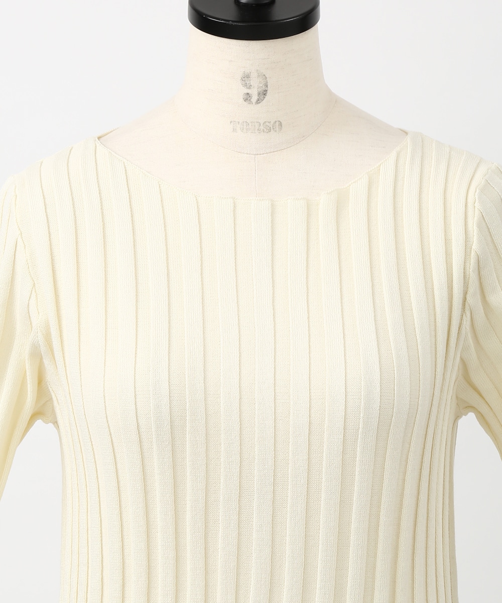 縦ラインを強調するワイドリブが特徴のプルオーバー。襟ぐりは極力シンプルなデザインに仕上げ、デコルテが美しく見えるようにしています。スカート合わせの1枚着にもちろん、ジャケットやシャツのインナーとして重ね着したスタイリングもおすすめです。