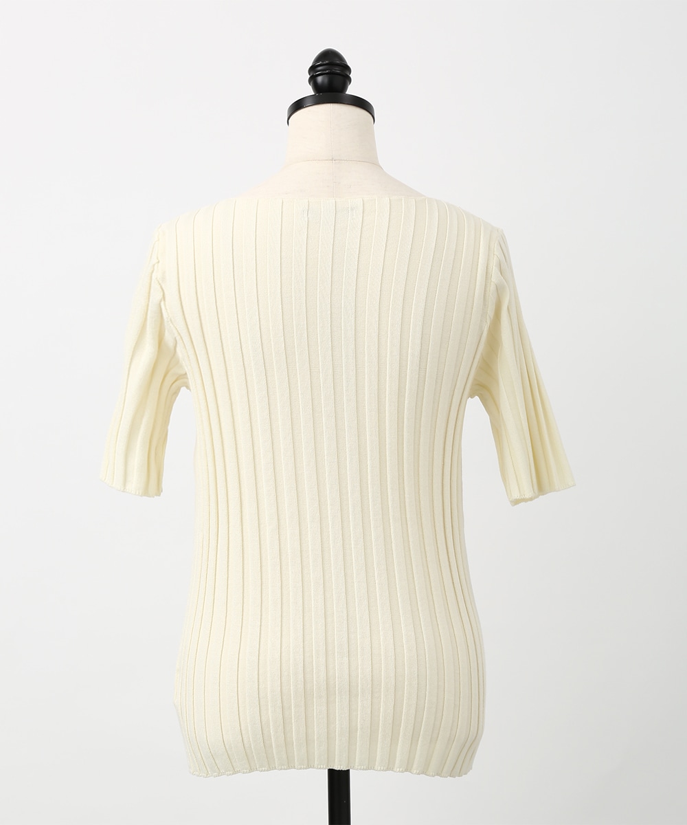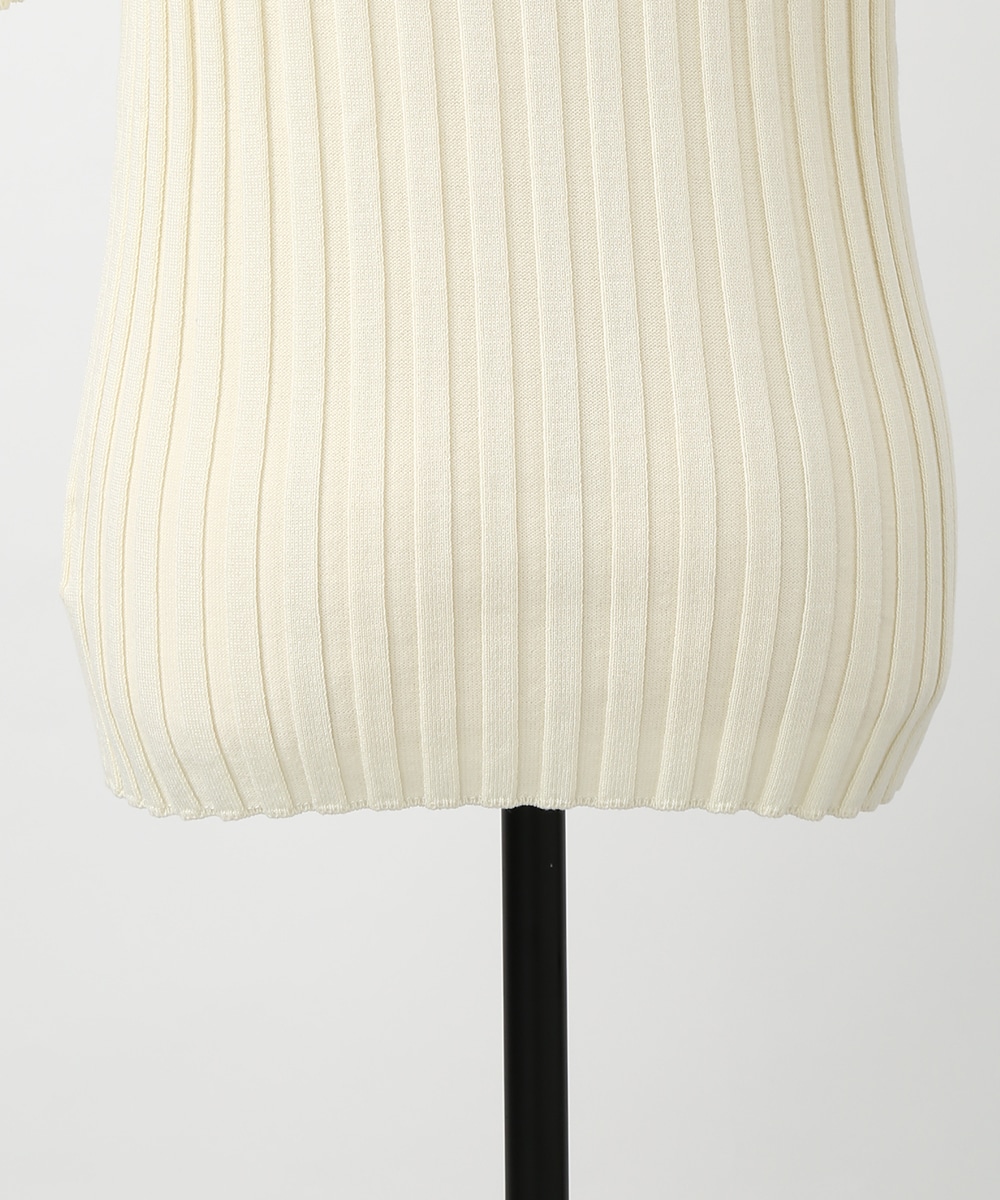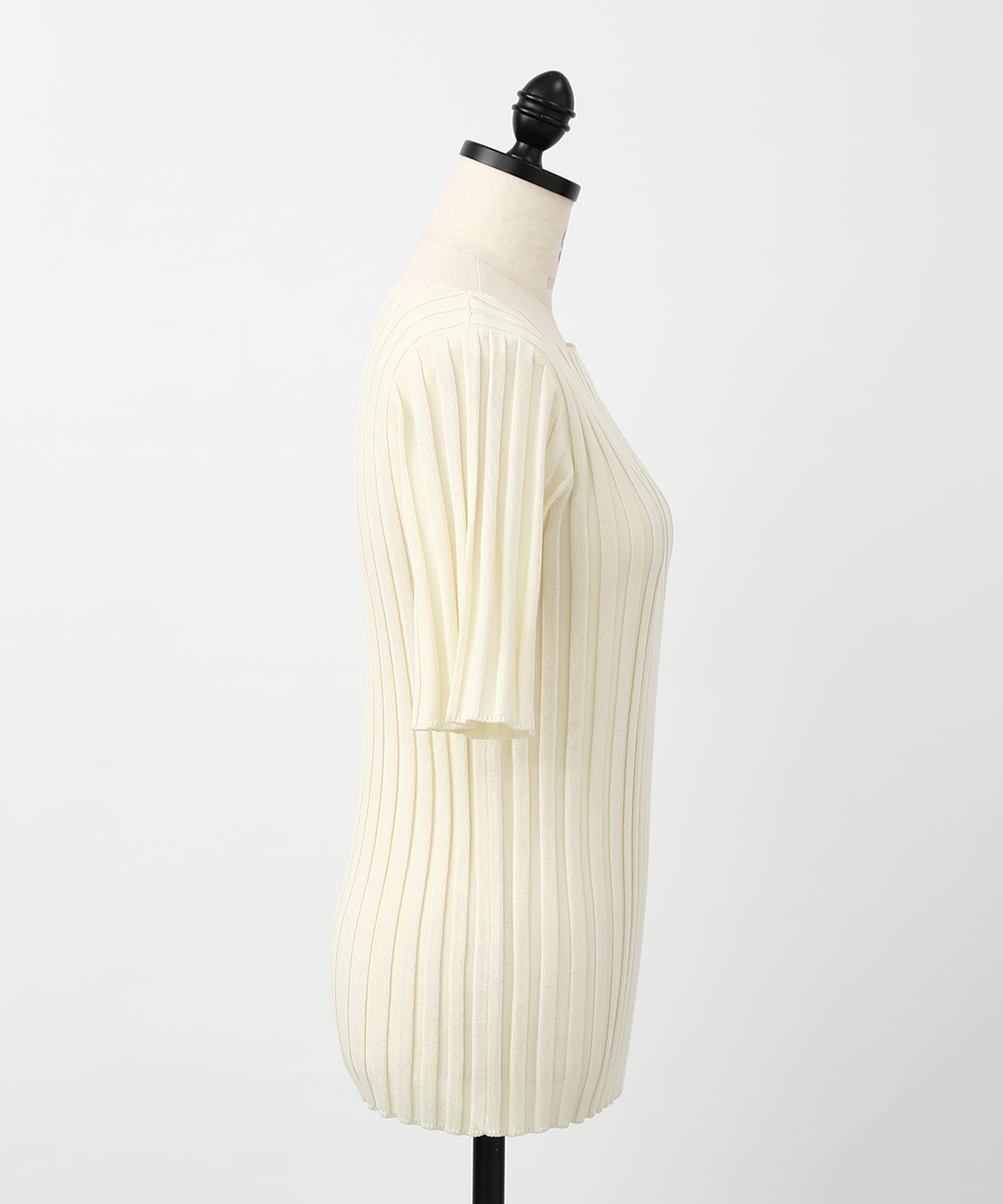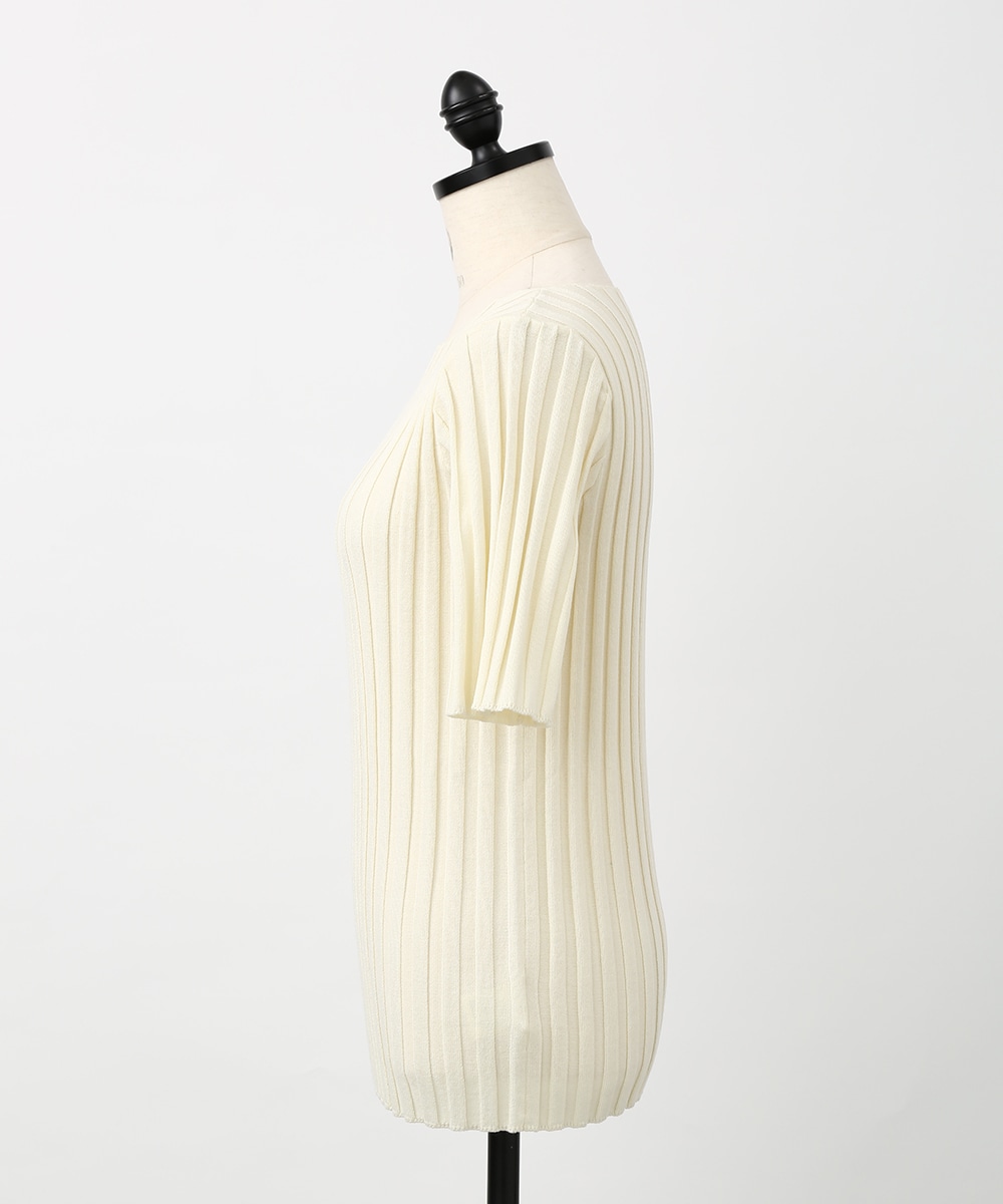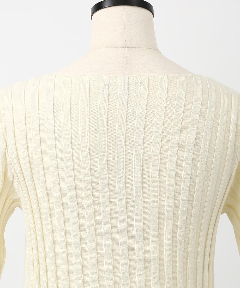 縦ラインを強調するワイドリブが特徴のプルオーバー。襟ぐりは極力シンプルなデザインに仕上げ、デコルテが美しく見えるようにしています。スカート合わせの1枚着にもちろん、ジャケットやシャツのインナーとして重ね着したスタイリングもおすすめです。
