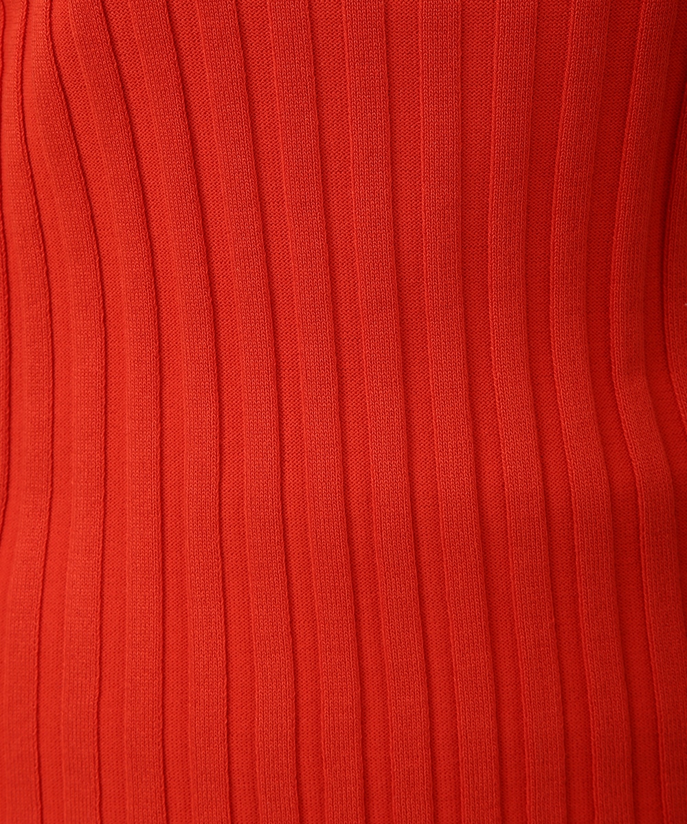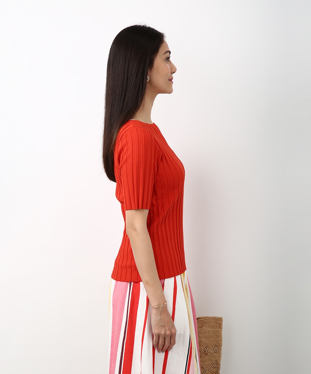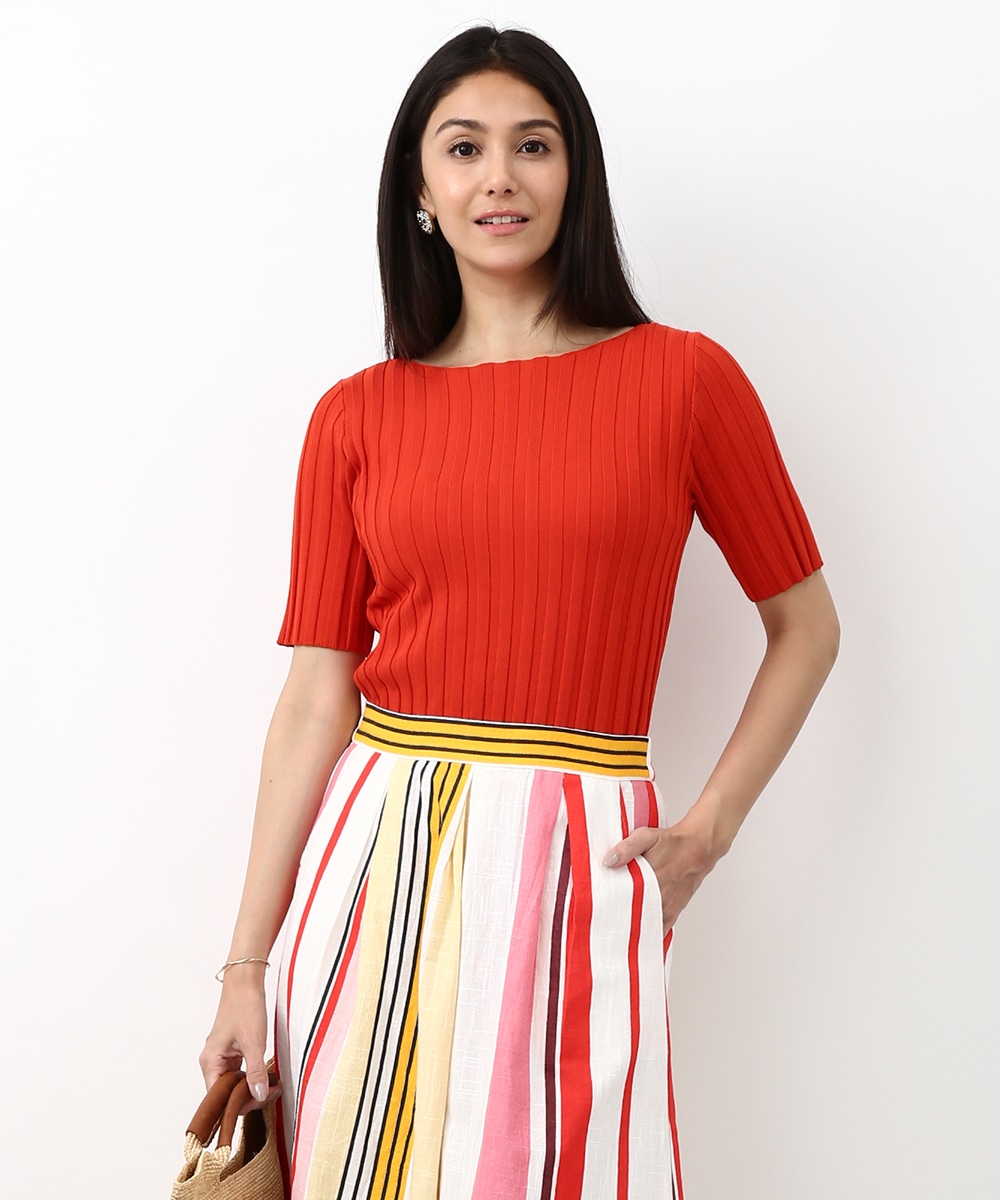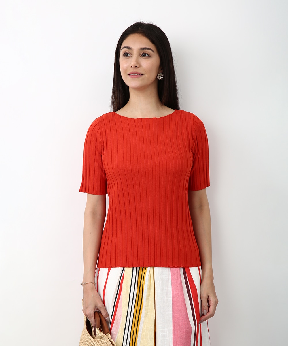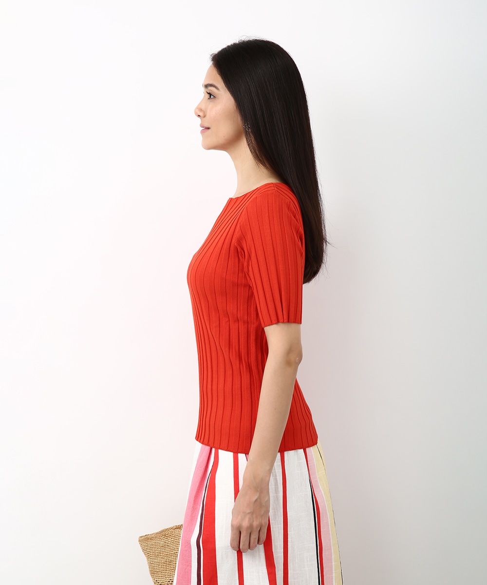 縦ラインを強調するワイドリブが特徴のプルオーバー。襟ぐりは極力シンプルなデザインに仕上げ、デコルテが美しく見えるようにしています。スカート合わせの1枚着にもちろん、ジャケットやシャツのインナーとして重ね着したスタイリングもおすすめです。