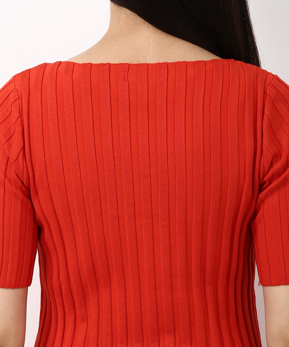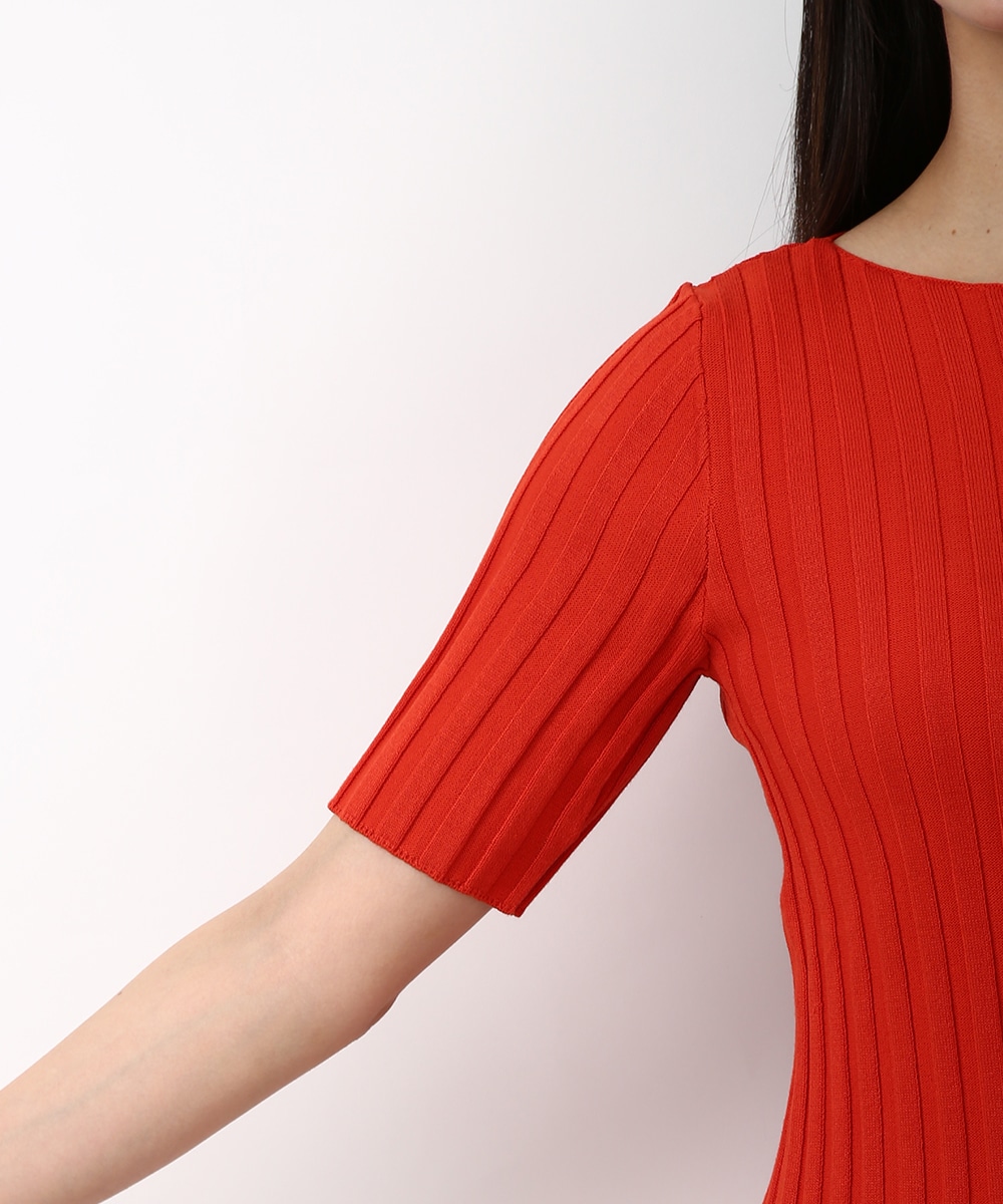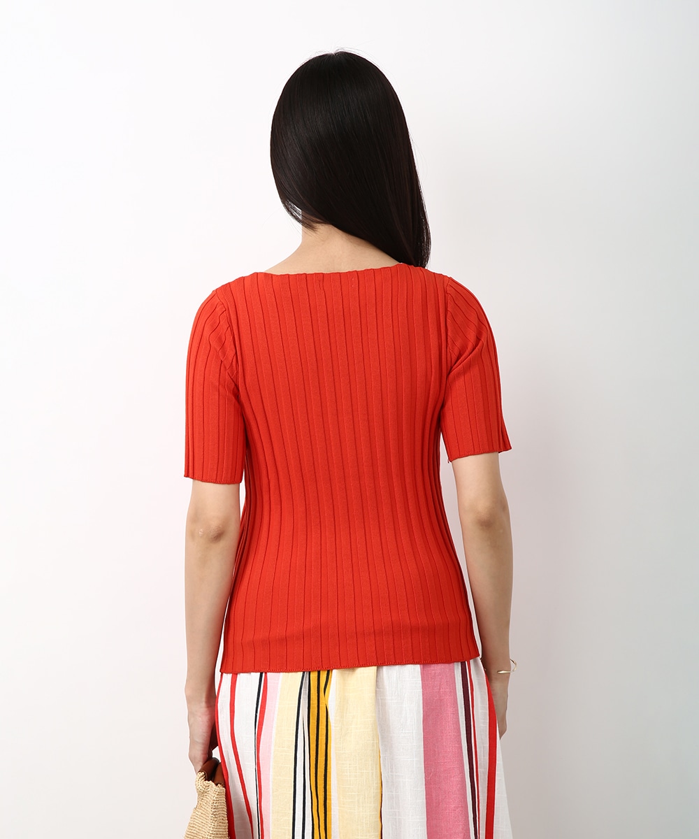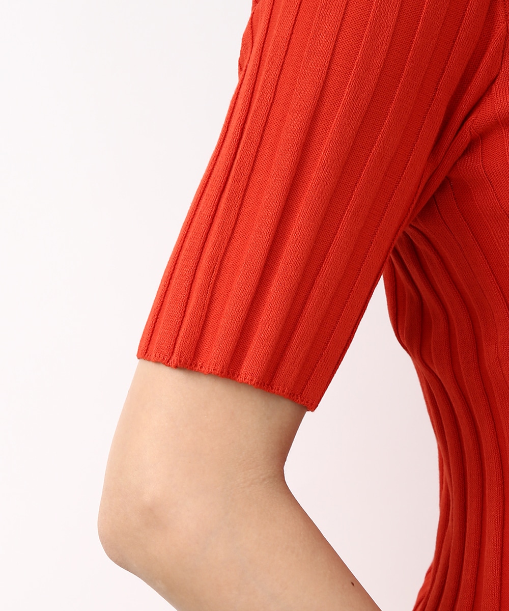 縦ラインを強調するワイドリブが特徴のプルオーバー。襟ぐりは極力シンプルなデザインに仕上げ、デコルテが美しく見えるようにしています。スカート合わせの1枚着にもちろん、ジャケットやシャツのインナーとして重ね着したスタイリングもおすすめです。
