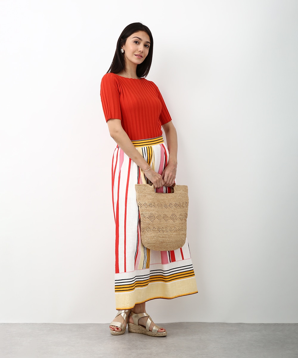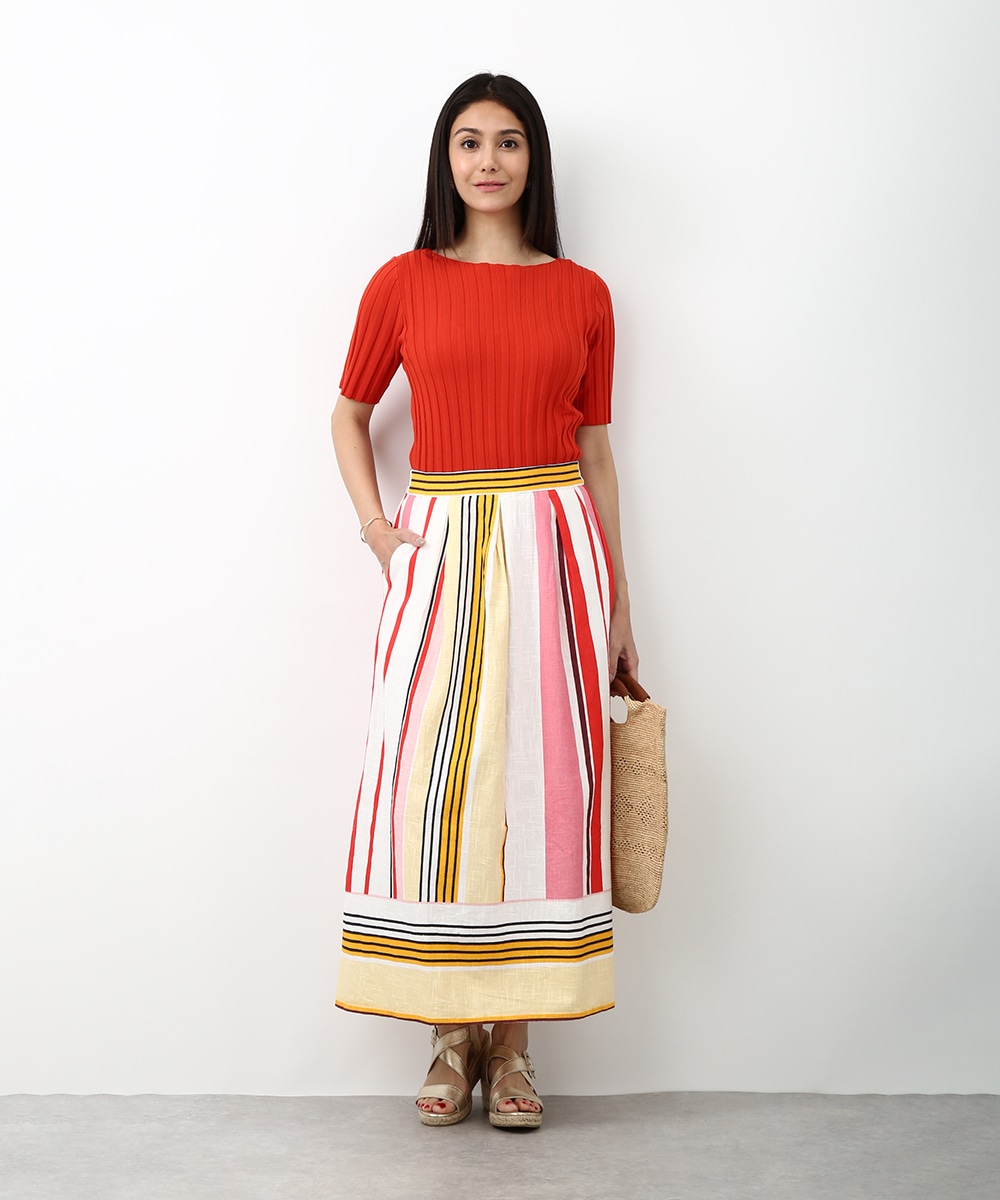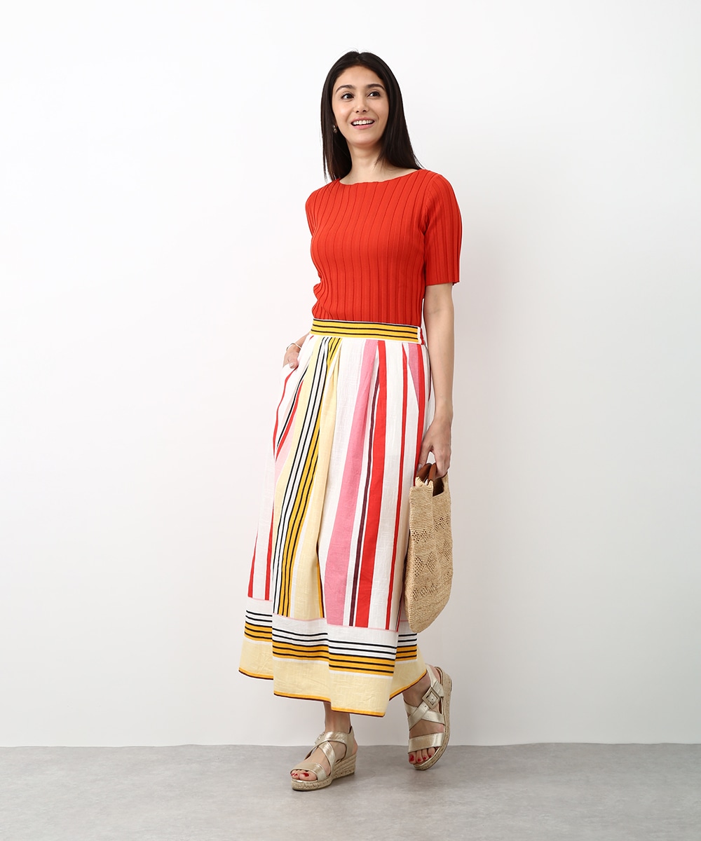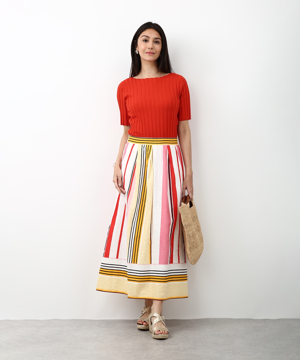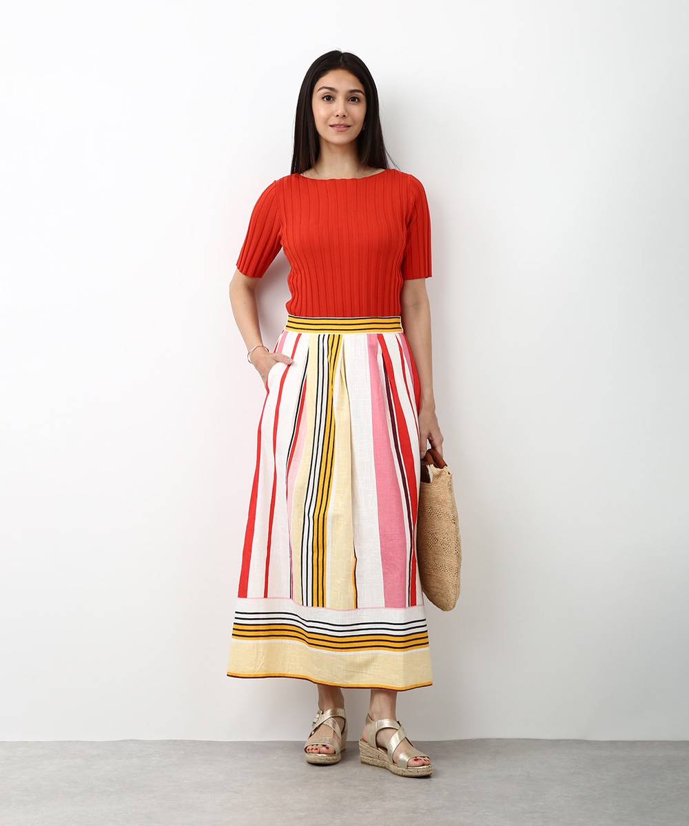 縦ラインを強調するワイドリブが特徴のプルオーバー。襟ぐりは極力シンプルなデザインに仕上げ、デコルテが美しく見えるようにしています。スカート合わせの1枚着にもちろん、ジャケットやシャツのインナーとして重ね着したスタイリングもおすすめです。