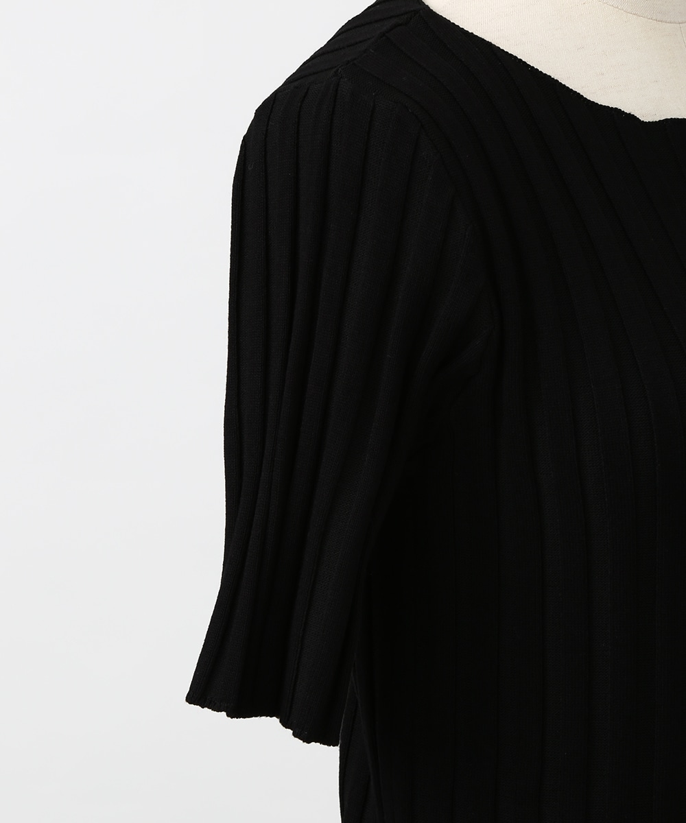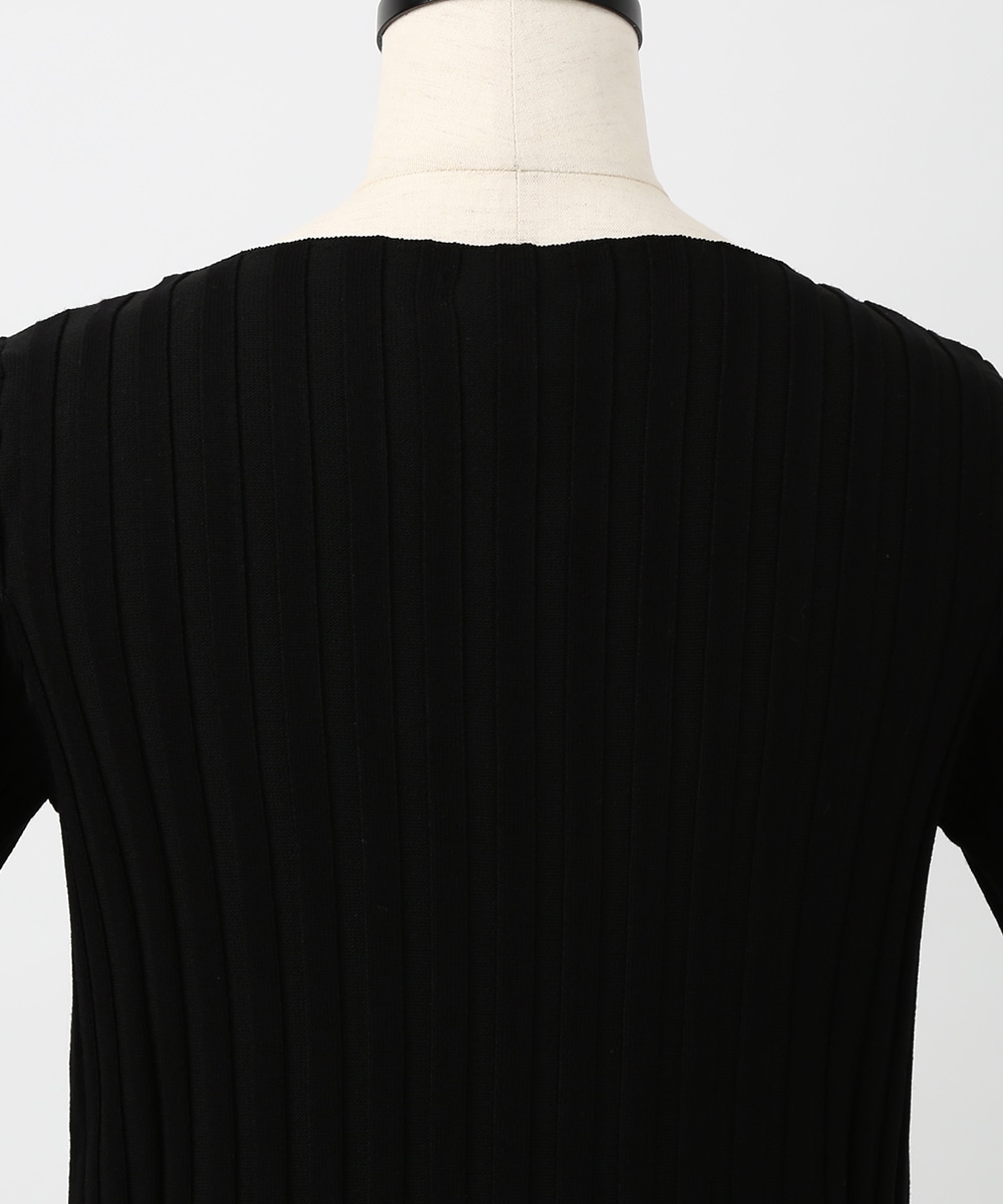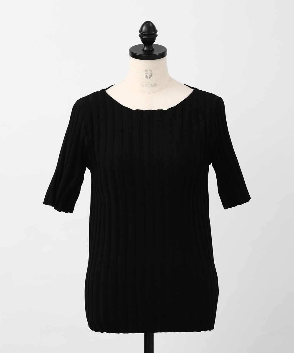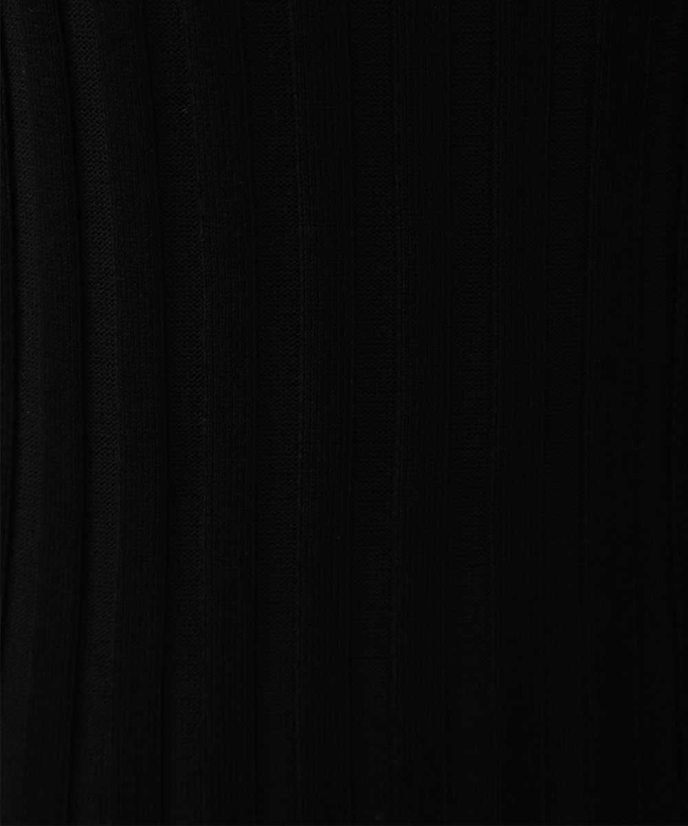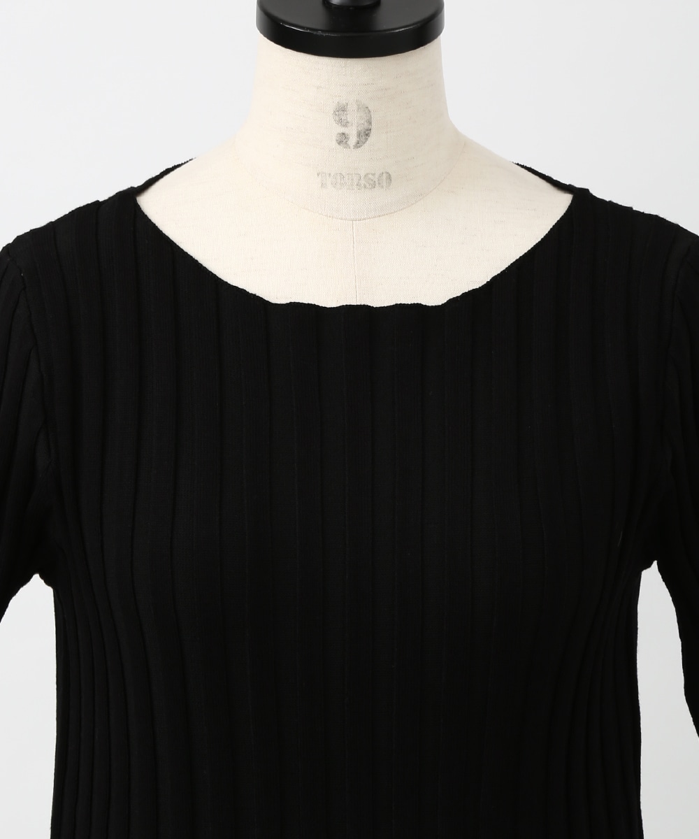 縦ラインを強調するワイドリブが特徴のプルオーバー。襟ぐりは極力シンプルなデザインに仕上げ、デコルテが美しく見えるようにしています。スカート合わせの1枚着にもちろん、ジャケットやシャツのインナーとして重ね着したスタイリングもおすすめです。