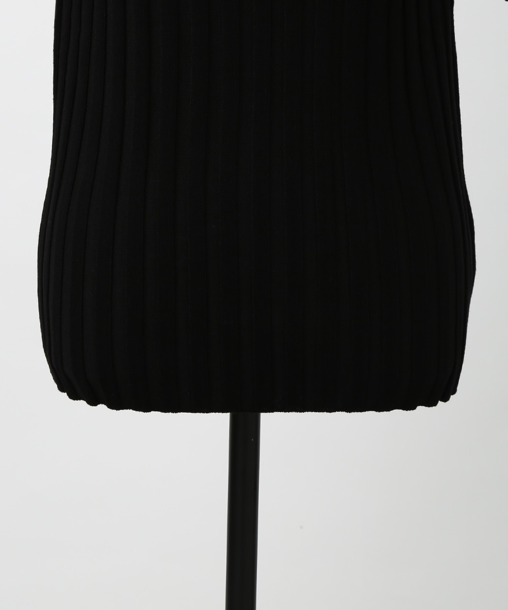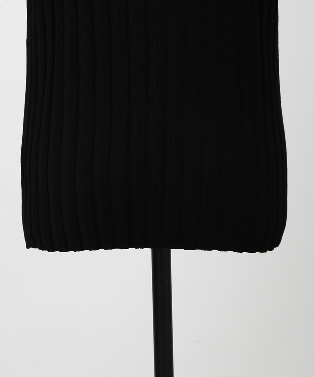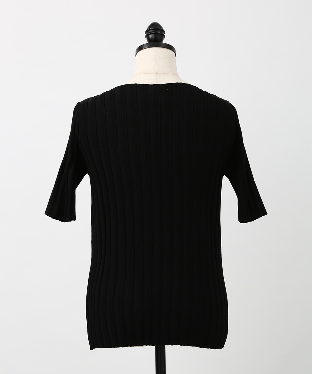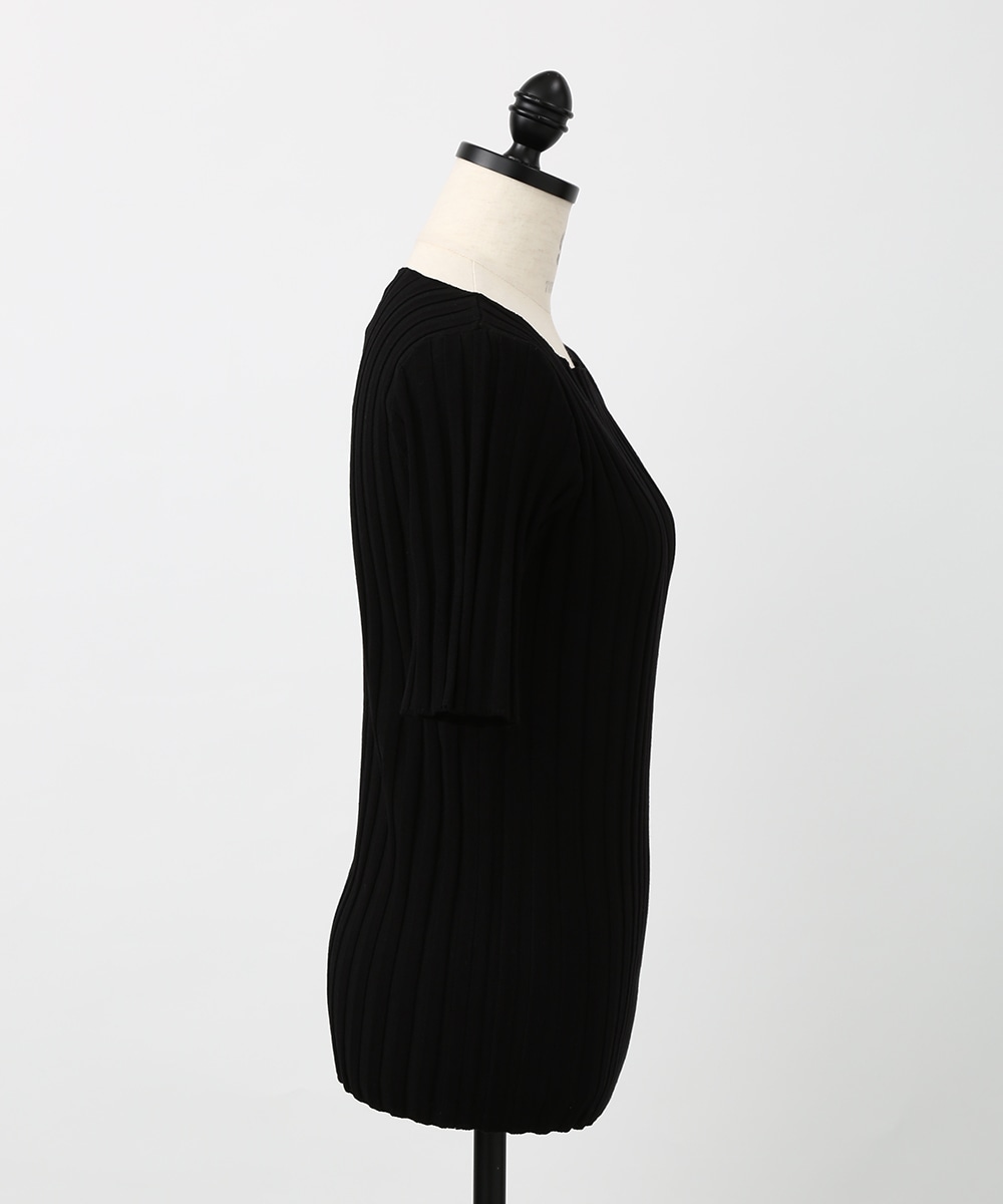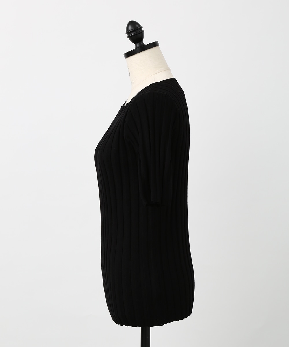縦ラインを強調するワイドリブが特徴のプルオーバー。襟ぐりは極力シンプルなデザインに仕上げ、デコルテが美しく見えるようにしています。スカート合わせの1枚着にもちろん、ジャケットやシャツのインナーとして重ね着したスタイリングもおすすめです。