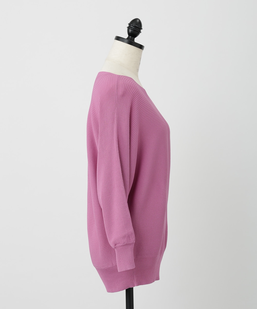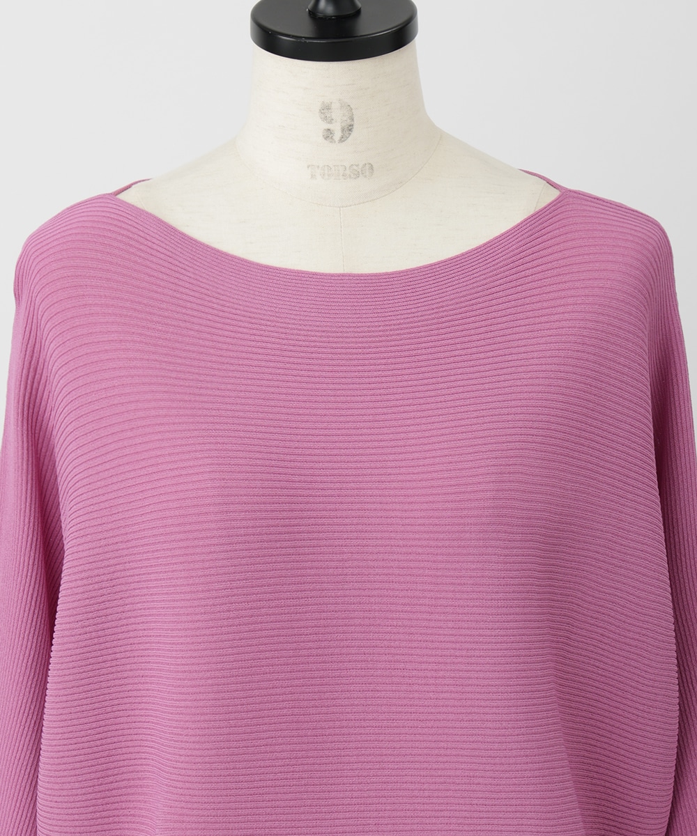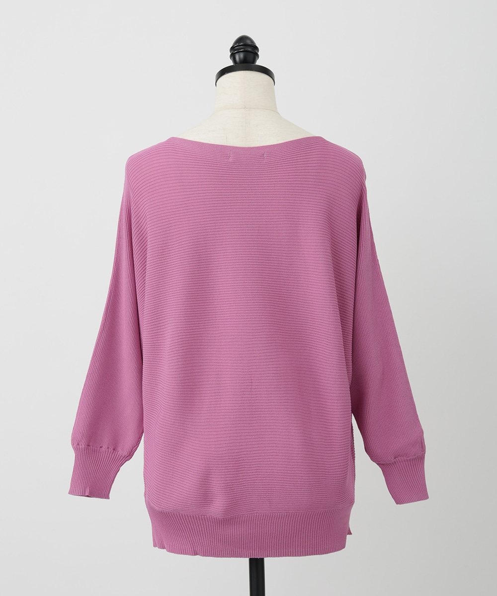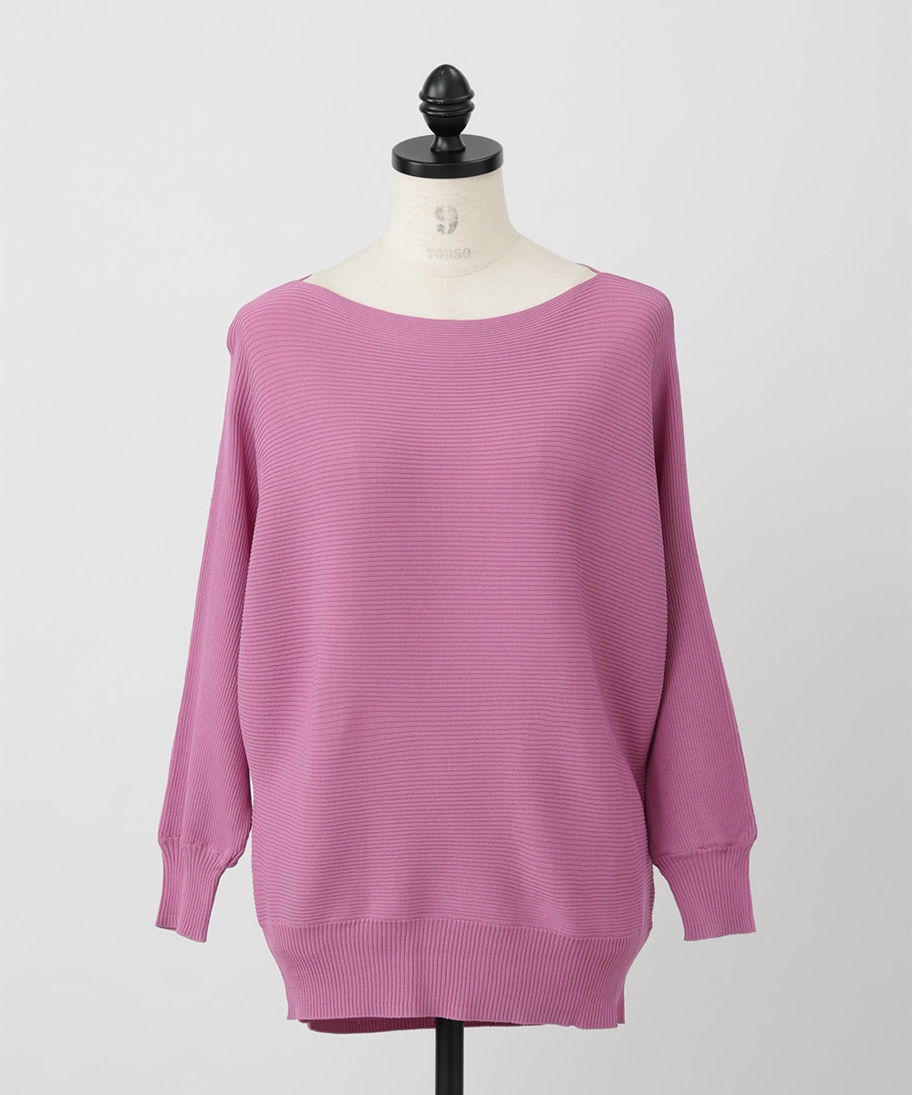 横方向に畝が走るリブ編みで、表情のある風合いに仕上げたドルマンニット。首元はボートネックになっており、すっきりとしたネックラインを演出します。やや短めの袖丈が程よい抜け感をプラス。スカートやパンツなど、合わせるボトムスによって印象の変化を楽しめるアイテムです。