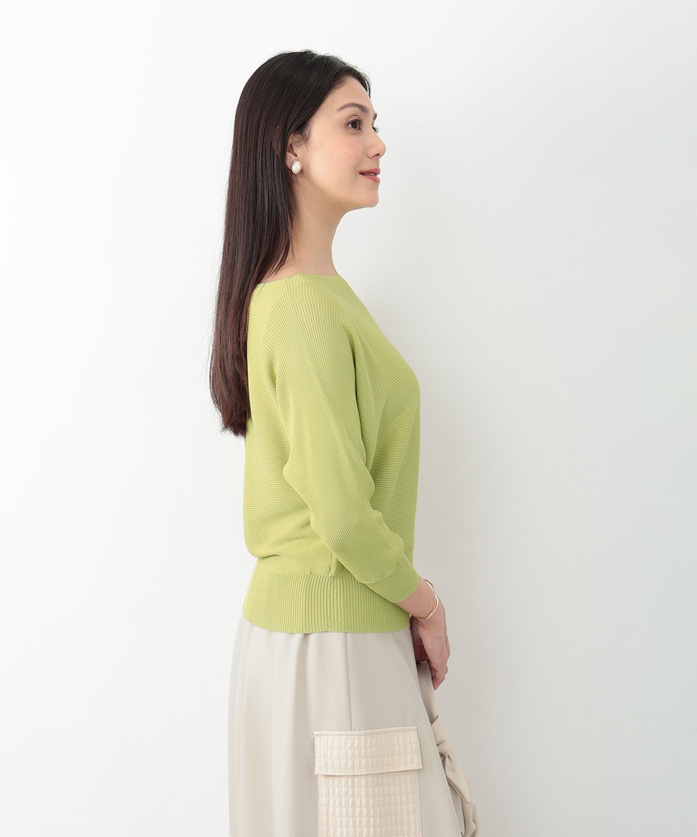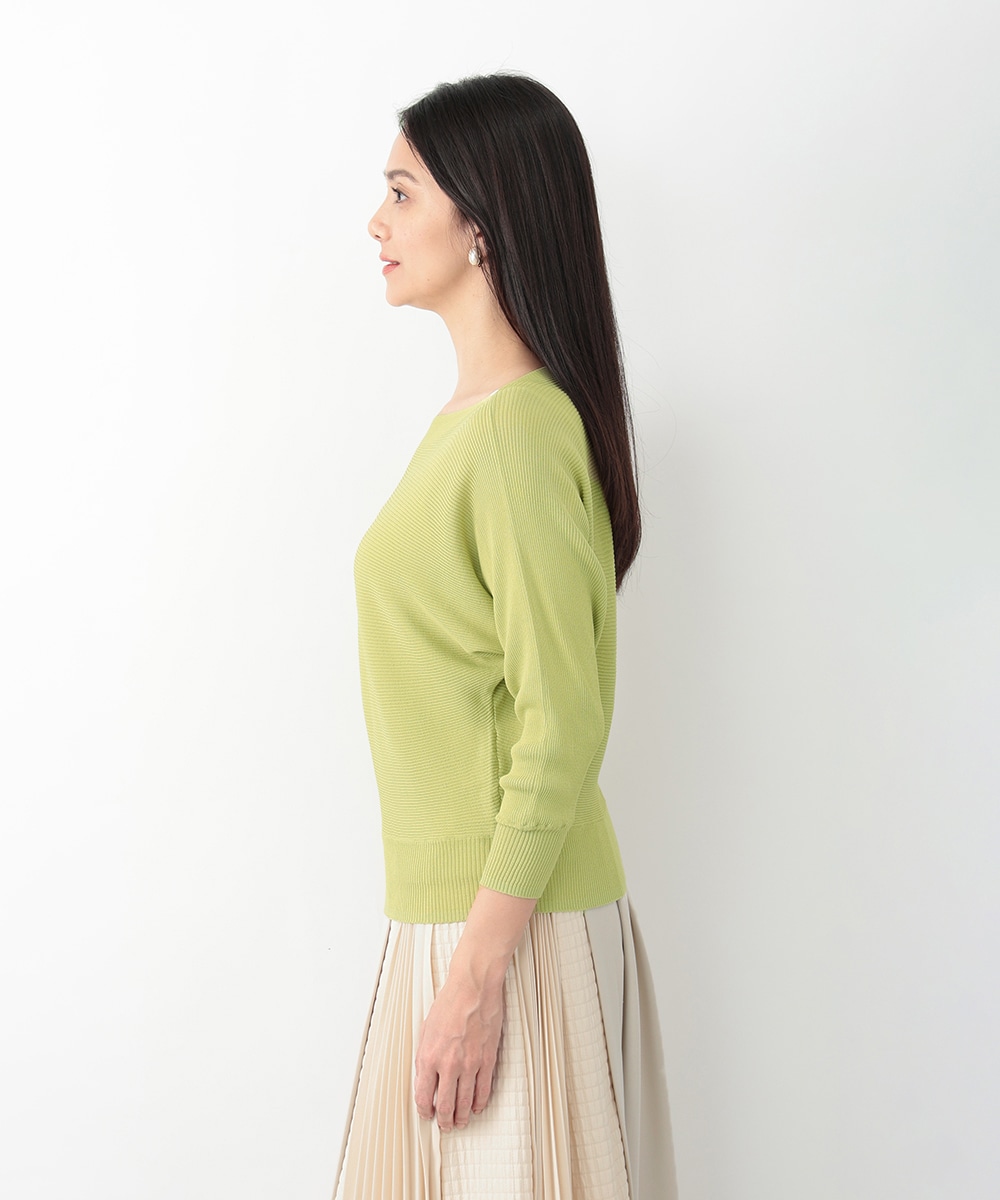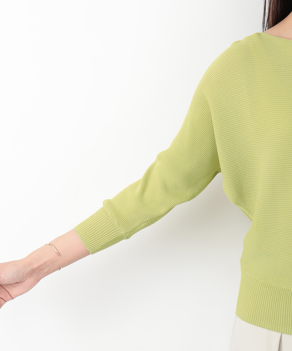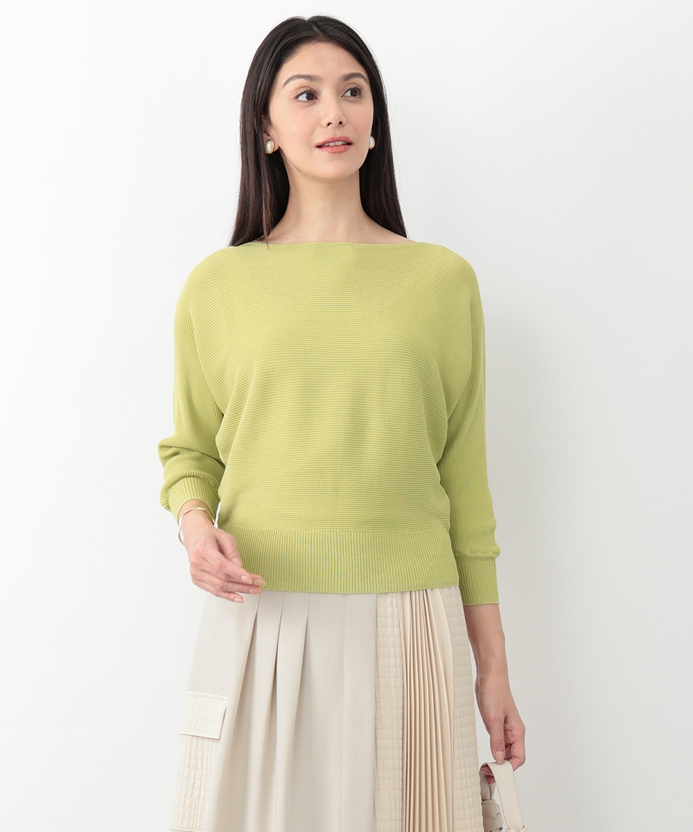 横方向に畝が走るリブ編みで、表情のある風合いに仕上げたドルマンニット。首元はボートネックになっており、すっきりとしたネックラインを演出します。やや短めの袖丈が程よい抜け感をプラス。スカートやパンツなど、合わせるボトムスによって印象の変化を楽しめるアイテムです。
