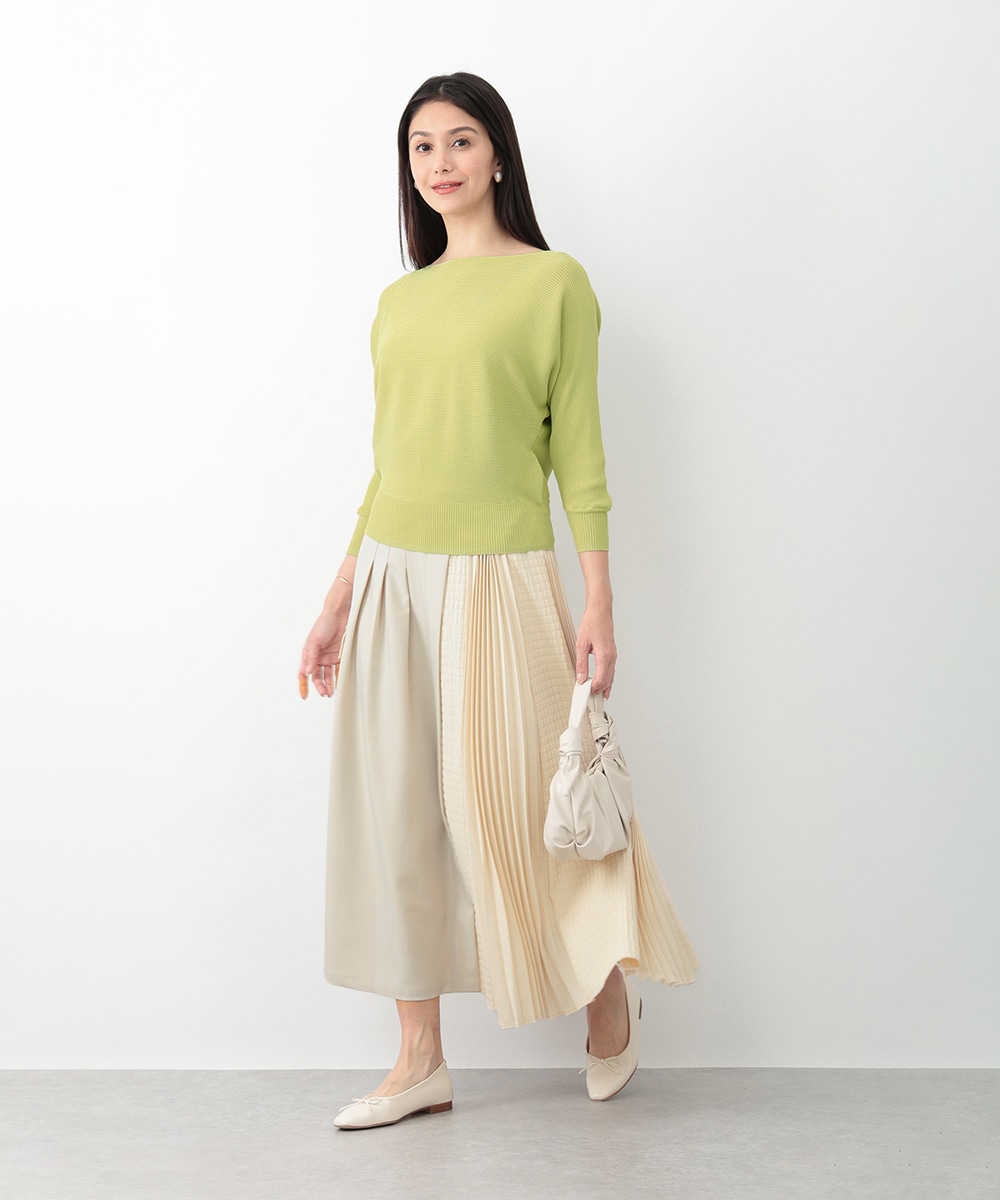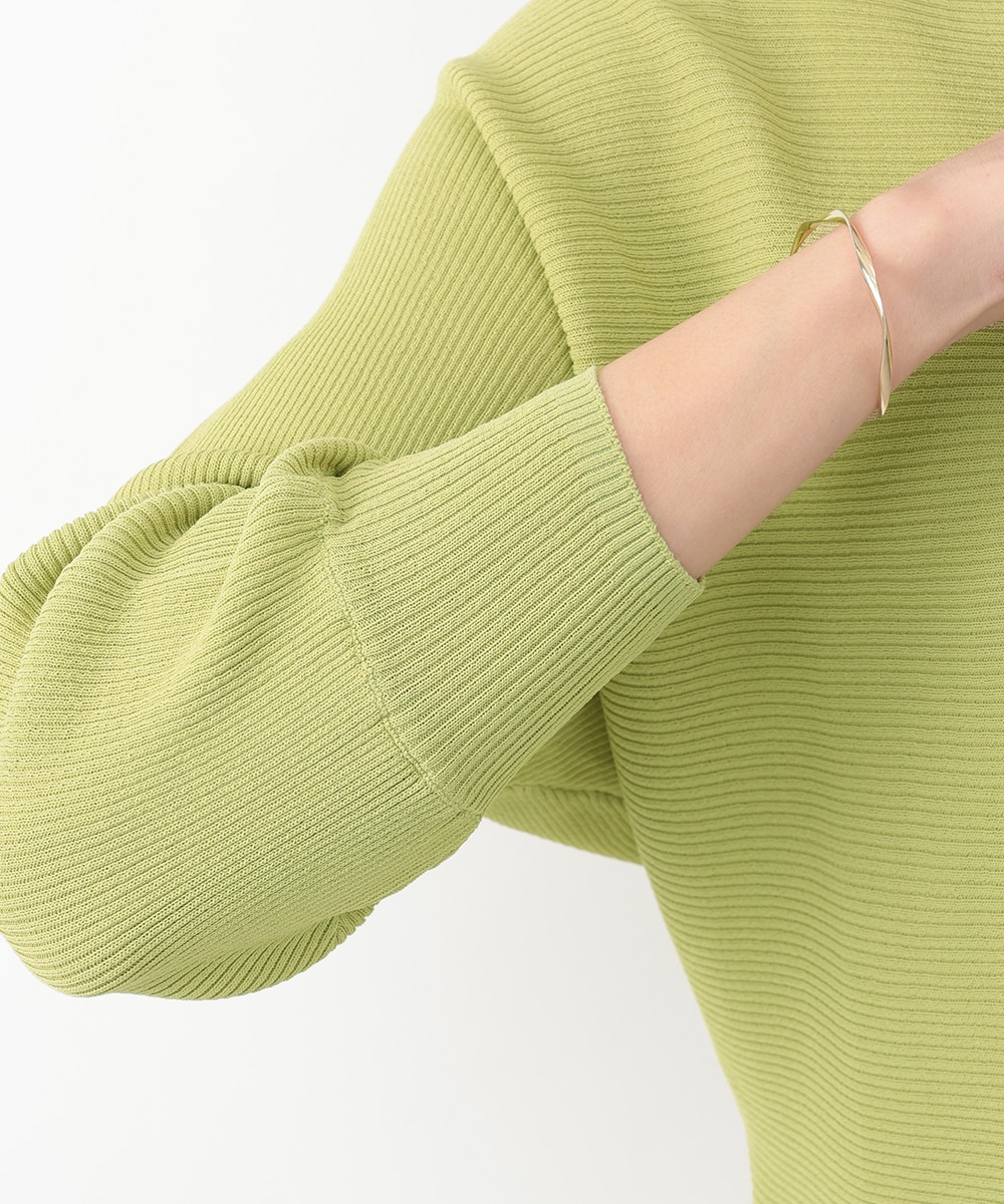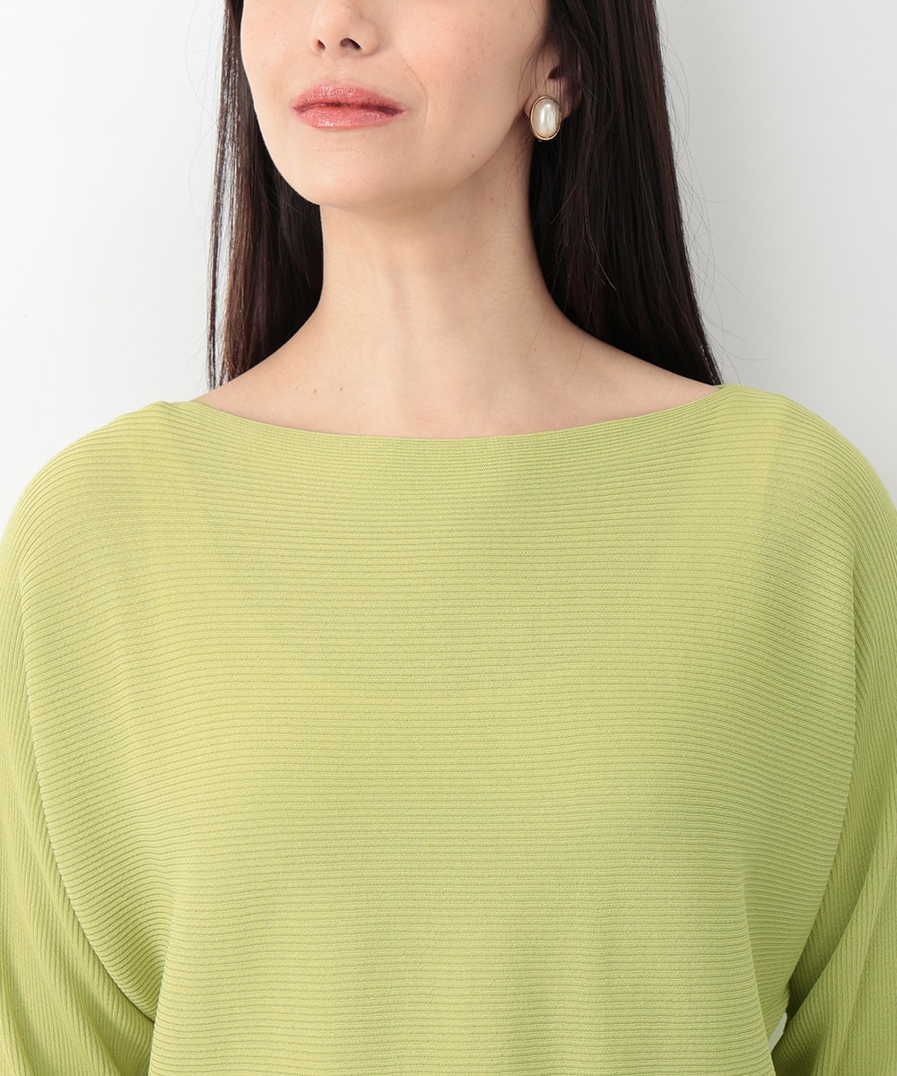 横方向に畝が走るリブ編みで、表情のある風合いに仕上げたドルマンニット。首元はボートネックになっており、すっきりとしたネックラインを演出します。やや短めの袖丈が程よい抜け感をプラス。スカートやパンツなど、合わせるボトムスによって印象の変化を楽しめるアイテムです。