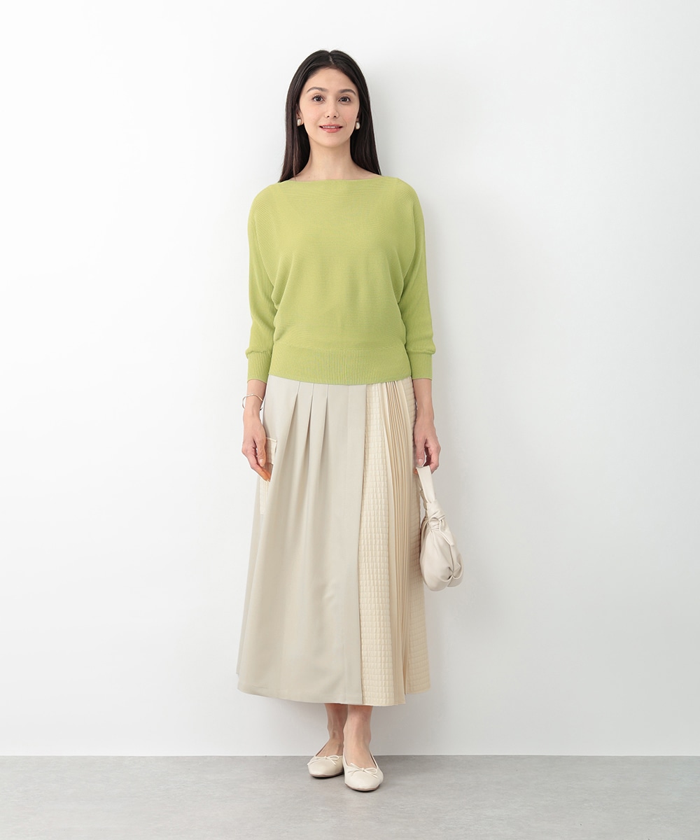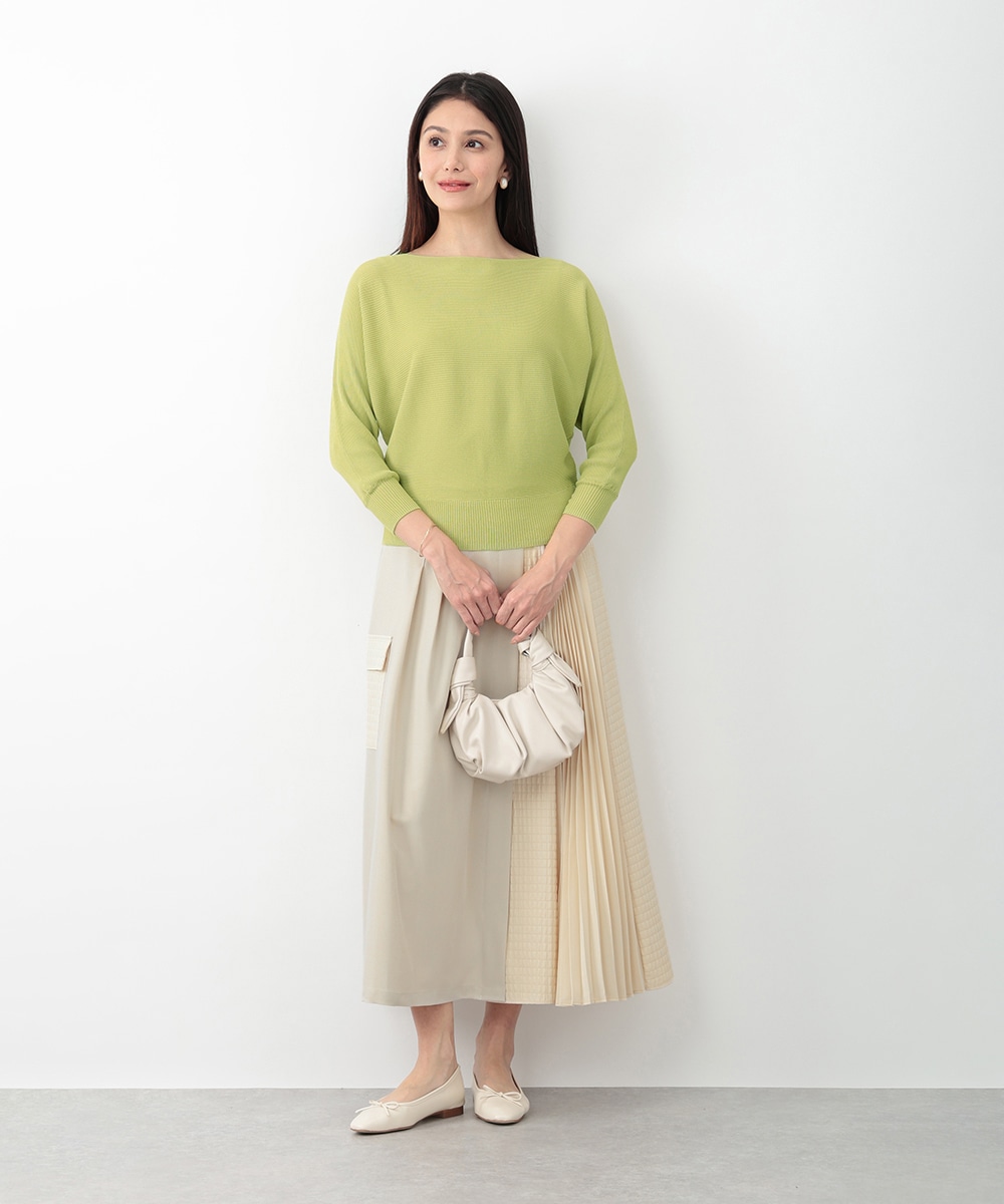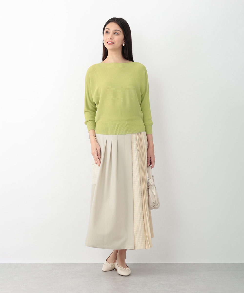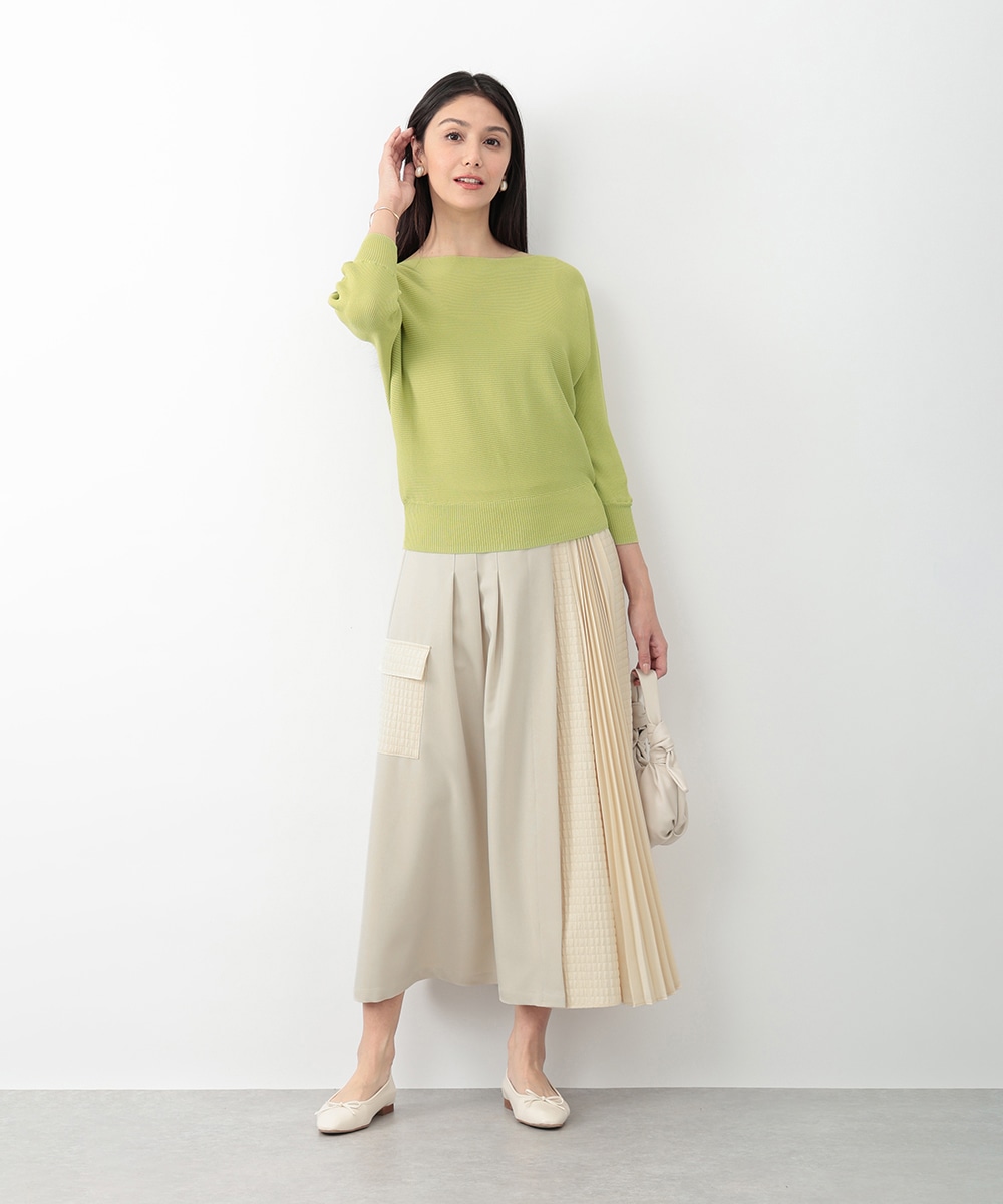 横方向に畝が走るリブ編みで、表情のある風合いに仕上げたドルマンニット。首元はボートネックになっており、すっきりとしたネックラインを演出します。やや短めの袖丈が程よい抜け感をプラス。スカートやパンツなど、合わせるボトムスによって印象の変化を楽しめるアイテムです。