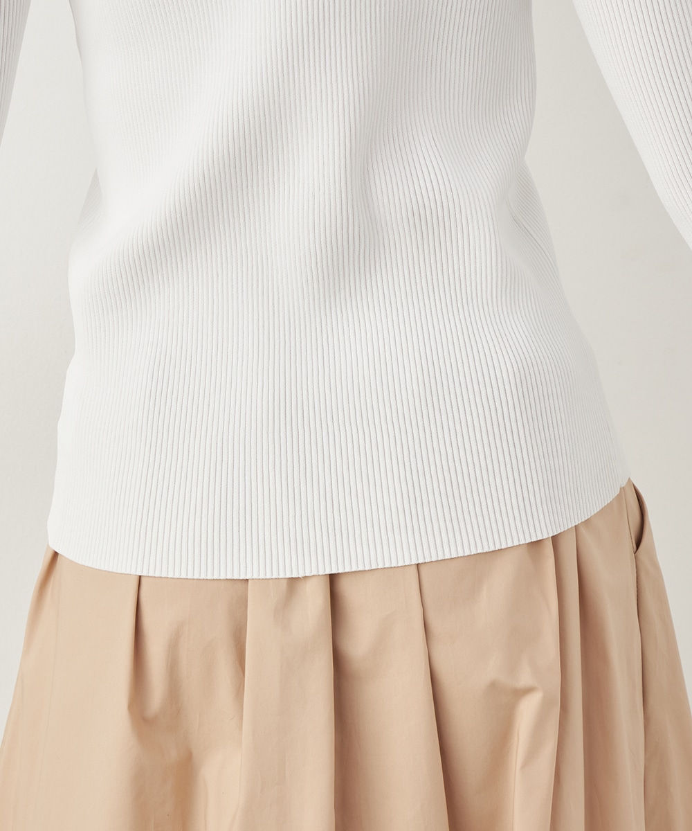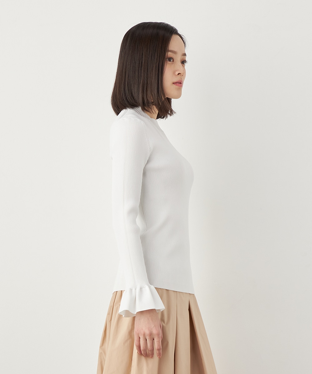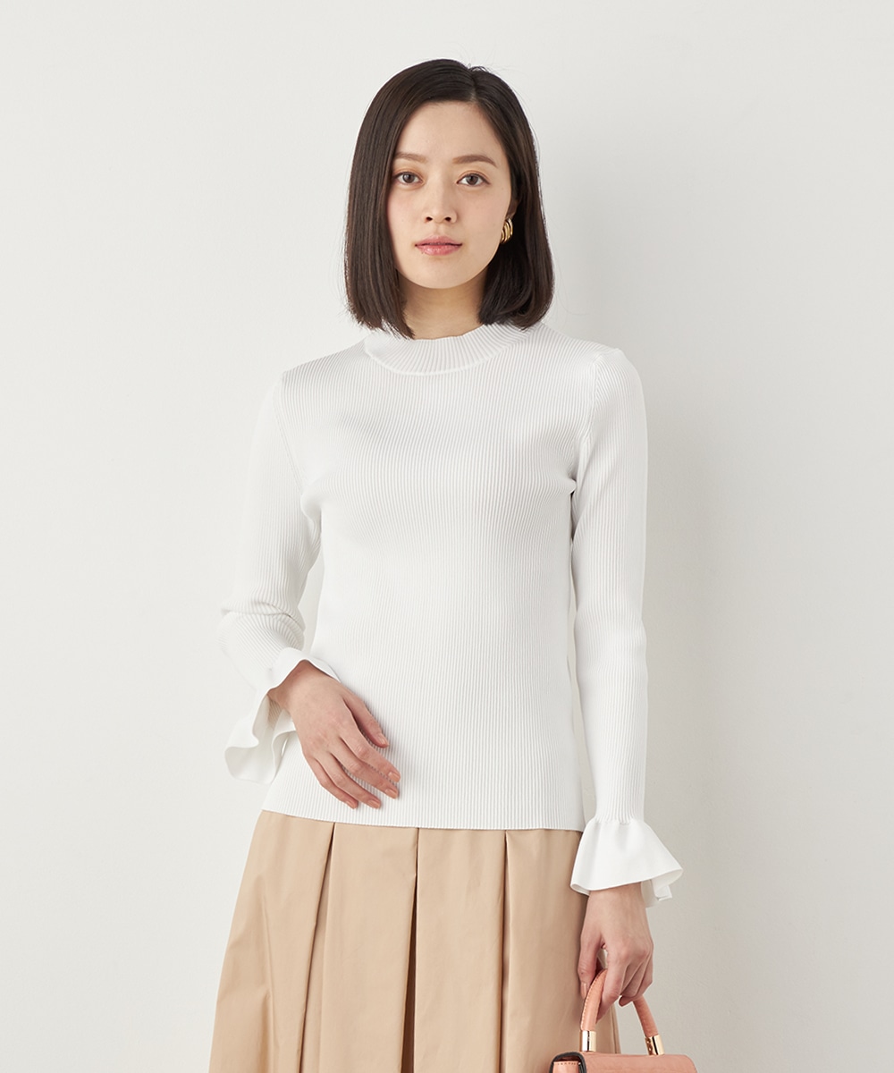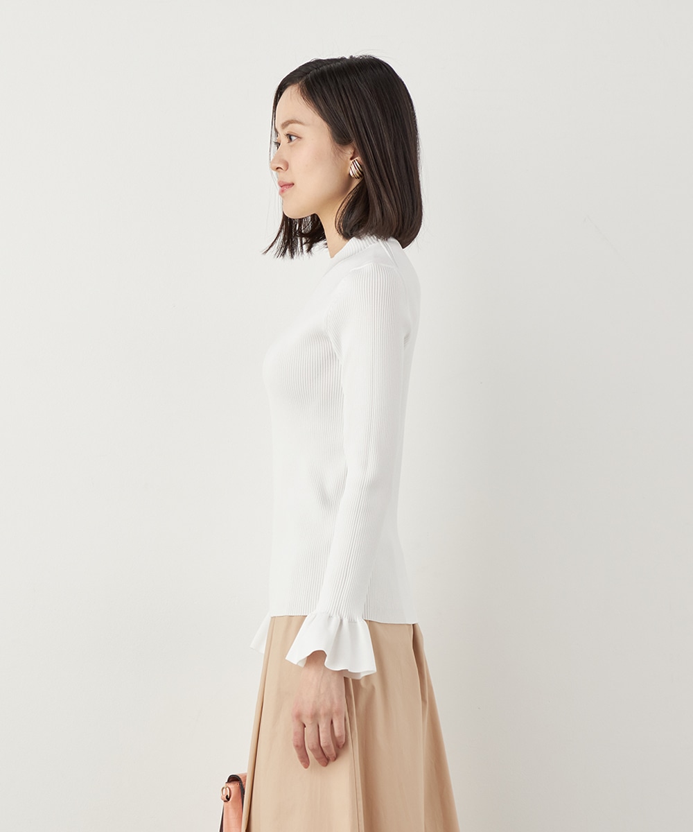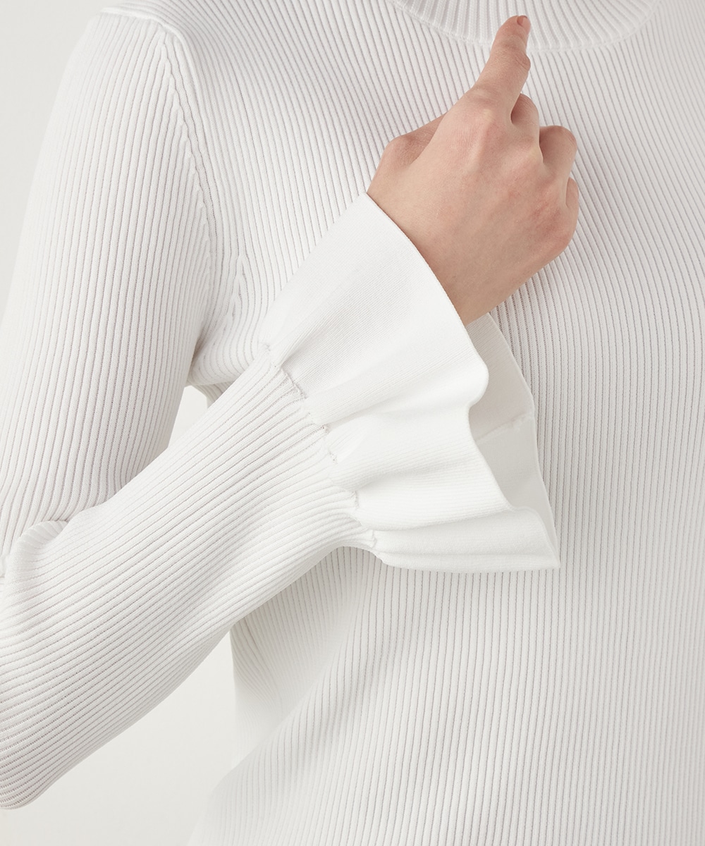 細リブ編みと細身のシルエットのすっきりとした印象に、フリルの存在感が際立ちます。大人っぽく上品に着こなせるハイネックを採用。単色使いでシンプルにまとまり、着こなしやすさも魅力のアイテムです。一枚着としてはもちろん、サロペットやコンビネゾンとも合わせられます。