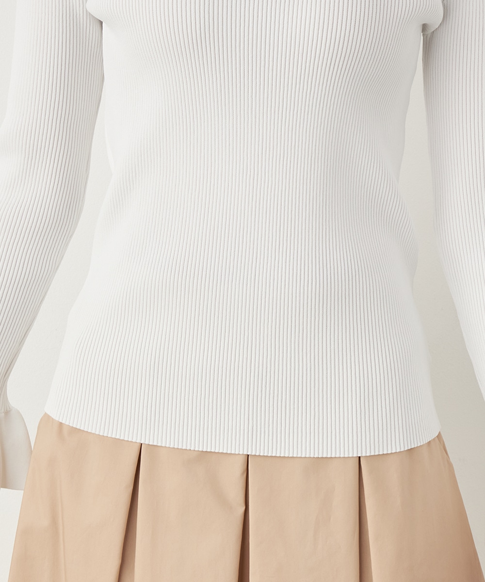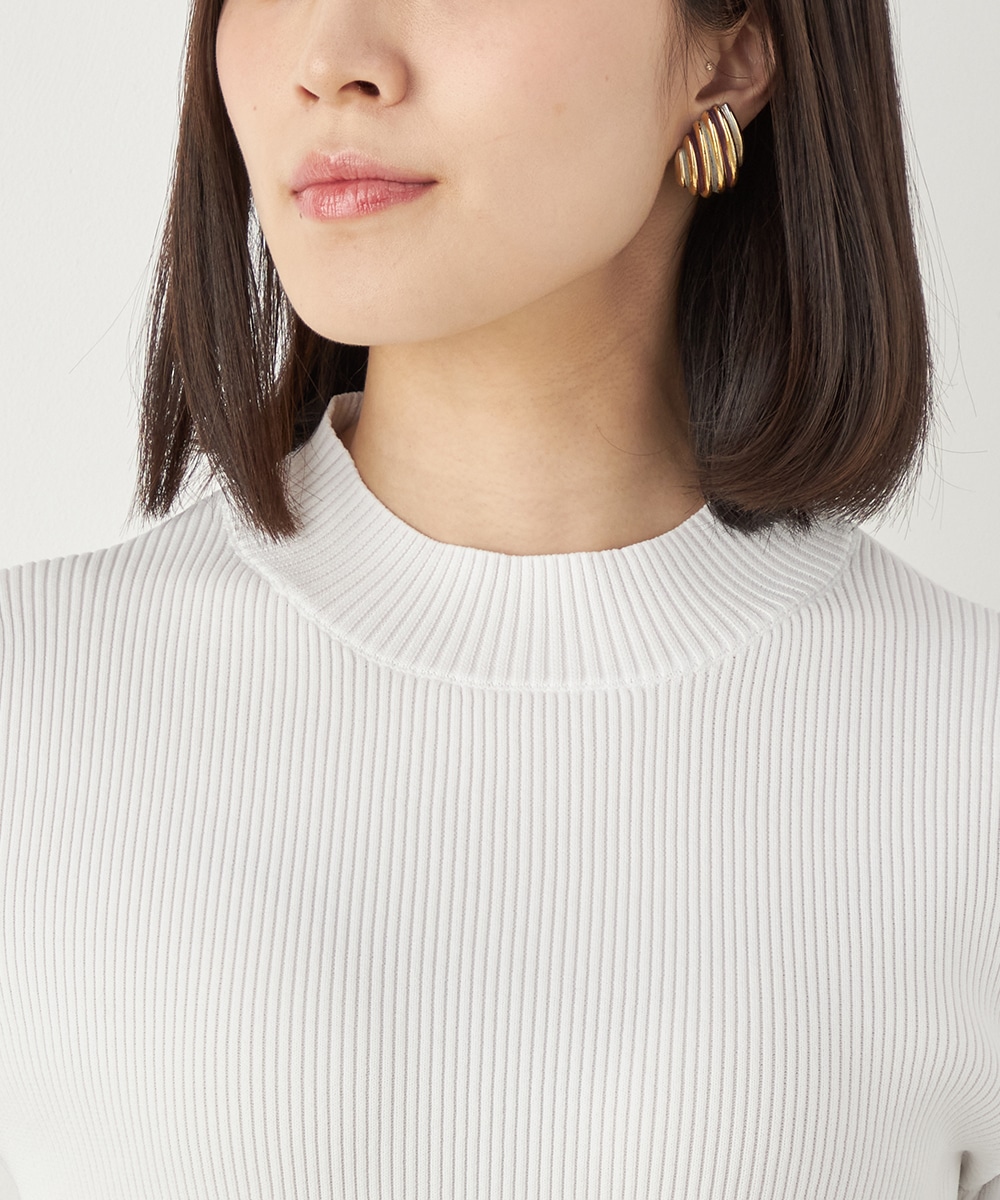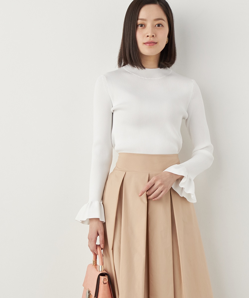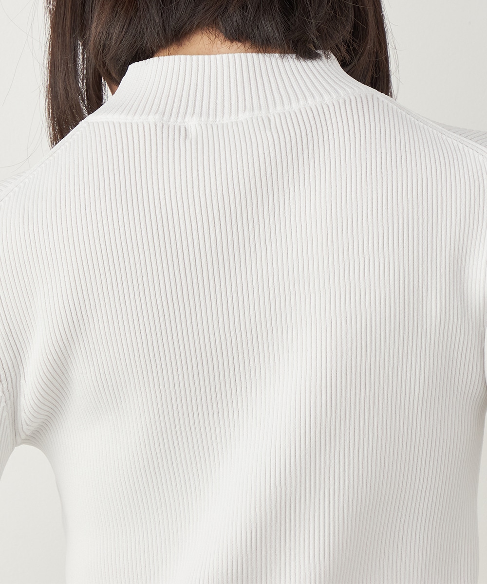 細リブ編みと細身のシルエットのすっきりとした印象に、フリルの存在感が際立ちます。大人っぽく上品に着こなせるハイネックを採用。単色使いでシンプルにまとまり、着こなしやすさも魅力のアイテムです。一枚着としてはもちろん、サロペットやコンビネゾンとも合わせられます。