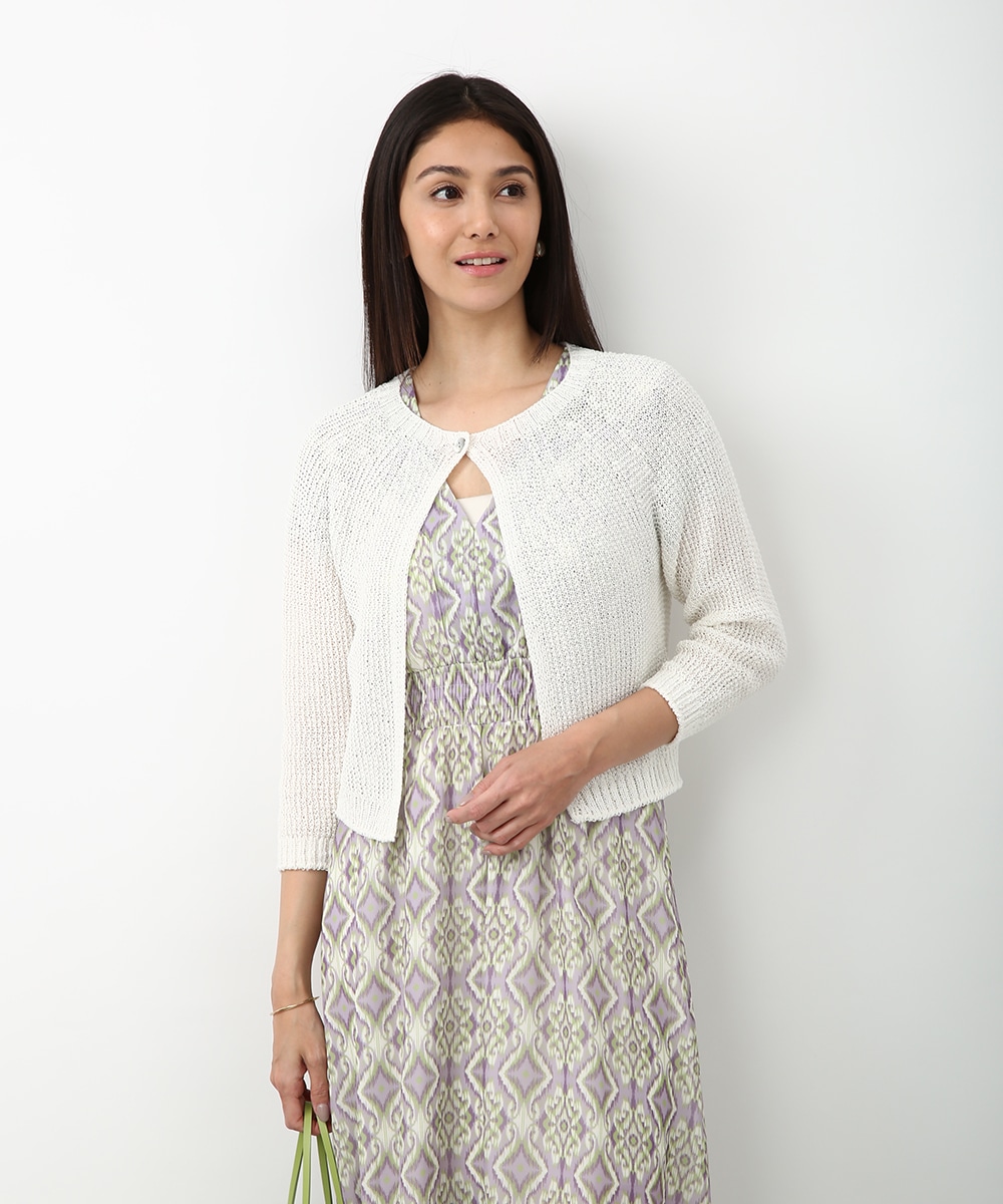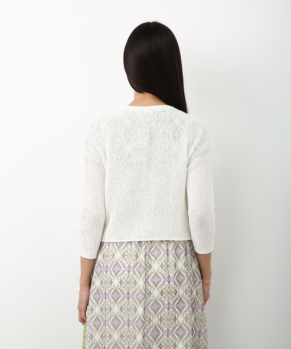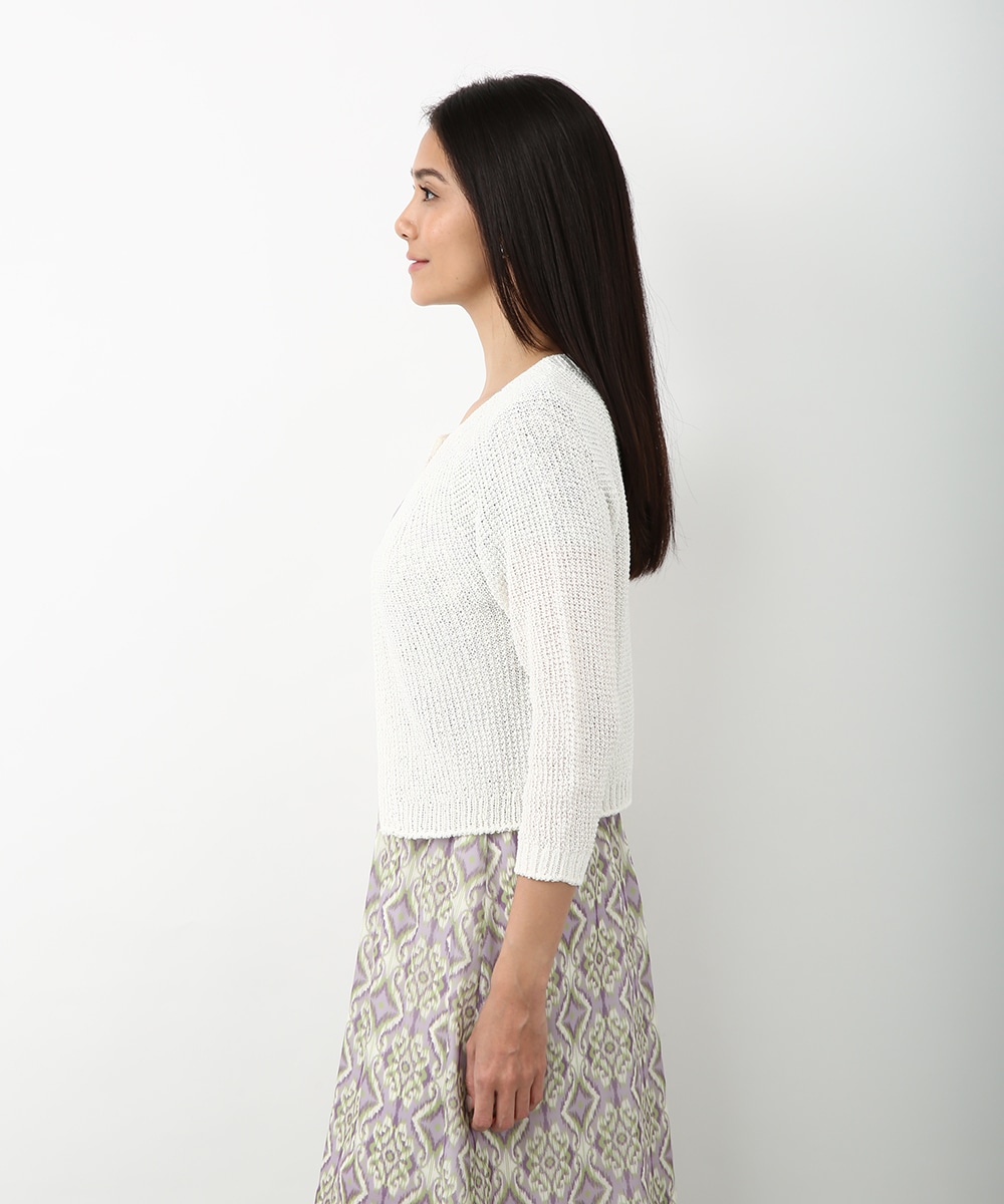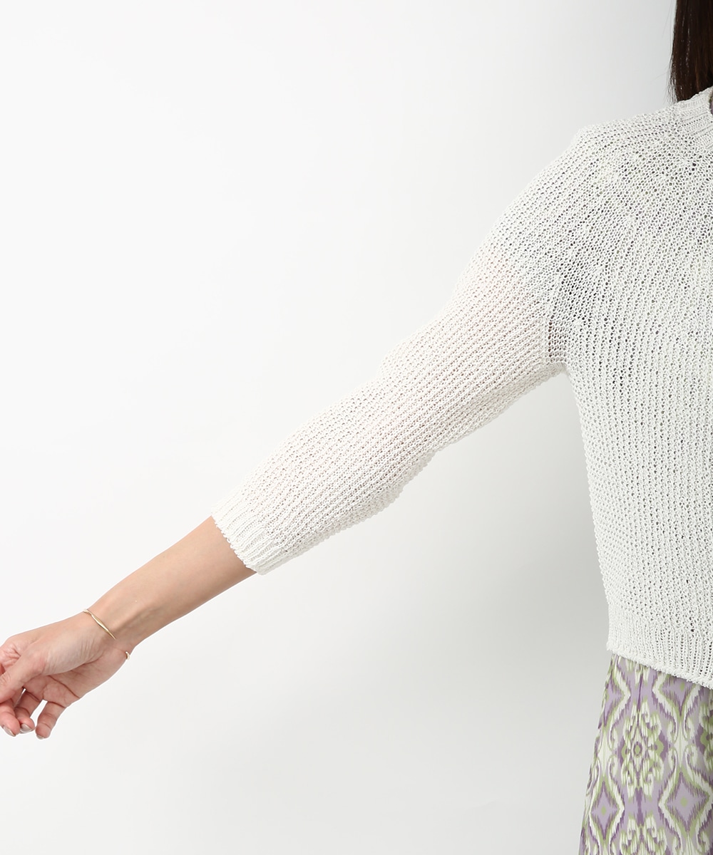 表情のある編み柄と立体的な風合いが魅力のホールガーメントボレロ。縫い目のない仕立てで肌あたりがやさしく、すっきりとしたシルエットで取り入れやすい一枚です。カミファインシリーズのツムギを使用。程よいざっくり感と、シェル釦、魚沼製の丁寧でやさしいモノづくりが伝わる一枚。スカート合わせでやわらかい印象を引き立てるスタイルもおすすめです。
