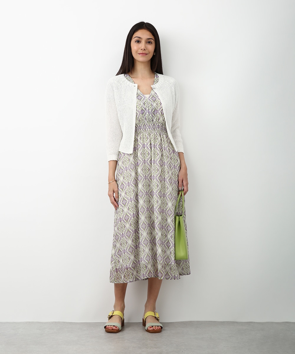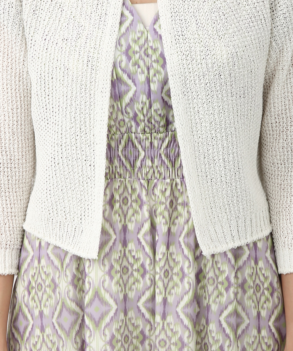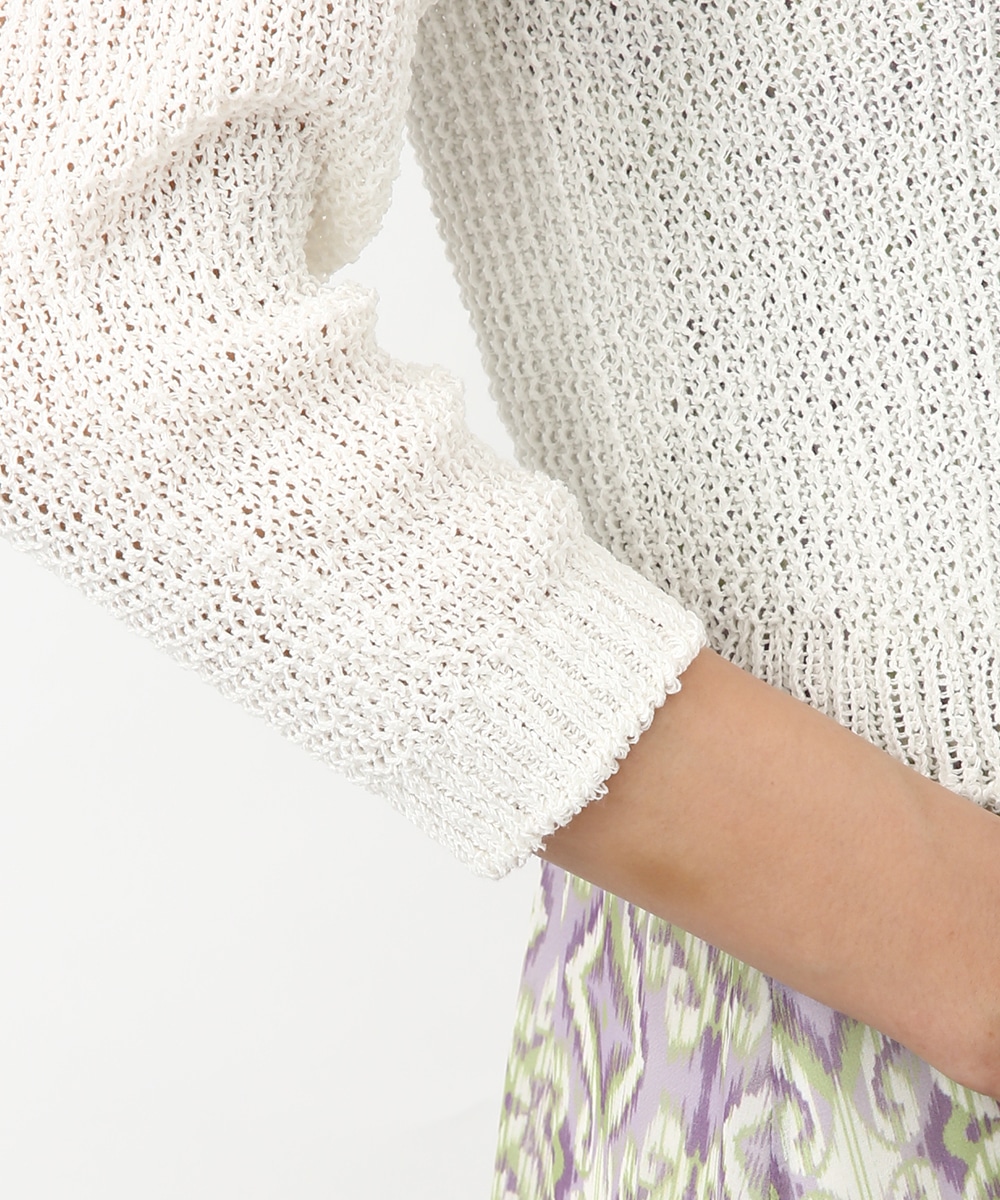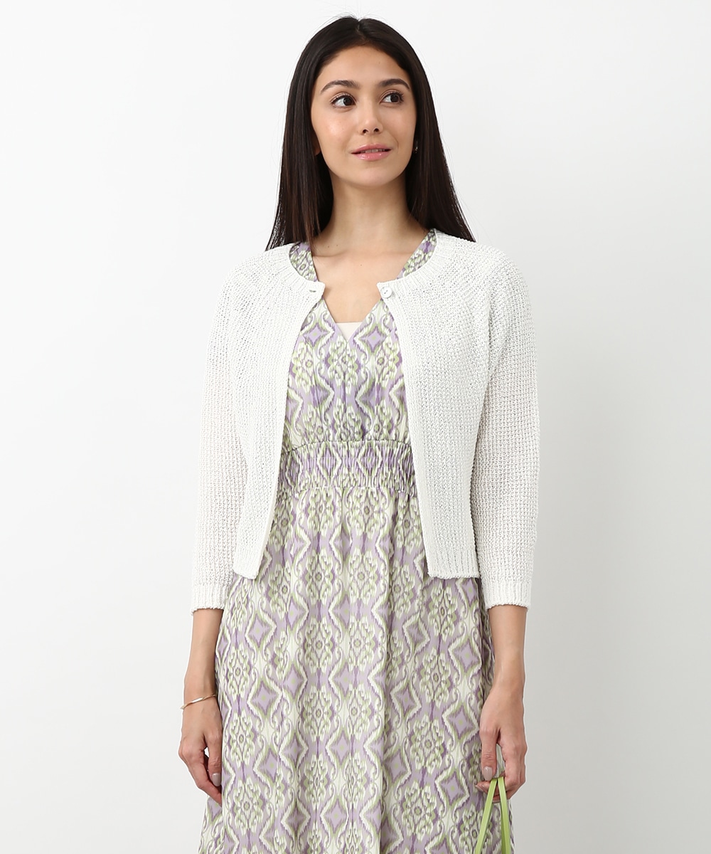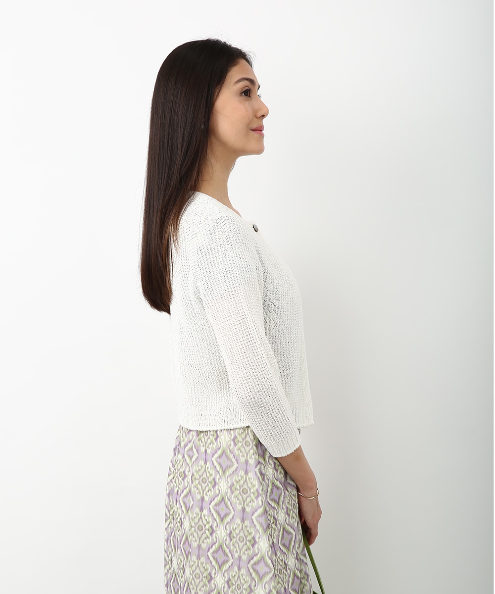 表情のある編み柄と立体的な風合いが魅力のホールガーメントボレロ。縫い目のない仕立てで肌あたりがやさしく、すっきりとしたシルエットで取り入れやすい一枚です。カミファインシリーズのツムギを使用。程よいざっくり感と、シェル釦、魚沼製の丁寧でやさしいモノづくりが伝わる一枚。スカート合わせでやわらかい印象を引き立てるスタイルもおすすめです。