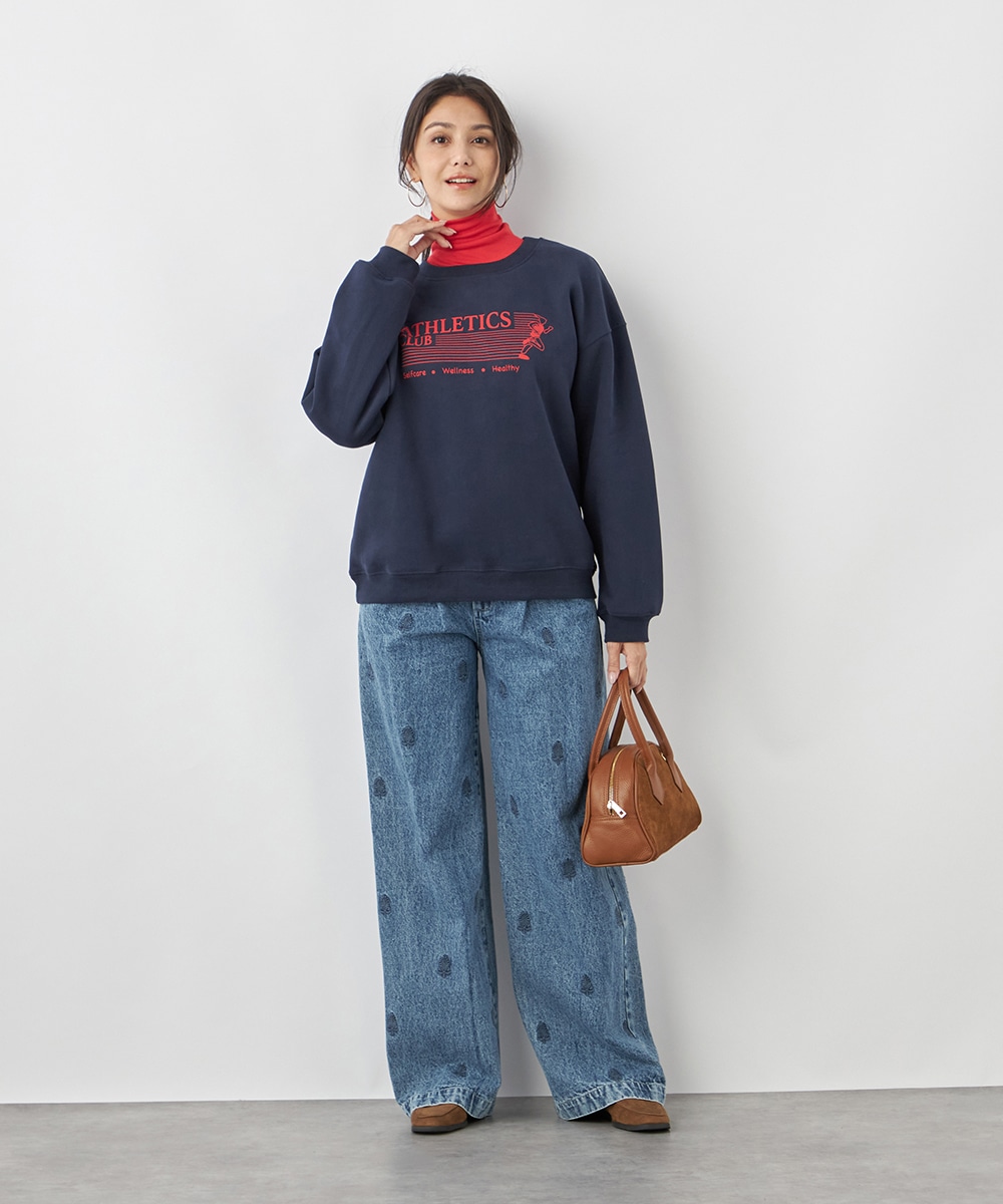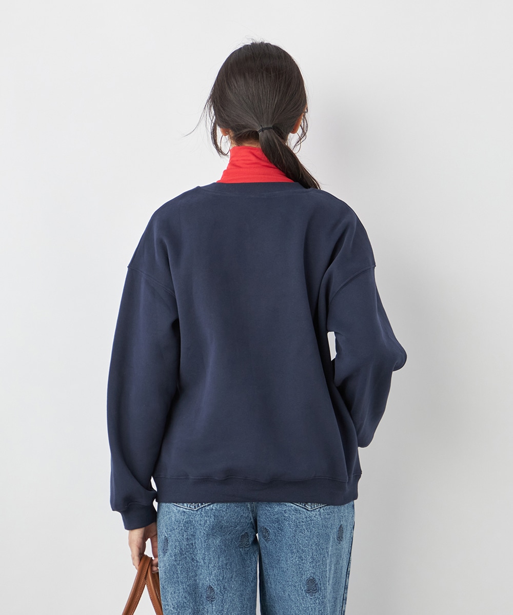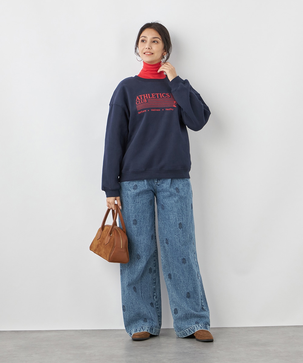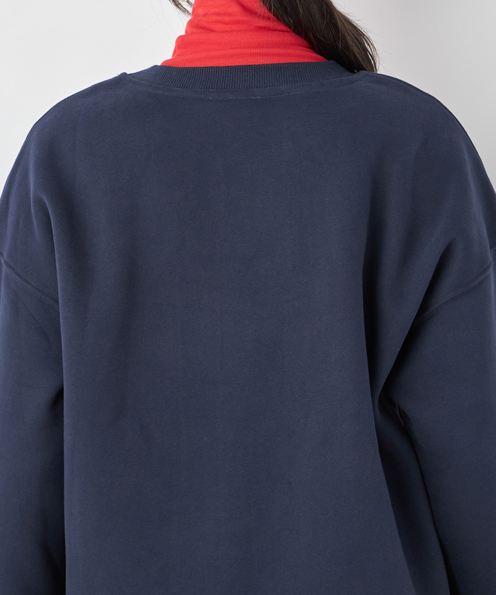 ネイビー×レッドの配色が、フェミニンさや上品さをプラスします。ドロップショルダーとゆったりとしたサイズ感で、大人が着こなしやすいように仕上げているのもポイントです。着丈は長すぎず、ルーズに傾くことなくすっきりとまとまり、パンツともスカートとも合わせられます。