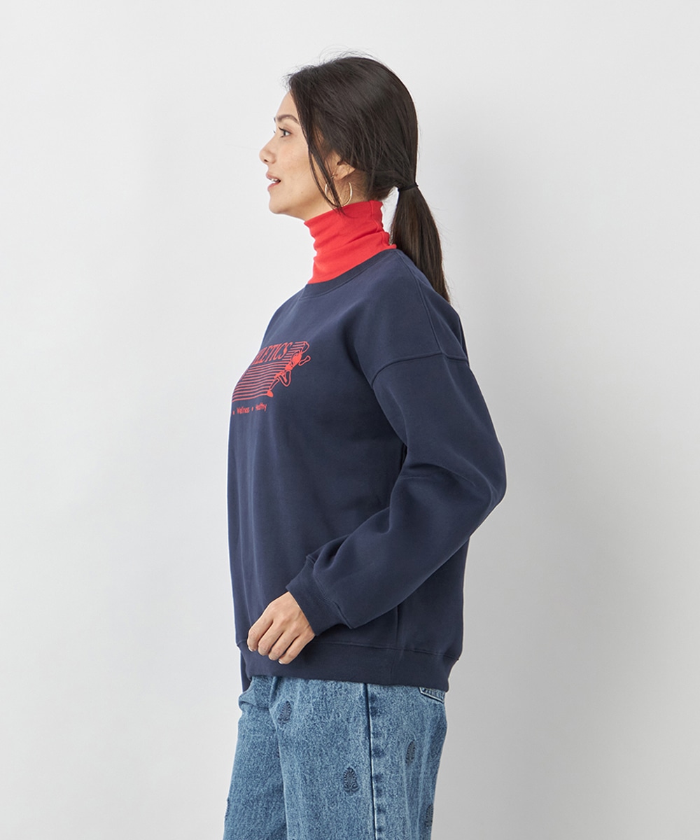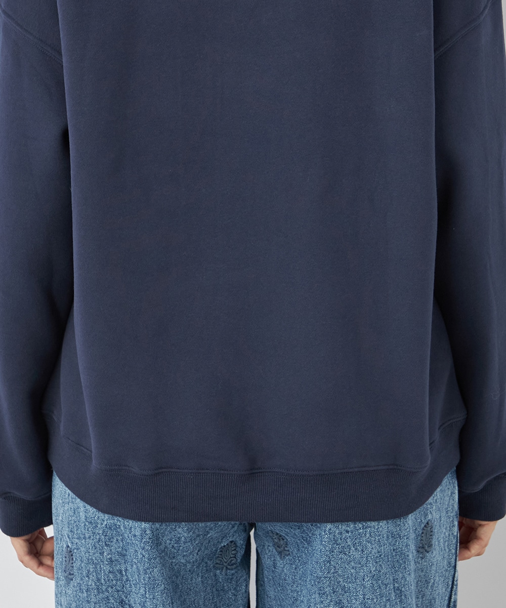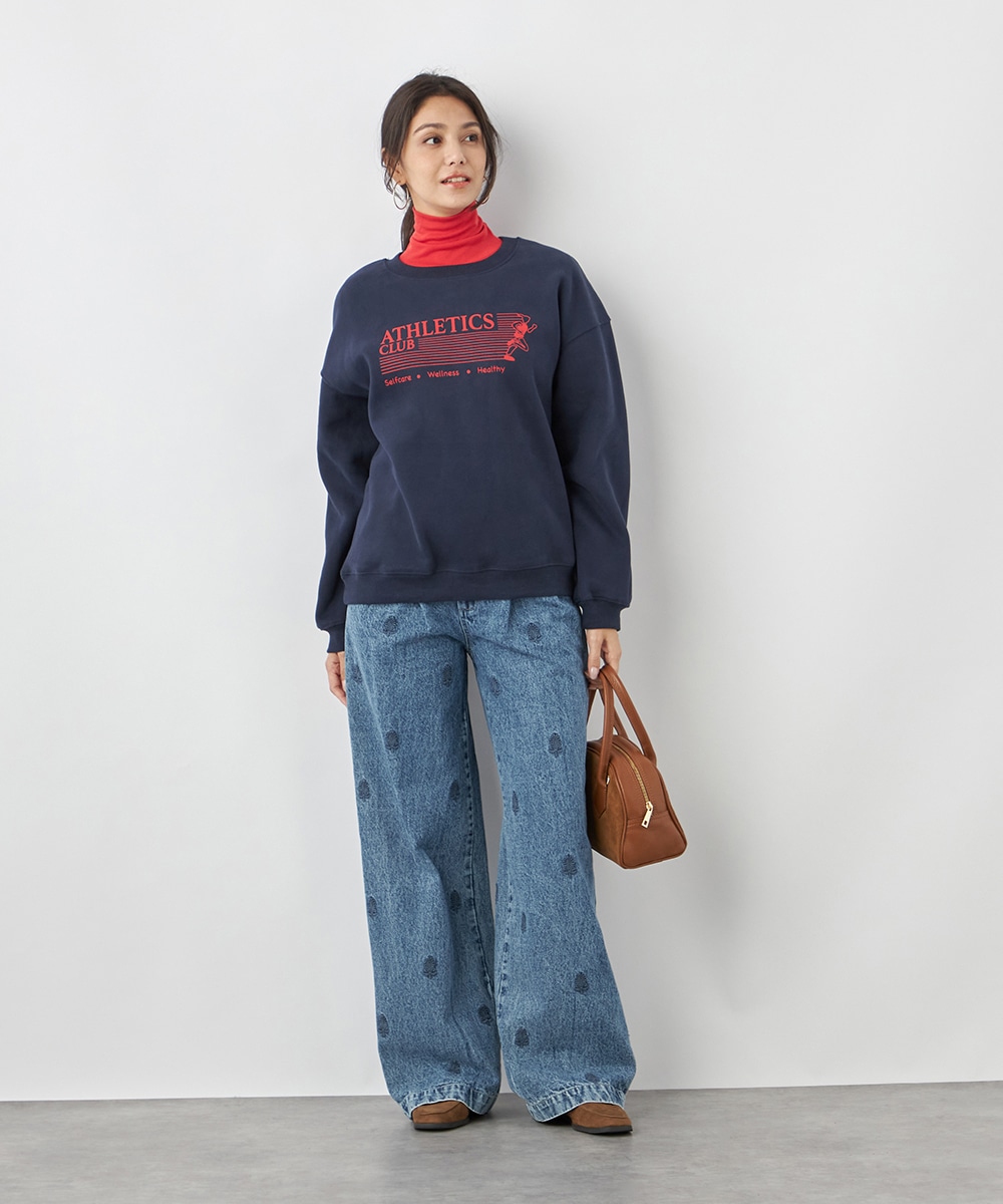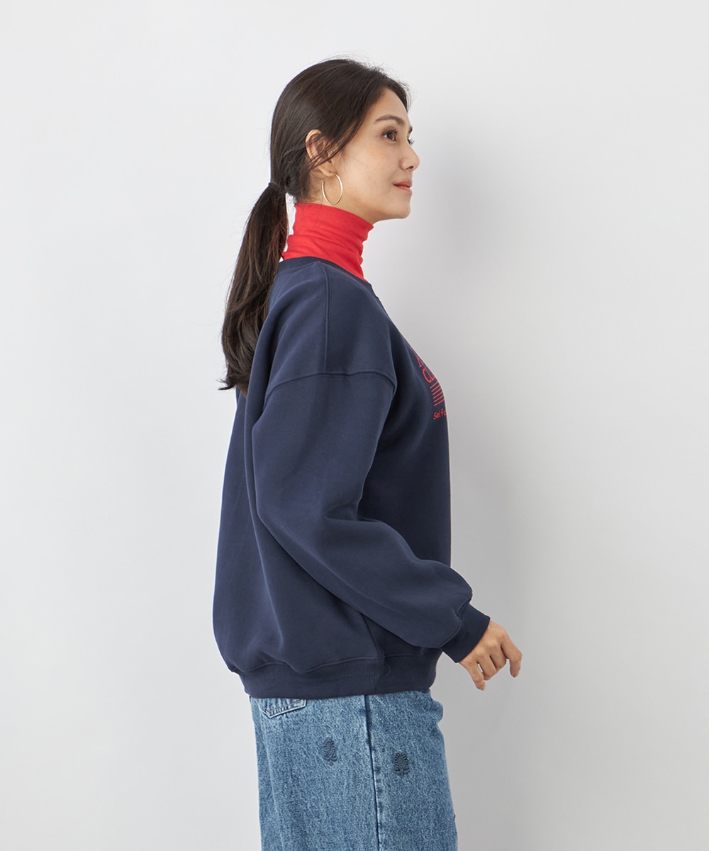 ネイビー×レッドの配色が、フェミニンさや上品さをプラスします。ドロップショルダーとゆったりとしたサイズ感で、大人が着こなしやすいように仕上げているのもポイントです。着丈は長すぎず、ルーズに傾くことなくすっきりとまとまり、パンツともスカートとも合わせられます。