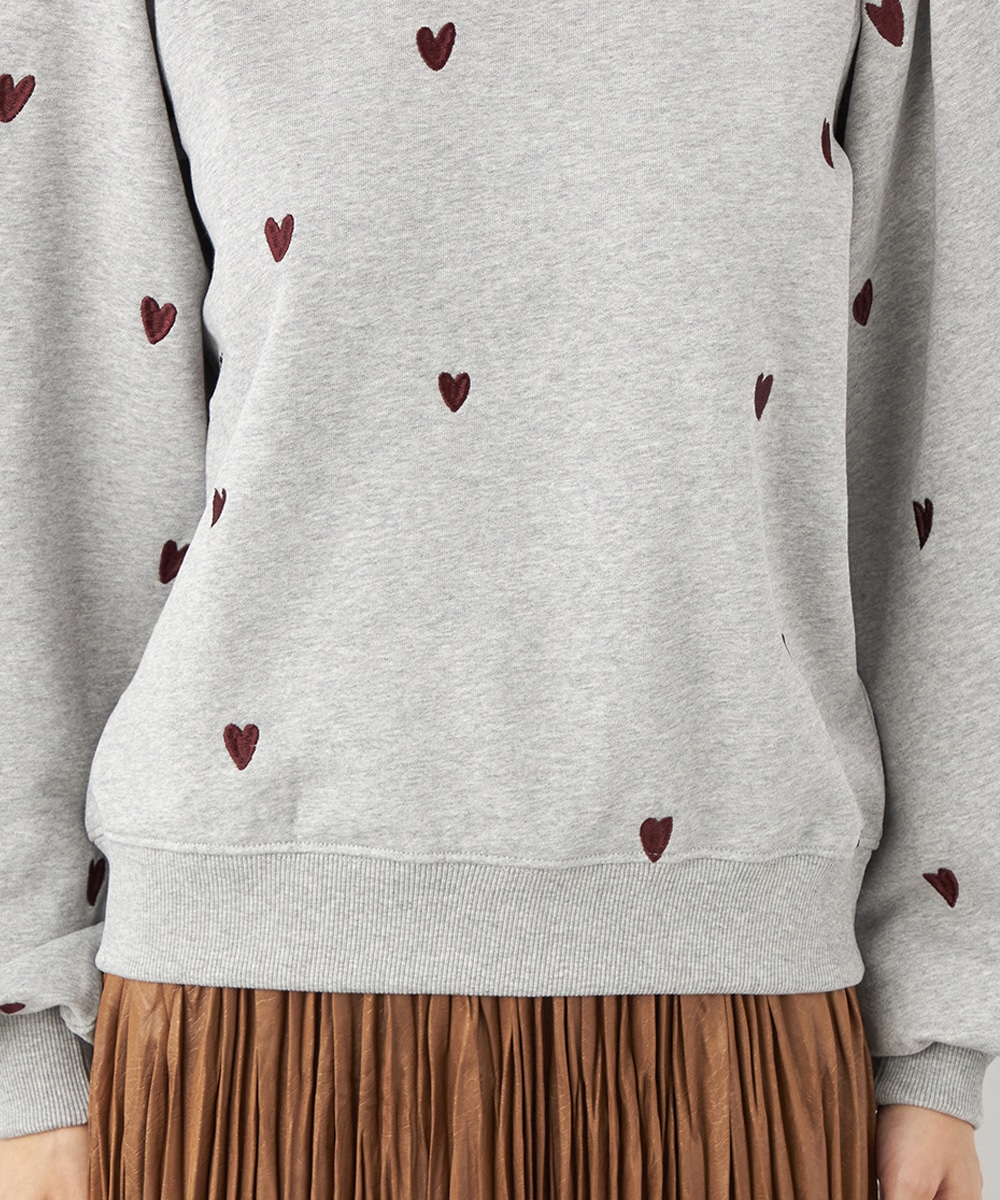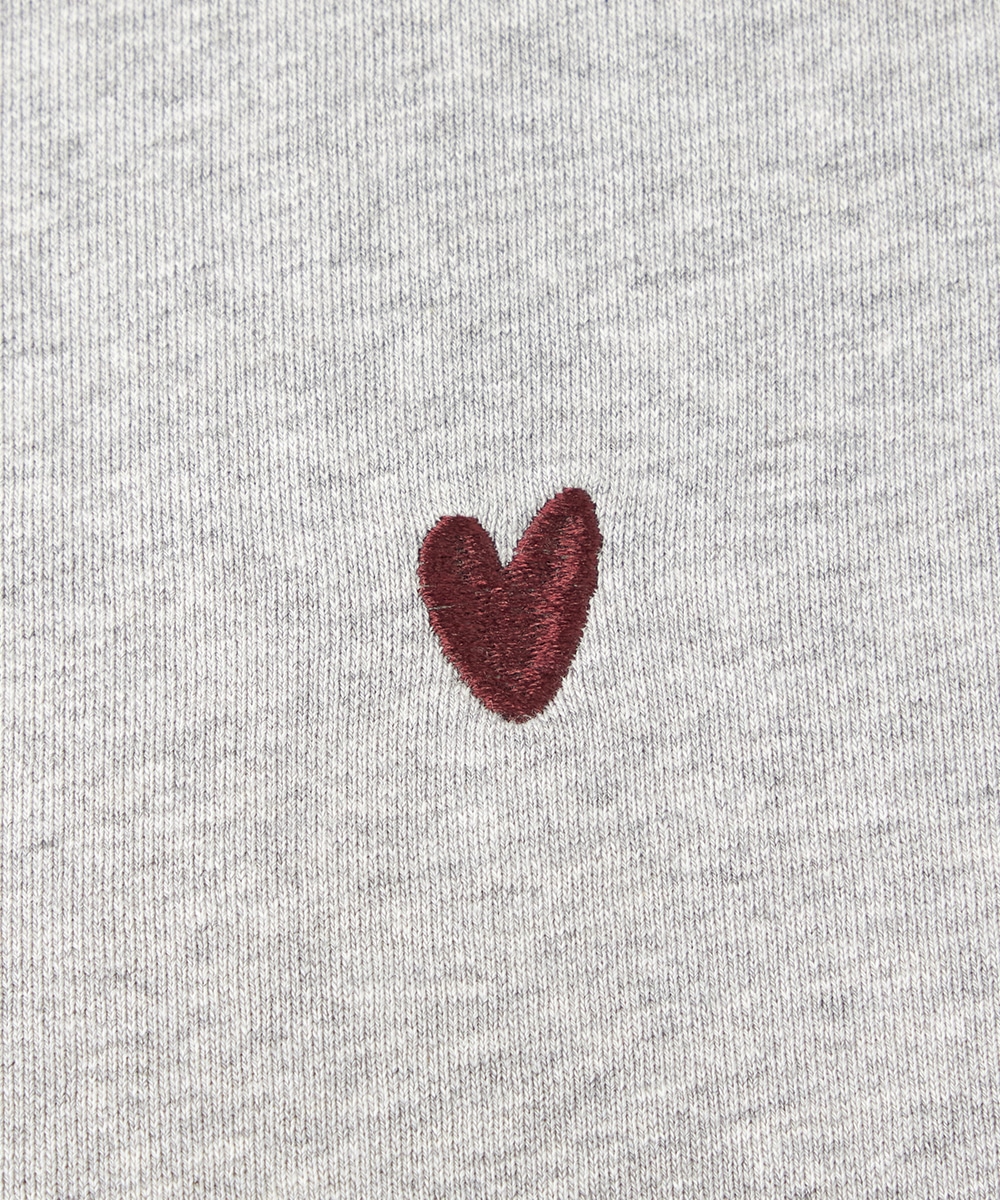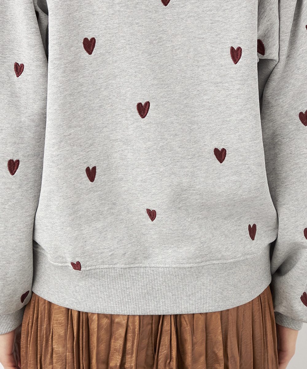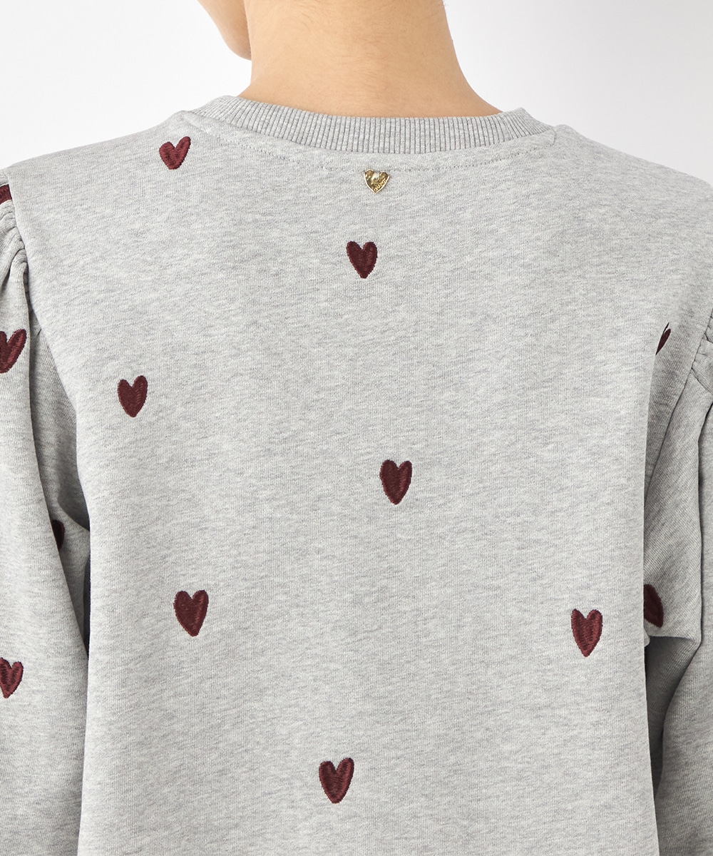 全体にバランス良くハート刺繍を散りばめています。着丈は短めでコンパクトな印象のシルエットにまとめており、今年のトレンドにもぴったりです。バックネックにはゴールドカラーのモチーフを飾っています。カジュアルとガーリー感のバランスが良く、幅広いアレンジを楽しめるデザインです。
