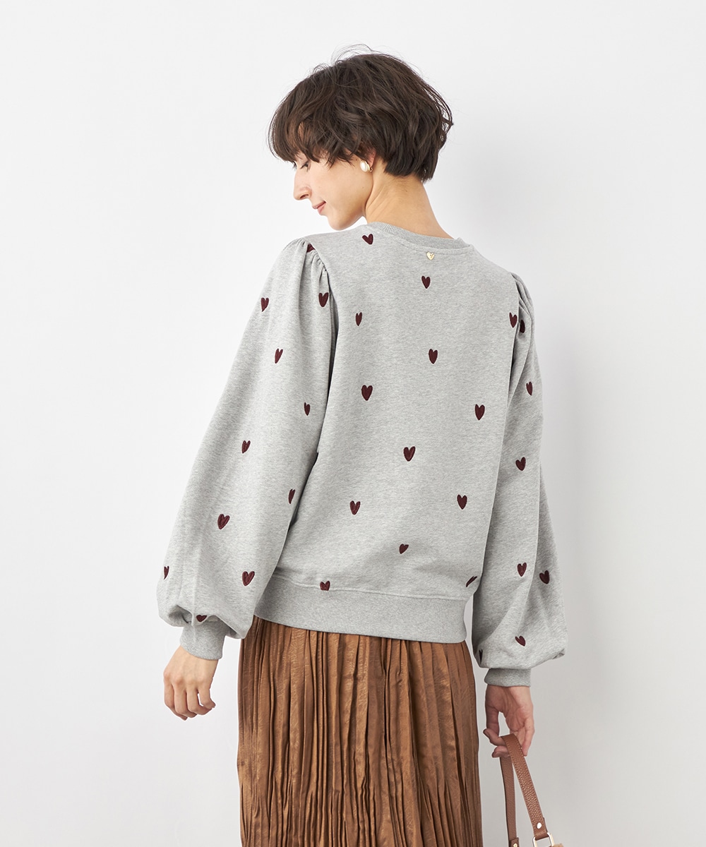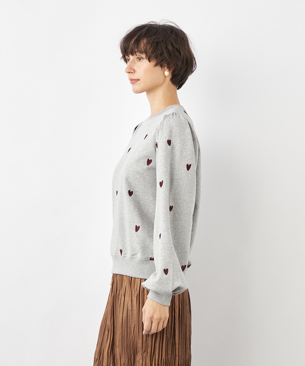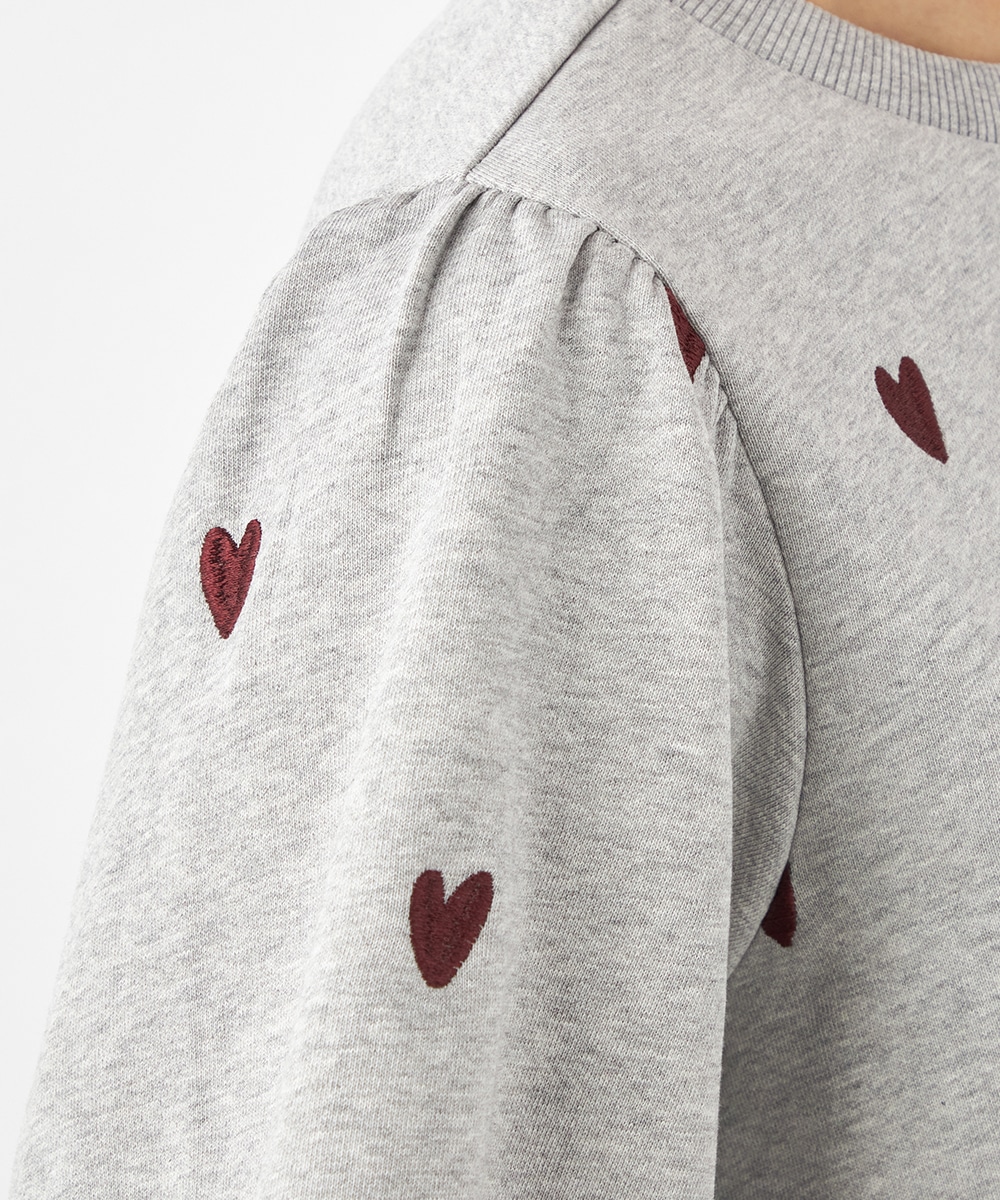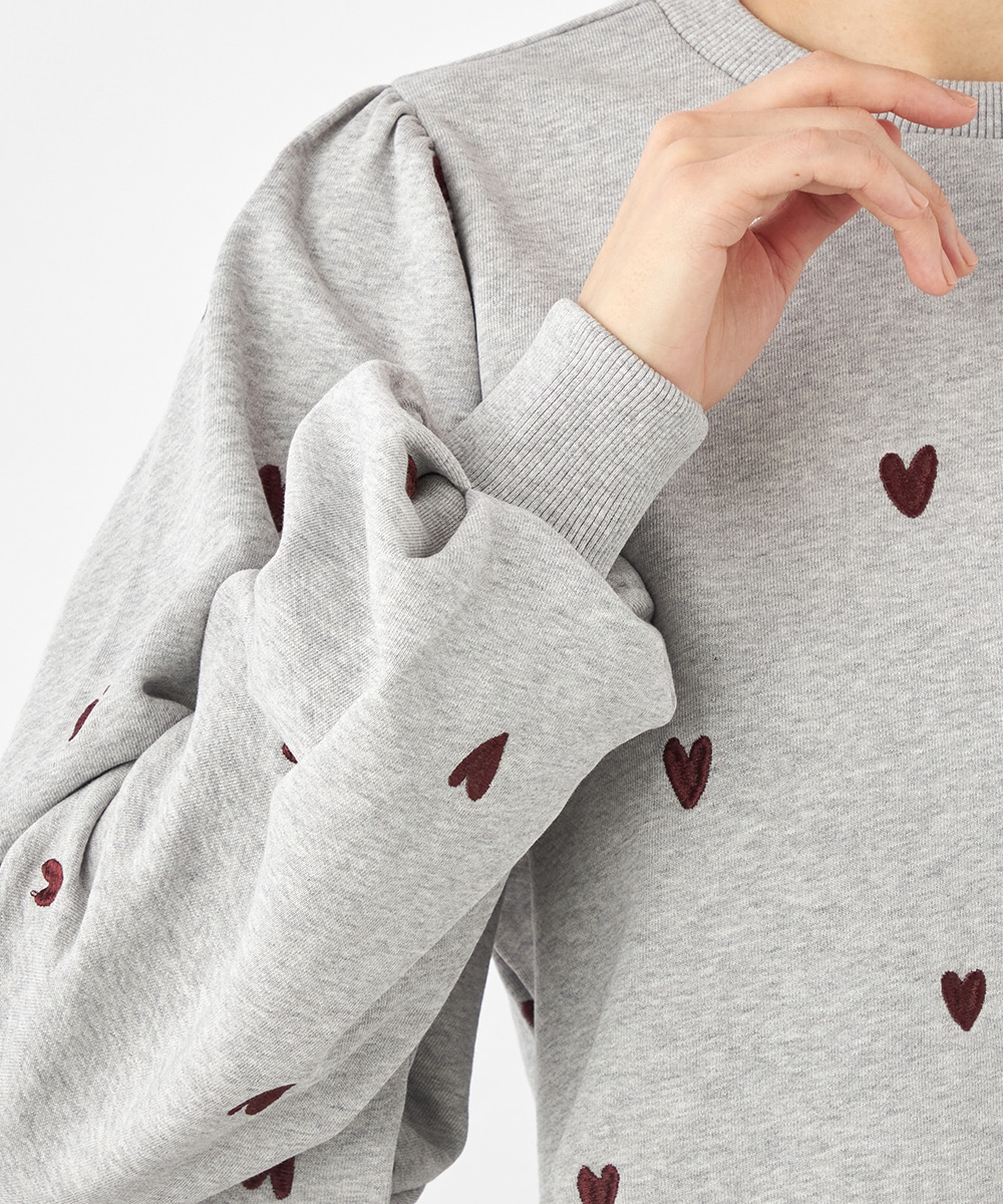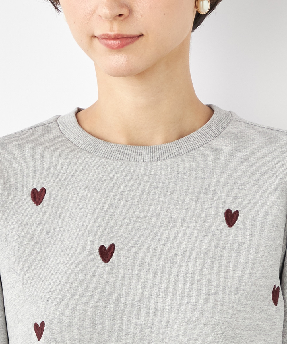 全体にバランス良くハート刺繍を散りばめています。着丈は短めでコンパクトな印象のシルエットにまとめており、今年のトレンドにもぴったりです。バックネックにはゴールドカラーのモチーフを飾っています。カジュアルとガーリー感のバランスが良く、幅広いアレンジを楽しめるデザインです。