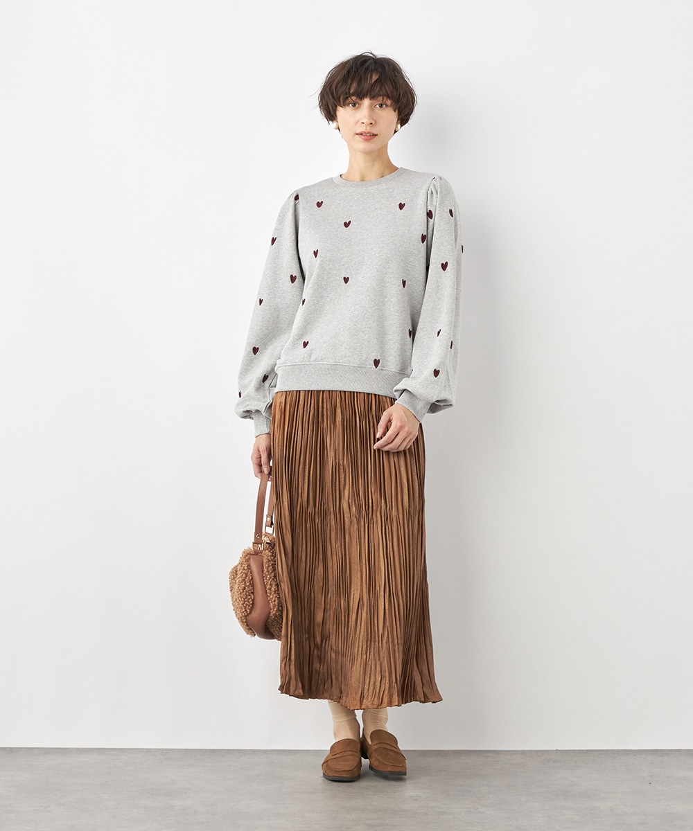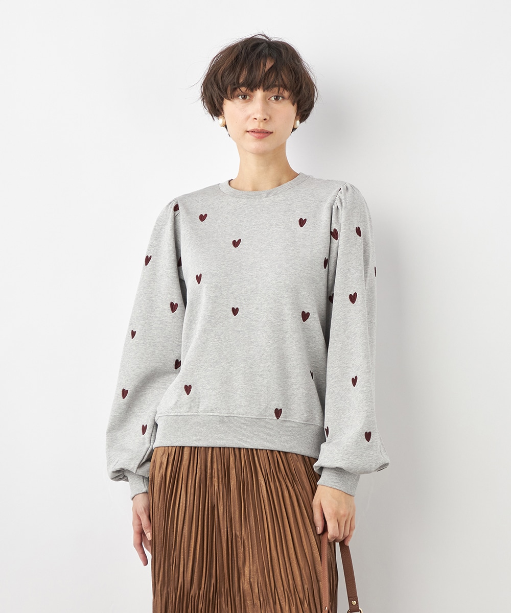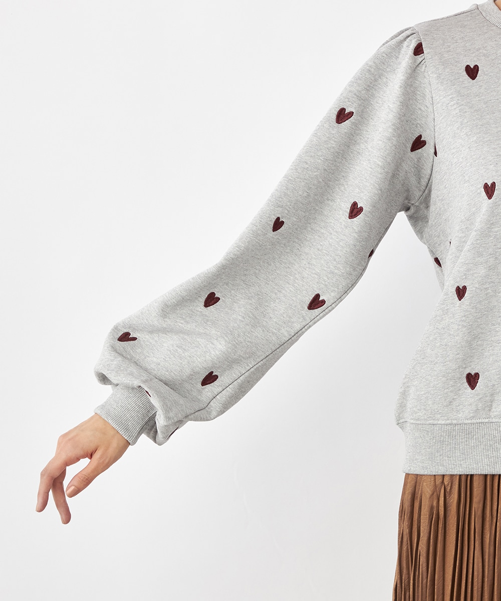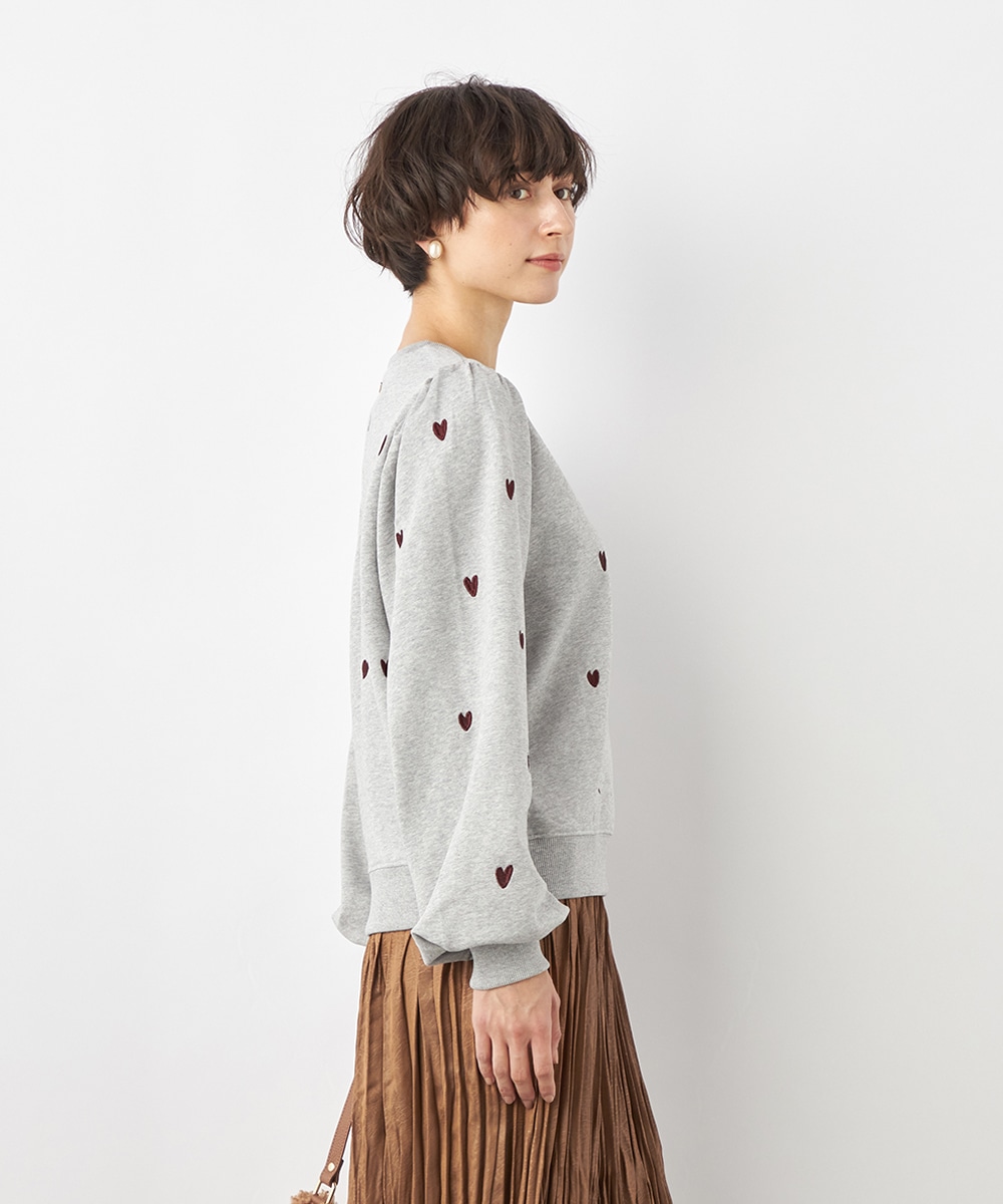全体にバランス良くハート刺繍を散りばめています。着丈は短めでコンパクトな印象のシルエットにまとめており、今年のトレンドにもぴったりです。バックネックにはゴールドカラーのモチーフを飾っています。カジュアルとガーリー感のバランスが良く、幅広いアレンジを楽しめるデザインです。