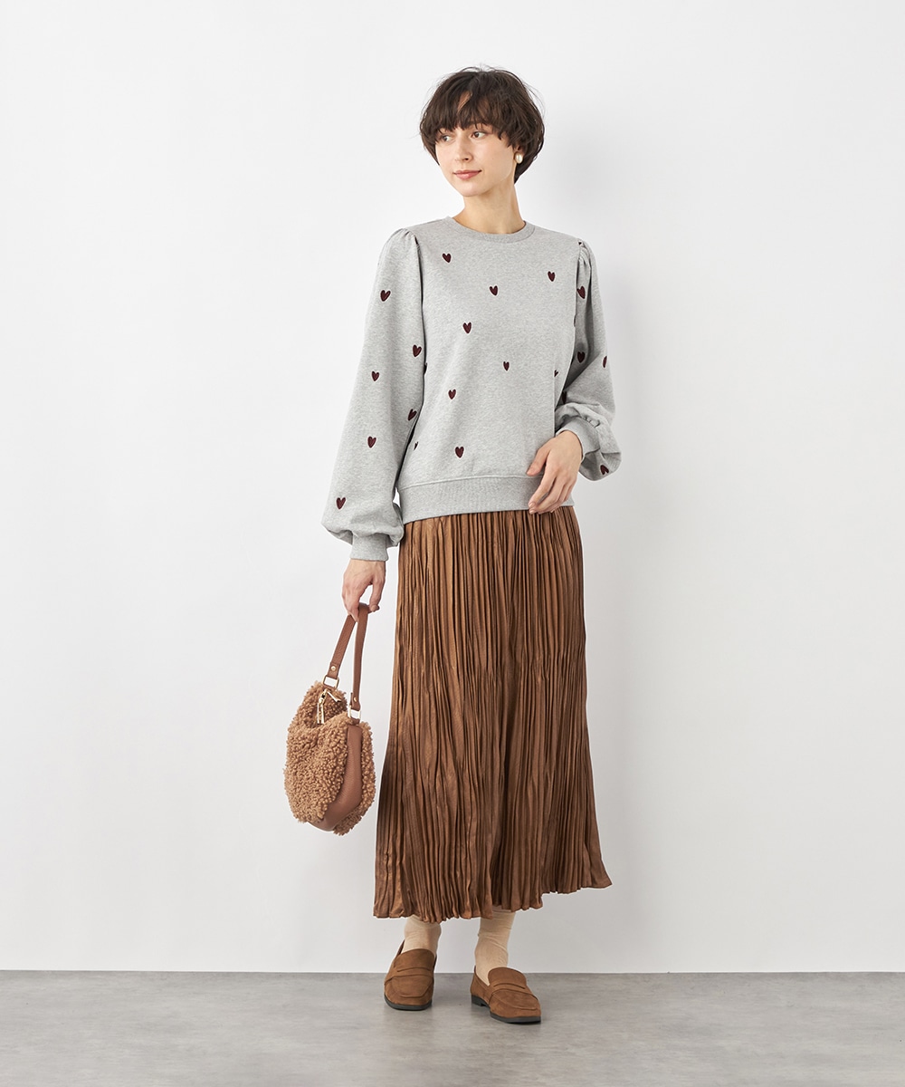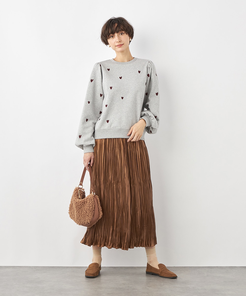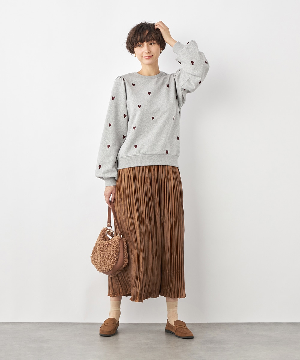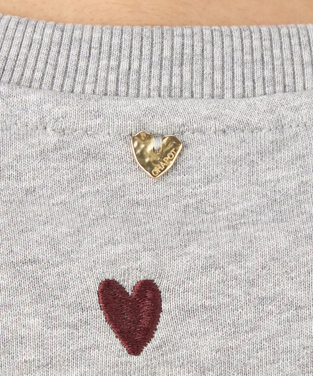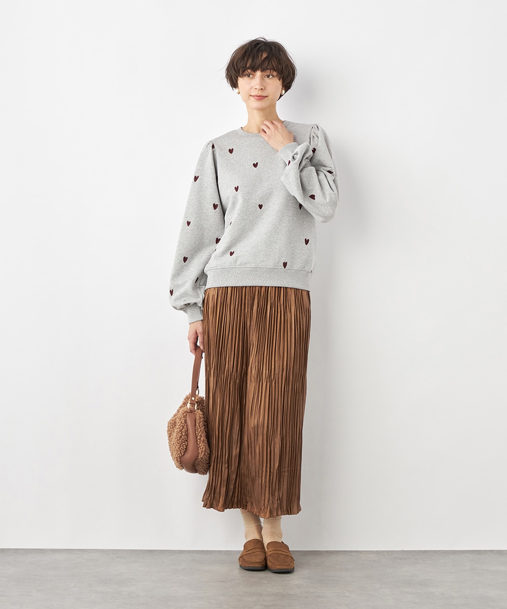 全体にバランス良くハート刺繍を散りばめています。着丈は短めでコンパクトな印象のシルエットにまとめており、今年のトレンドにもぴったりです。バックネックにはゴールドカラーのモチーフを飾っています。カジュアルとガーリー感のバランスが良く、幅広いアレンジを楽しめるデザインです。