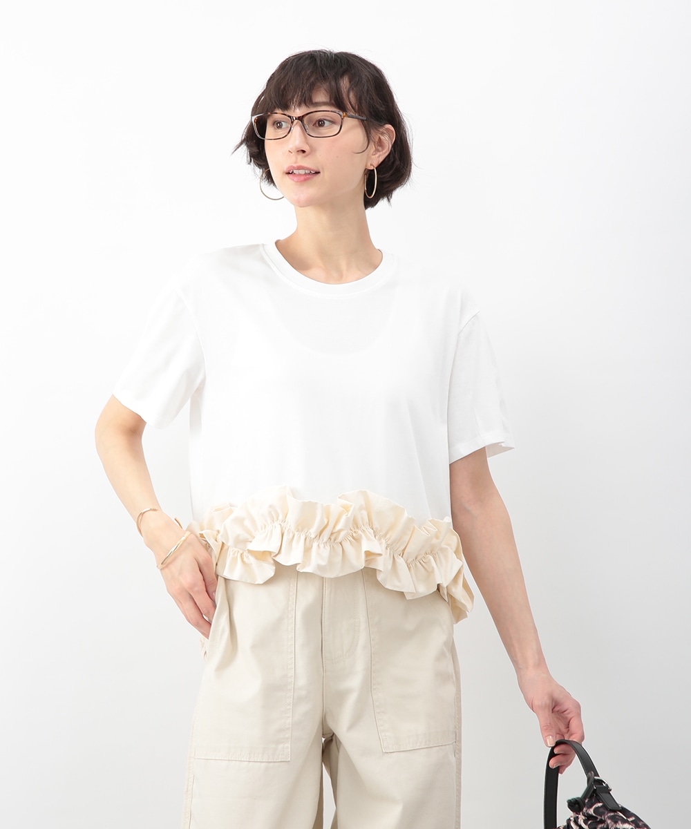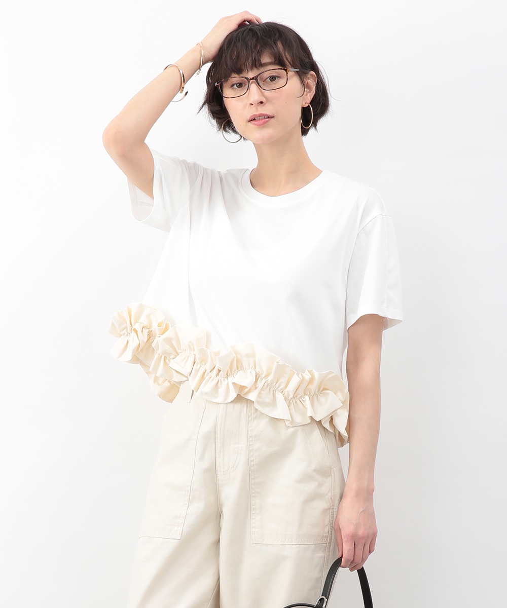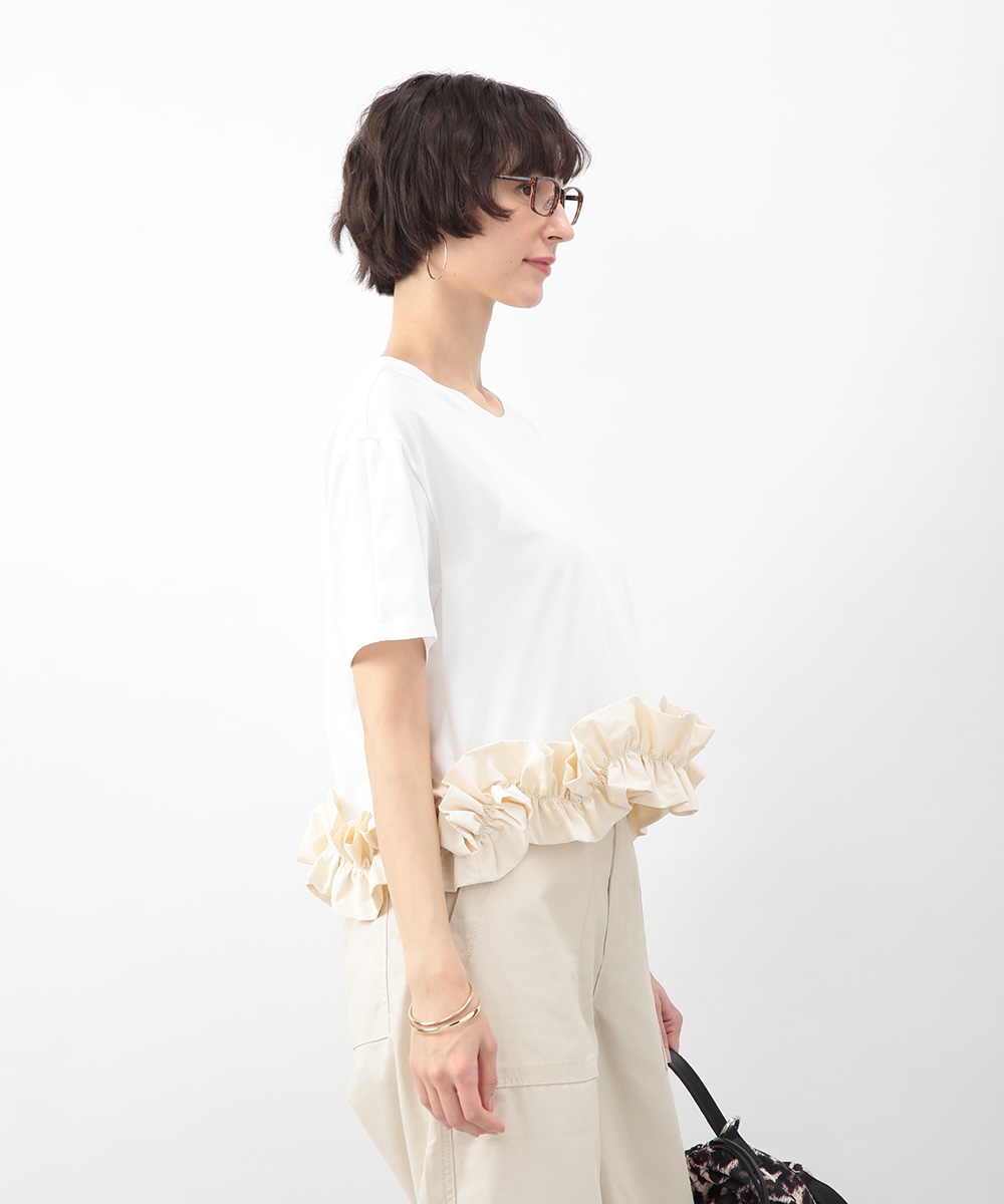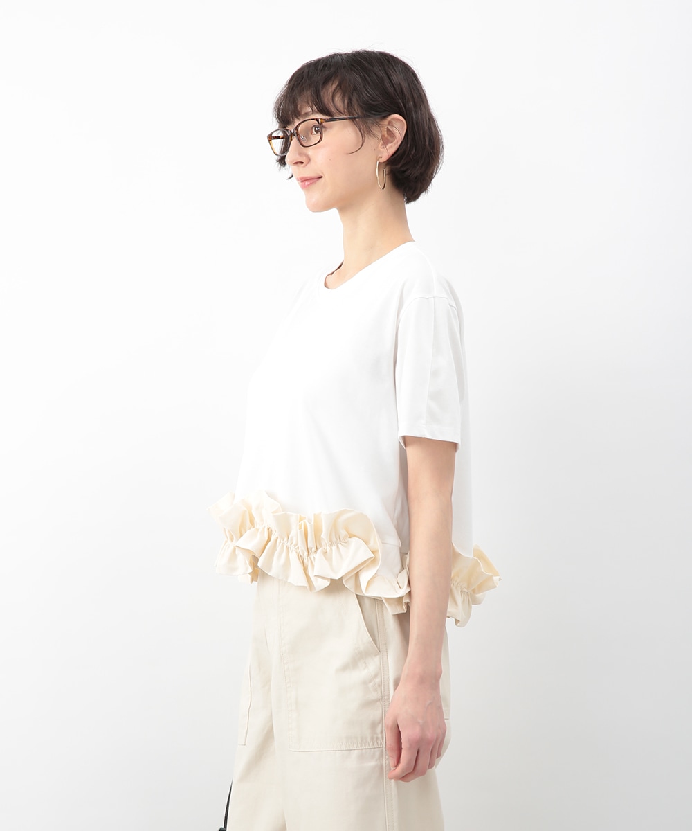 裾にあしらった立体感のあるフリルが目を惹くトップス。自然に広がるAラインシルエットがバランスよく、さりげなく女性らしい印象に。微配色のディテールがアクセントとなり、シンプルながらも表情のある一枚に仕上げています。ワイドパンツを穿いてモードに、タイトスカートを合わせてきれいめにも取り入れやすいアイテムです。
