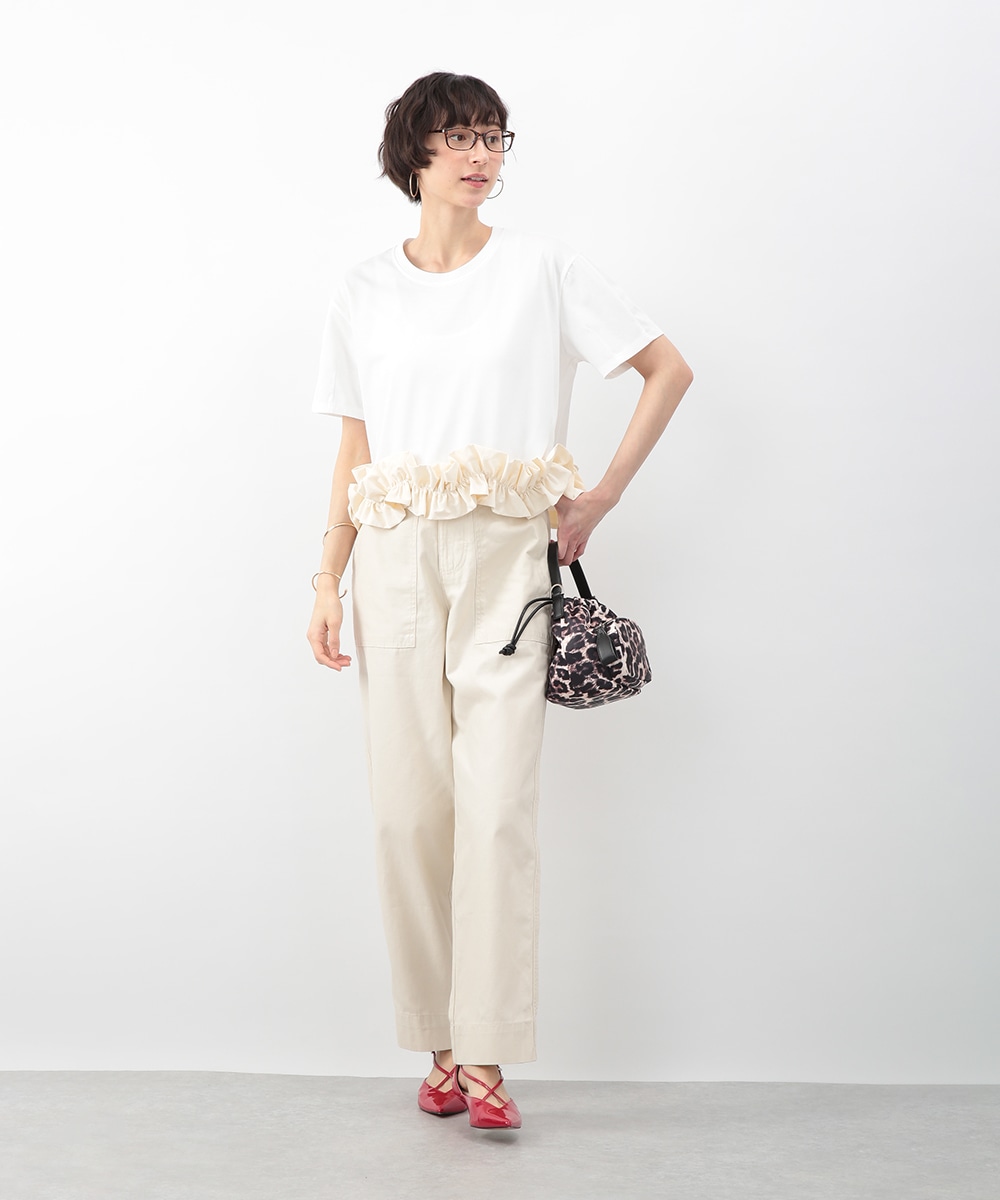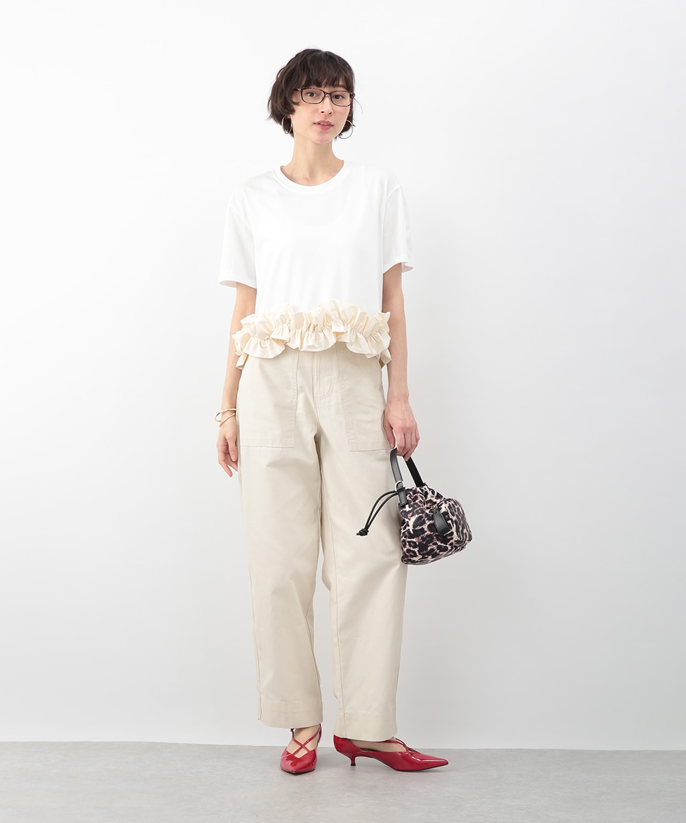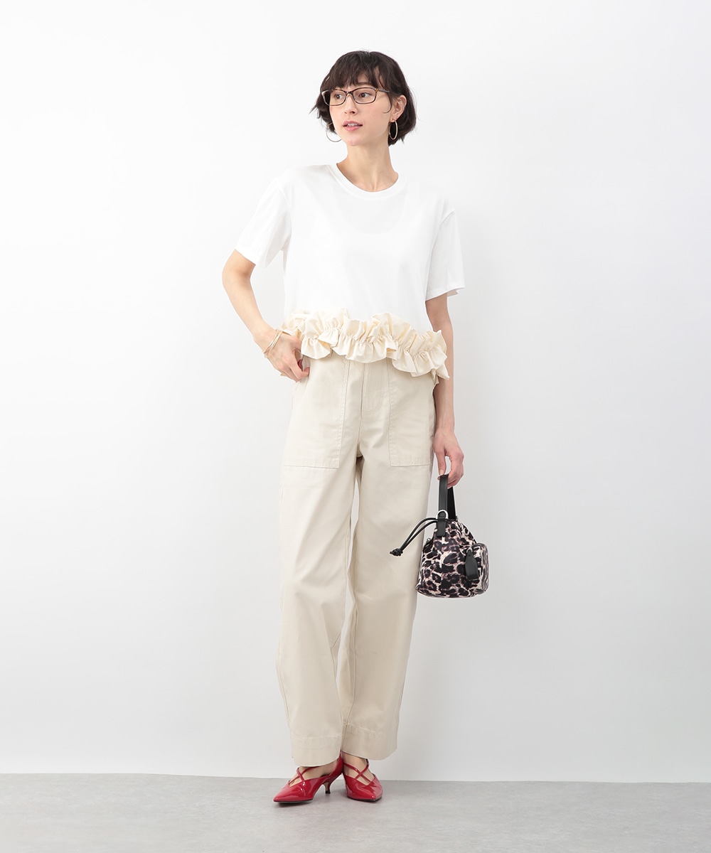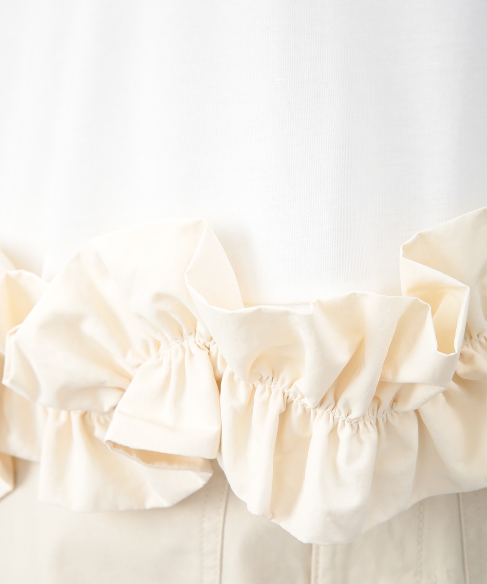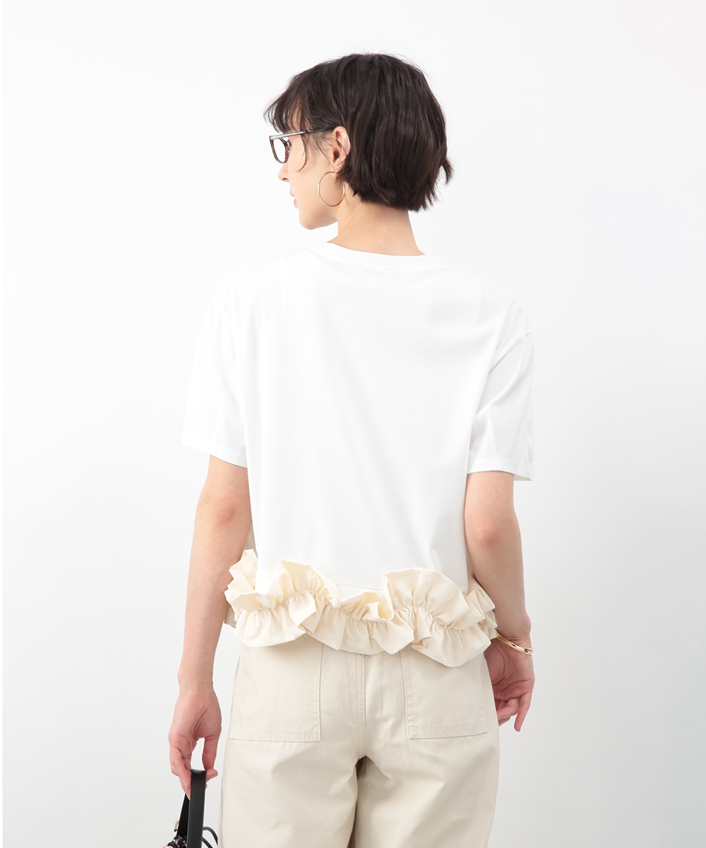 裾にあしらった立体感のあるフリルが目を惹くトップス。自然に広がるAラインシルエットがバランスよく、さりげなく女性らしい印象に。微配色のディテールがアクセントとなり、シンプルながらも表情のある一枚に仕上げています。ワイドパンツを穿いてモードに、タイトスカートを合わせてきれいめにも取り入れやすいアイテムです。
