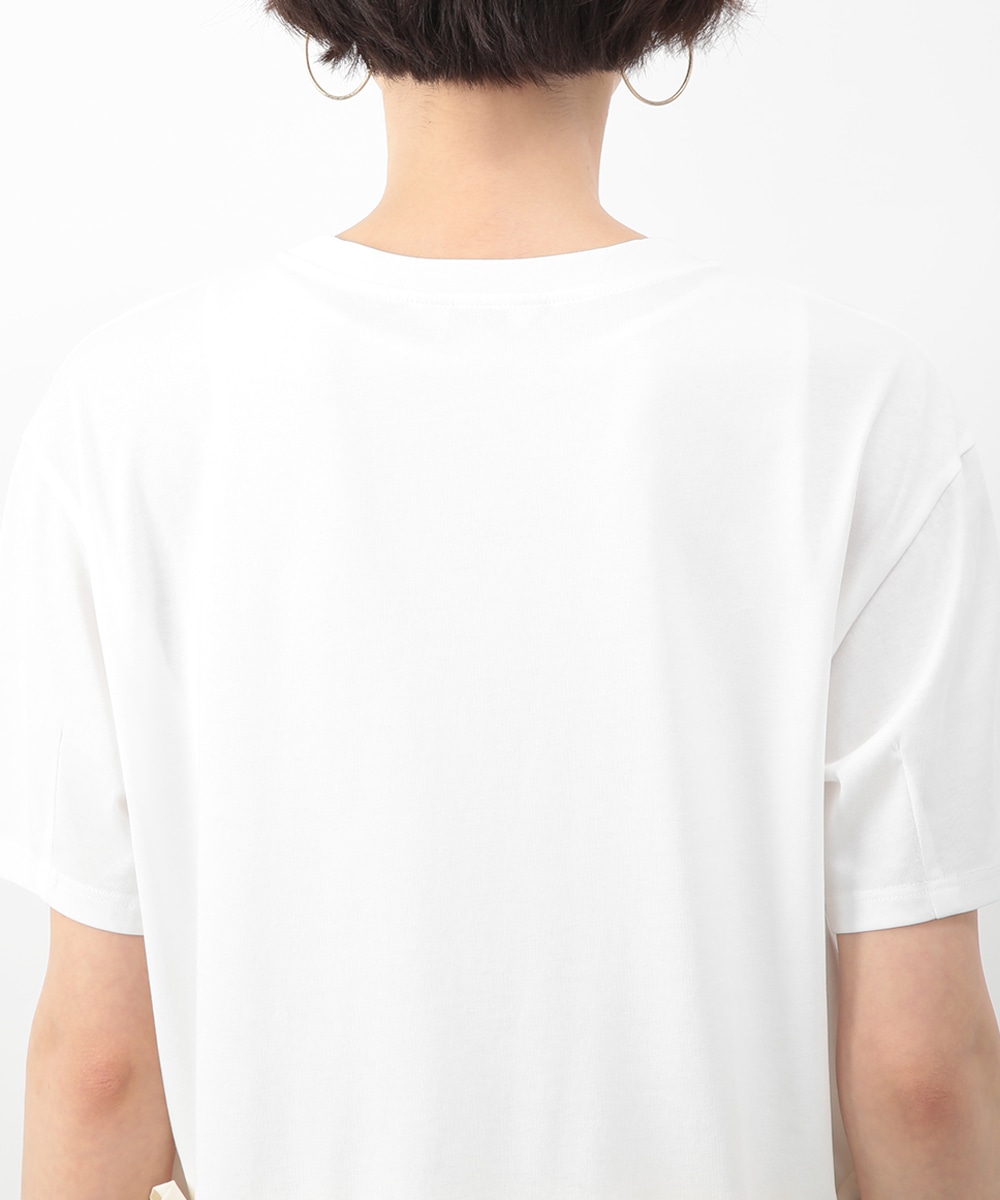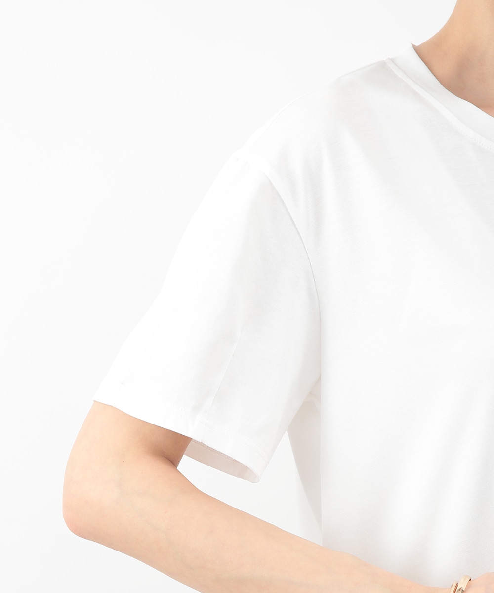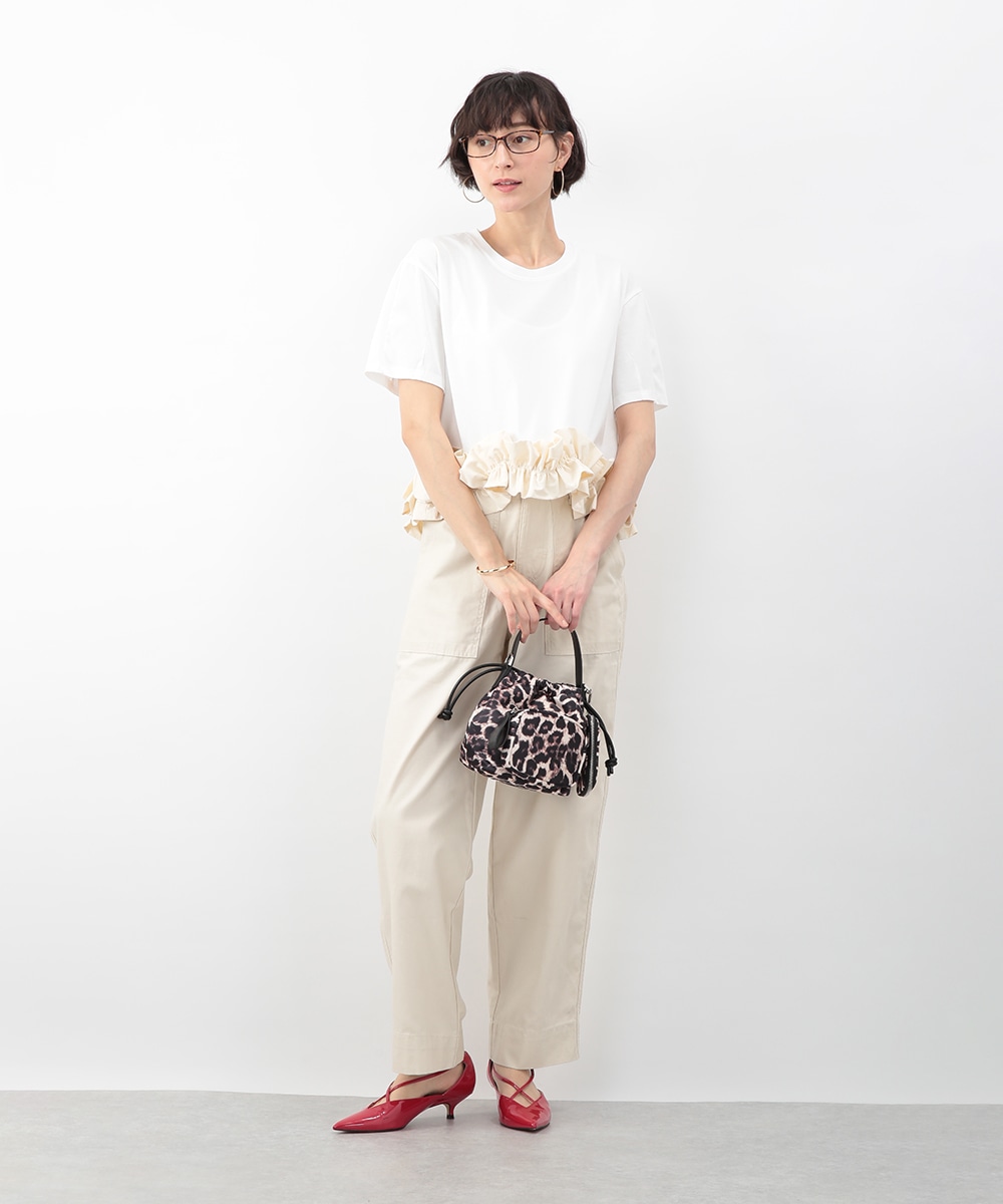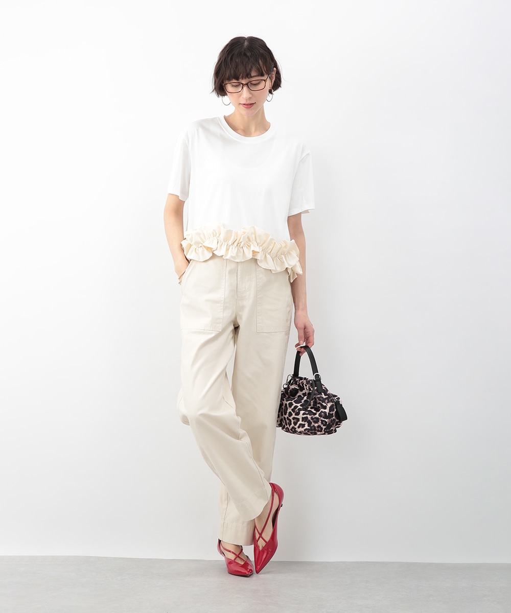裾にあしらった立体感のあるフリルが目を惹くトップス。自然に広がるAラインシルエットがバランスよく、さりげなく女性らしい印象に。微配色のディテールがアクセントとなり、シンプルながらも表情のある一枚に仕上げています。ワイドパンツを穿いてモードに、タイトスカートを合わせてきれいめにも取り入れやすいアイテムです。