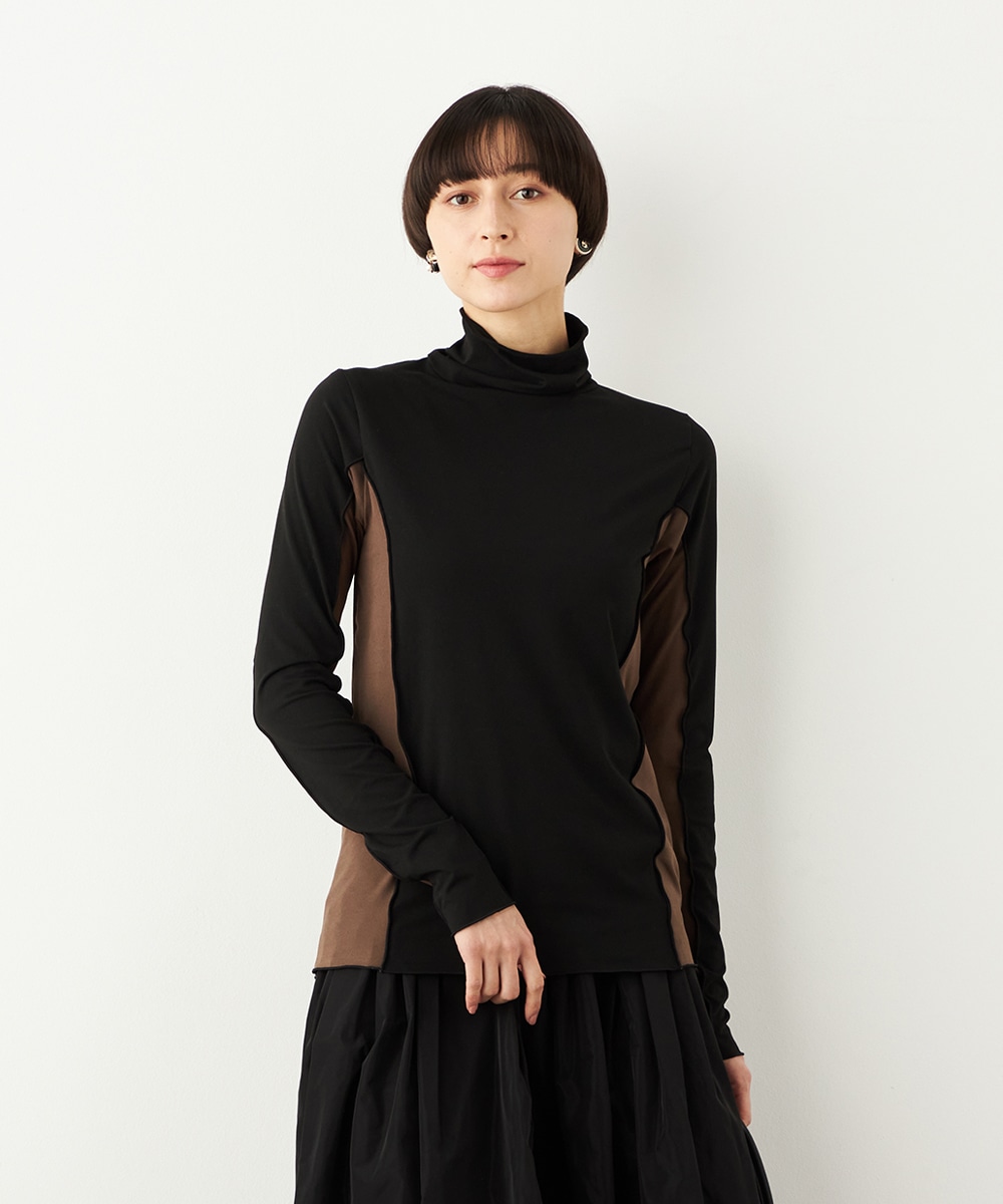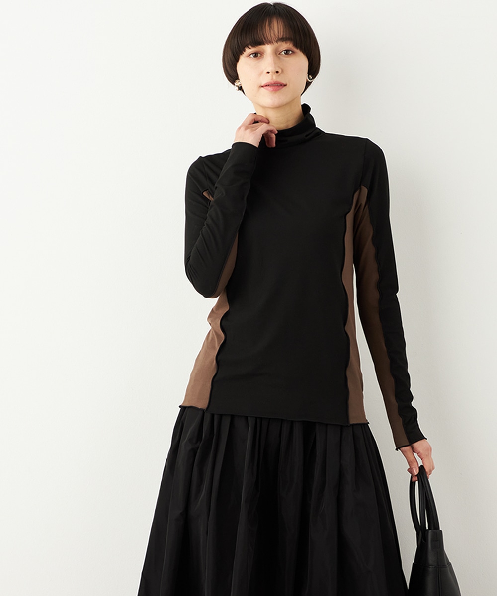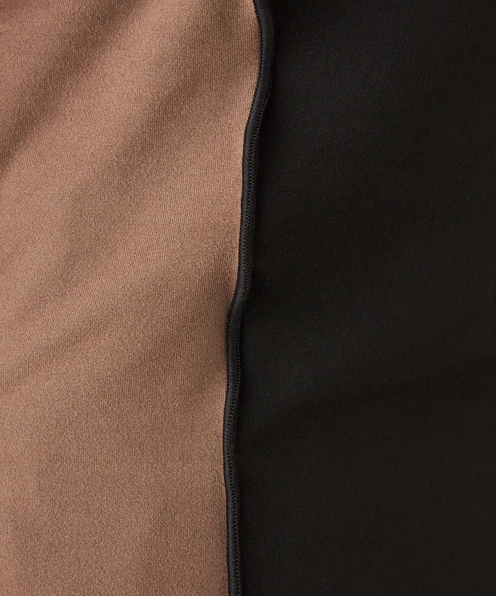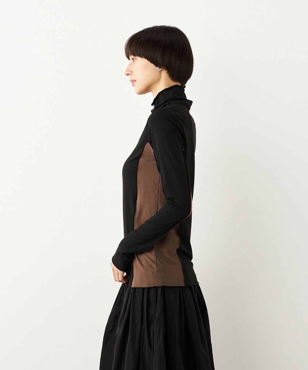 シックなカラーリングが大人っぽい印象です。切り替え部分を強調したデザインも目を引くポイント。暖かみのある起毛素材を使用しています。肌触りはもちもちとして心地よく着用が可能です。適度な厚みですっきりと着こなせます。ワンピースと合わせるのも、ジャケットやシャツのインナーとしてもおすすめです。
