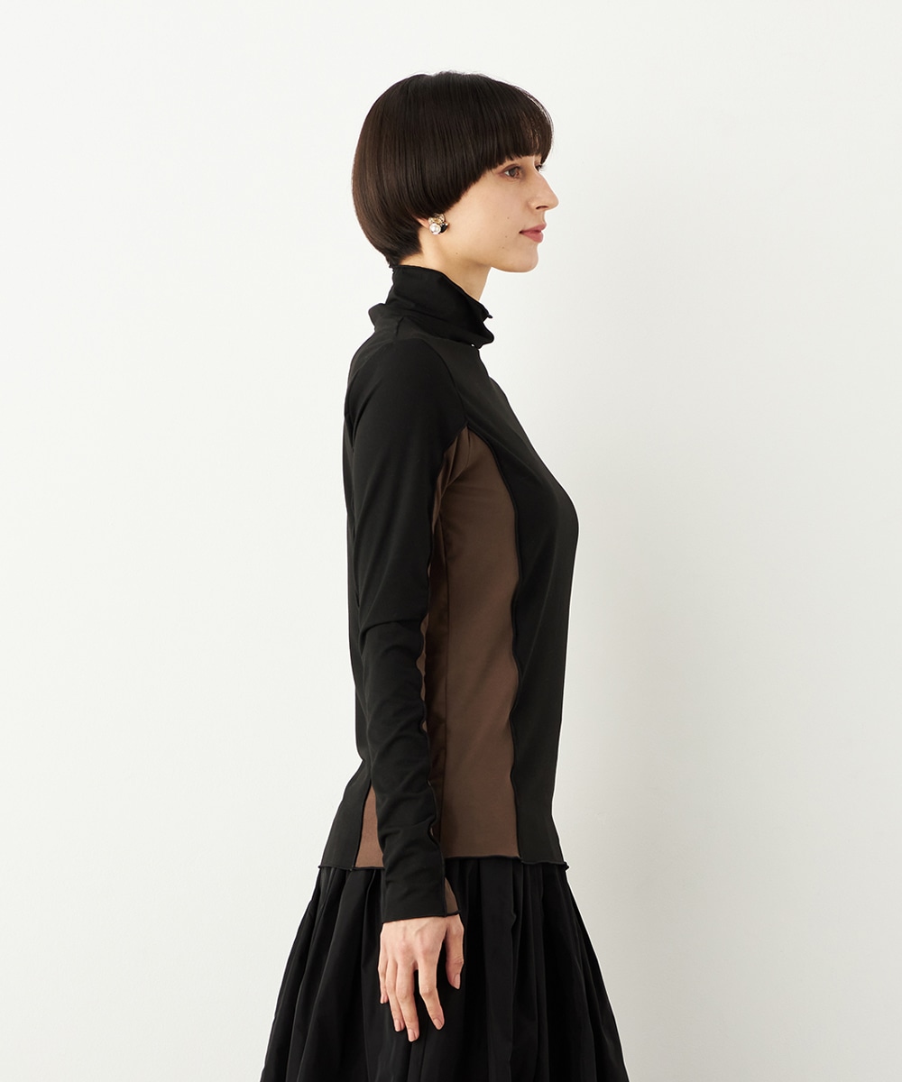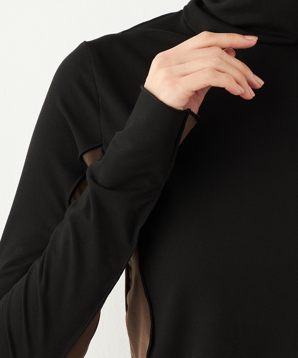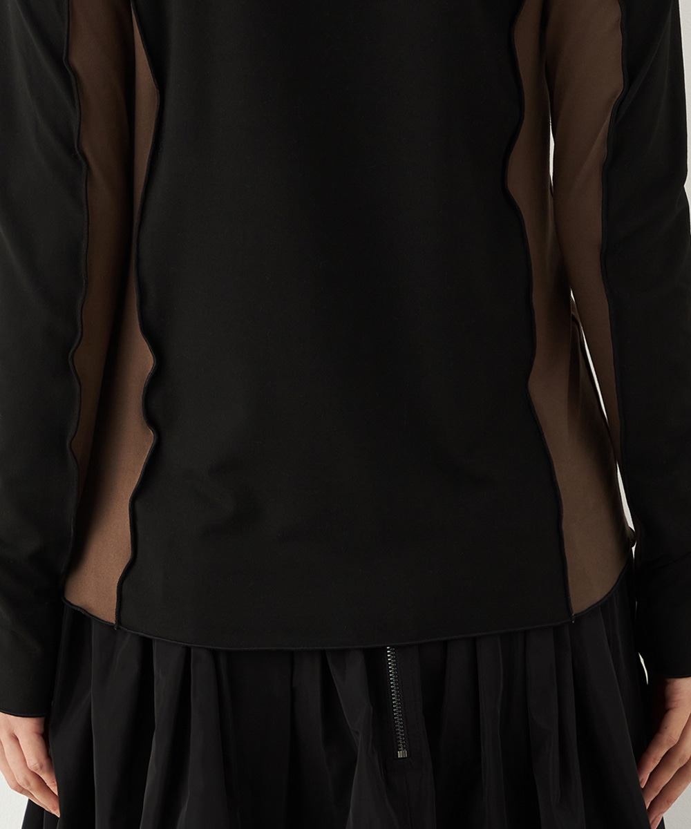 シックなカラーリングが大人っぽい印象です。切り替え部分を強調したデザインも目を引くポイント。暖かみのある起毛素材を使用しています。肌触りはもちもちとして心地よく着用が可能です。適度な厚みですっきりと着こなせます。ワンピースと合わせるのも、ジャケットやシャツのインナーとしてもおすすめです。