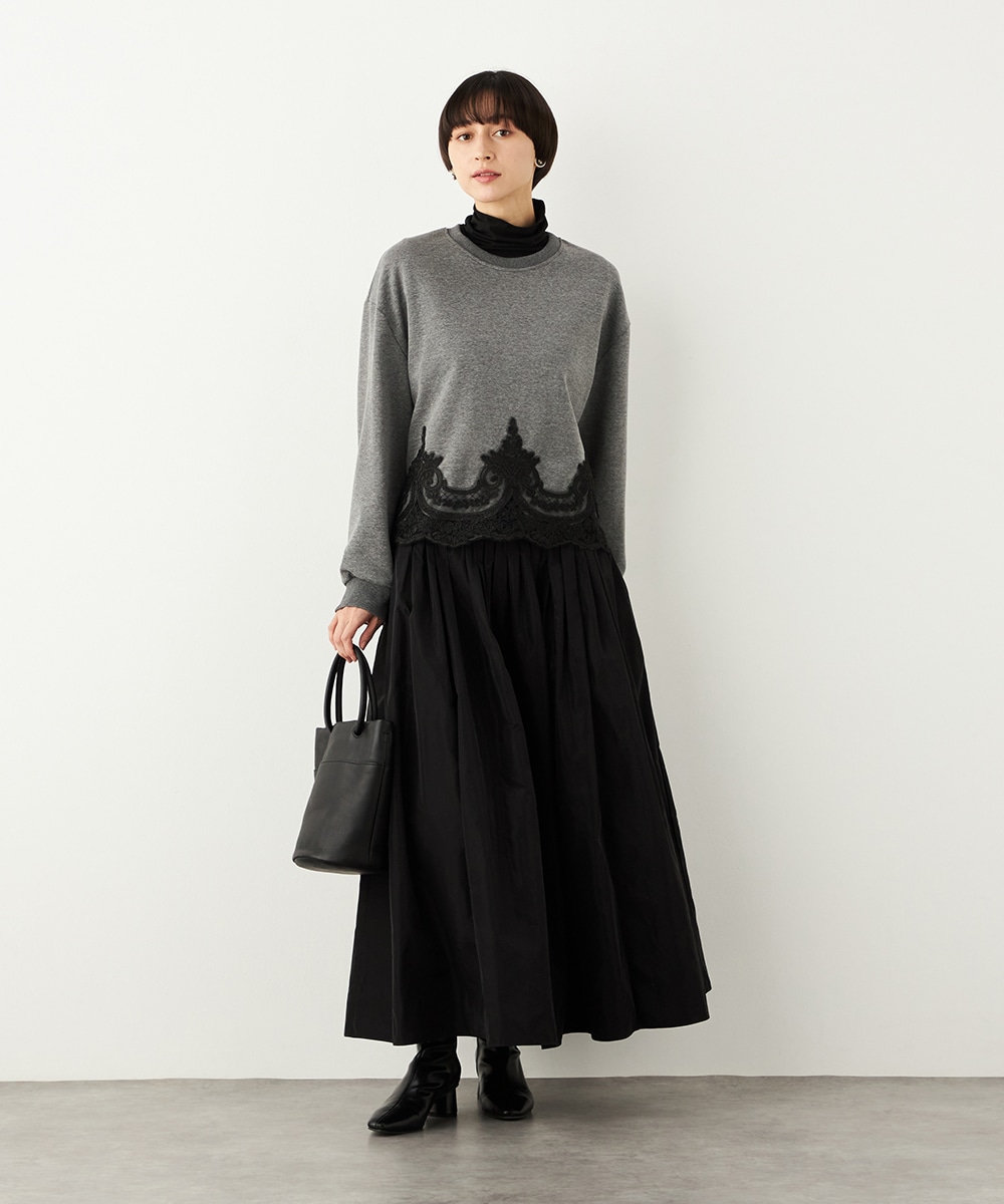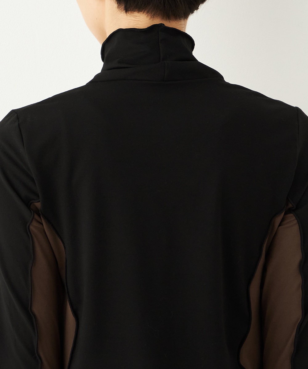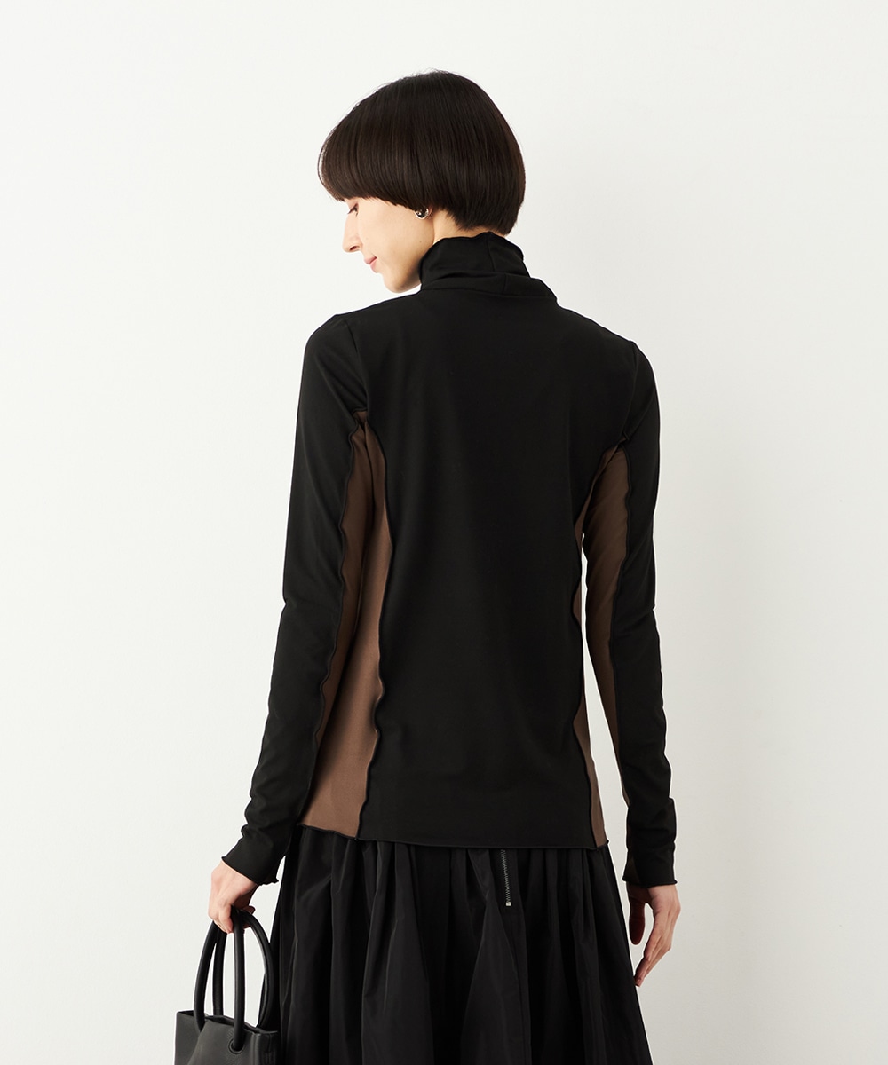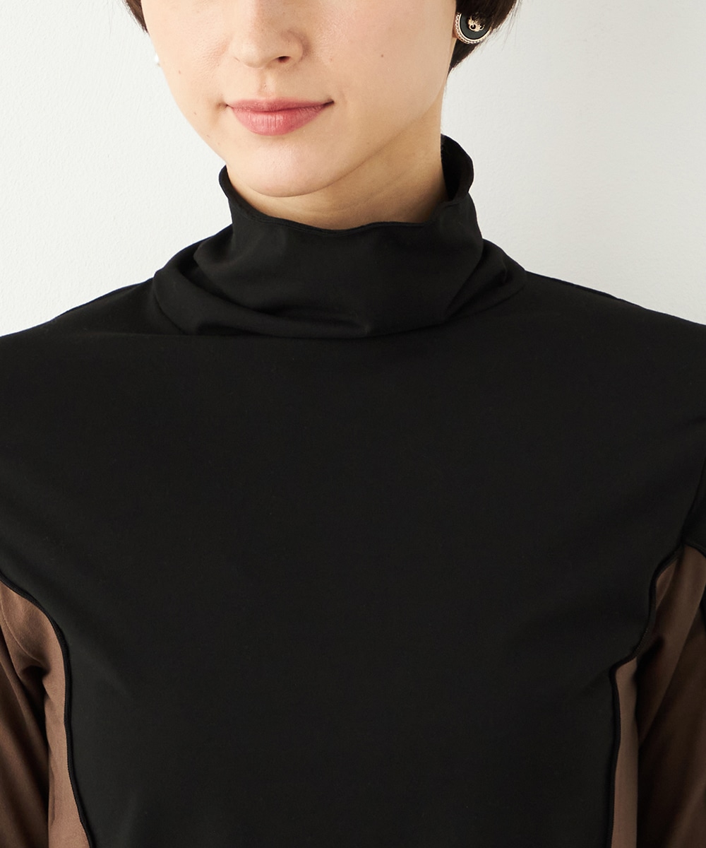 シックなカラーリングが大人っぽい印象です。切り替え部分を強調したデザインも目を引くポイント。暖かみのある起毛素材を使用しています。肌触りはもちもちとして心地よく着用が可能です。適度な厚みですっきりと着こなせます。ワンピースと合わせるのも、ジャケットやシャツのインナーとしてもおすすめです。