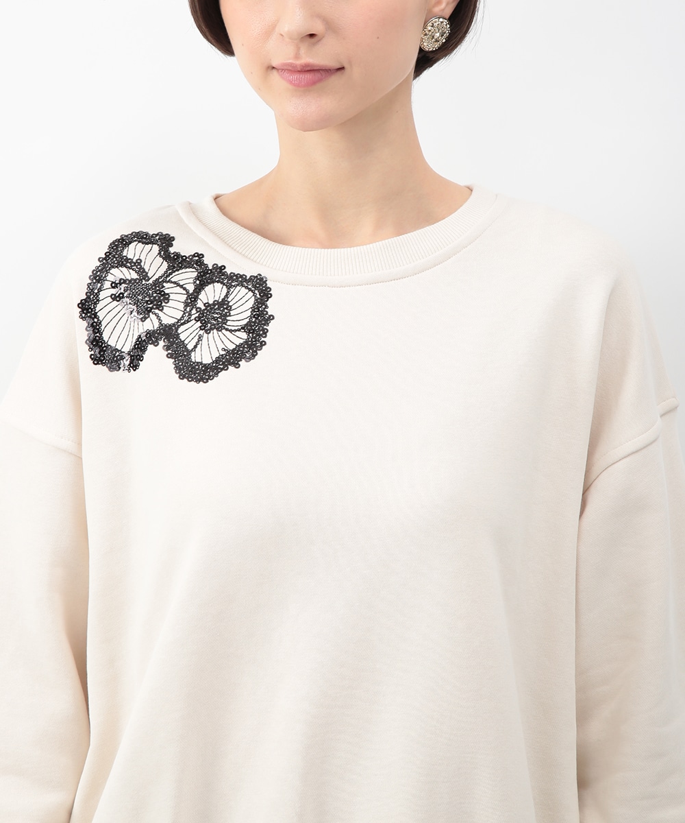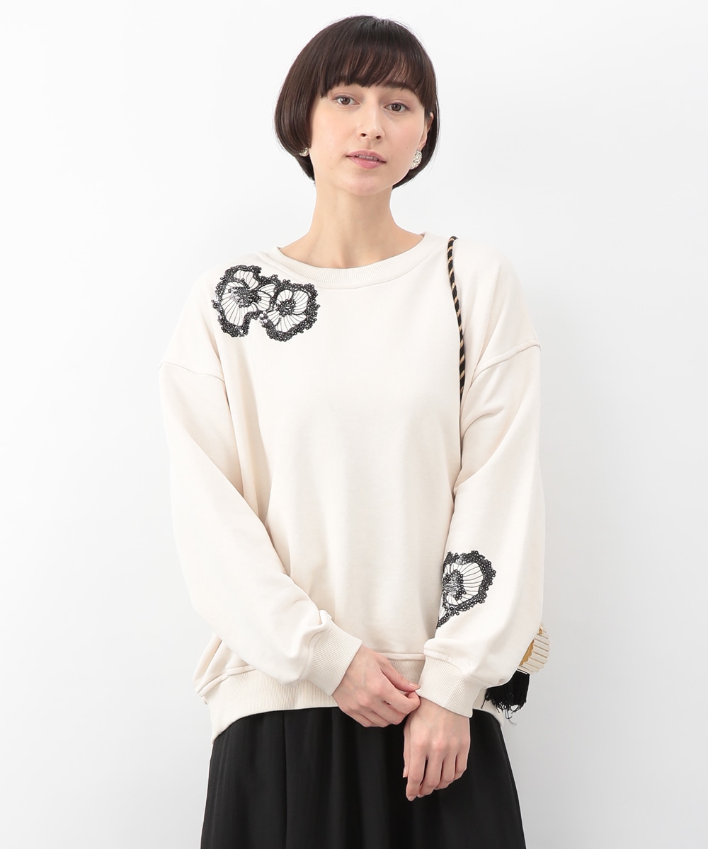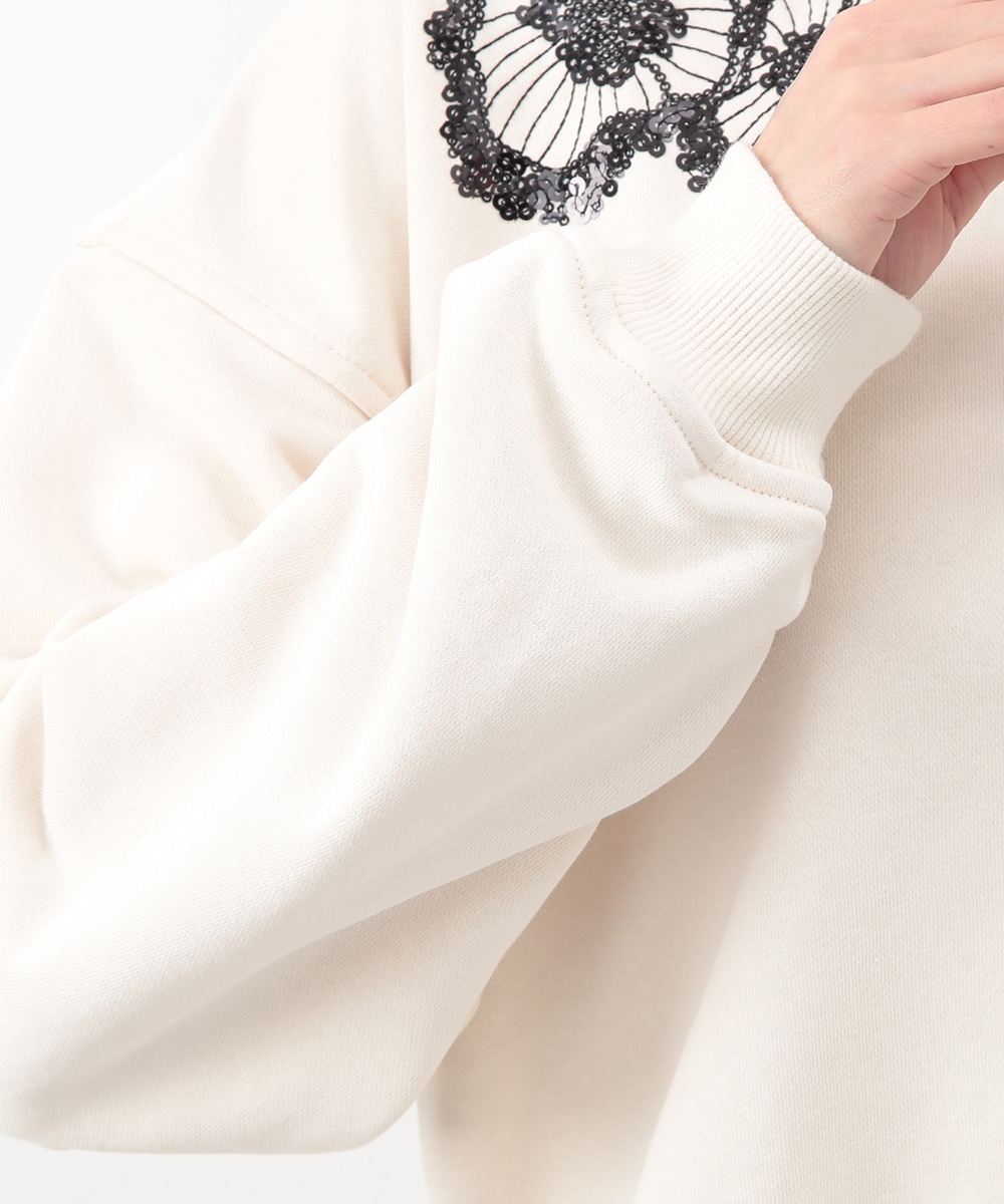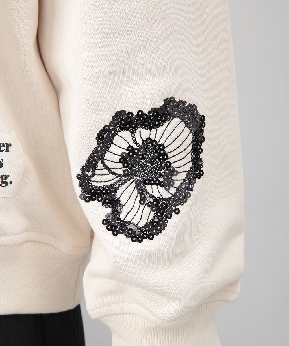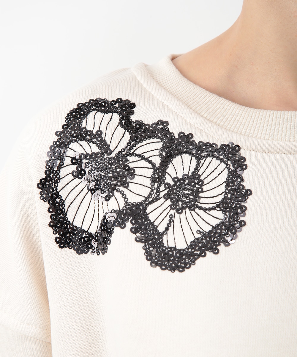 スパンコールで表現したフラワーモチーフが目を引くスウェット。立体感のあるデザインがさりげない華やかさを添え、カジュアルな中にも女性らしい印象をプラスします。ゆったりとしたシルエットでリラックス感のある着心地も魅力。スカートを合わせて上品に、デニムを穿いてラフにも取り入れやすい一枚です。