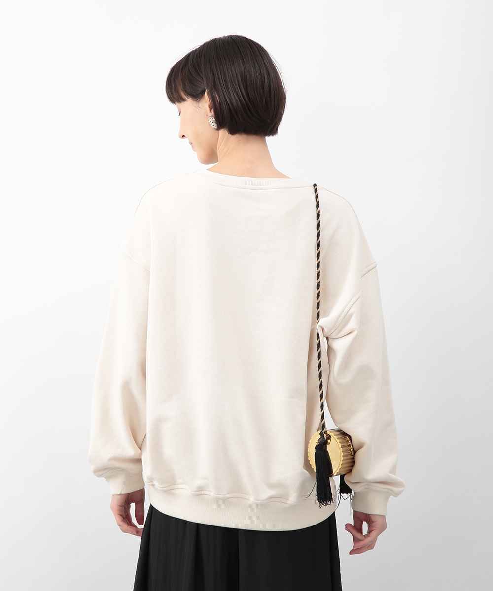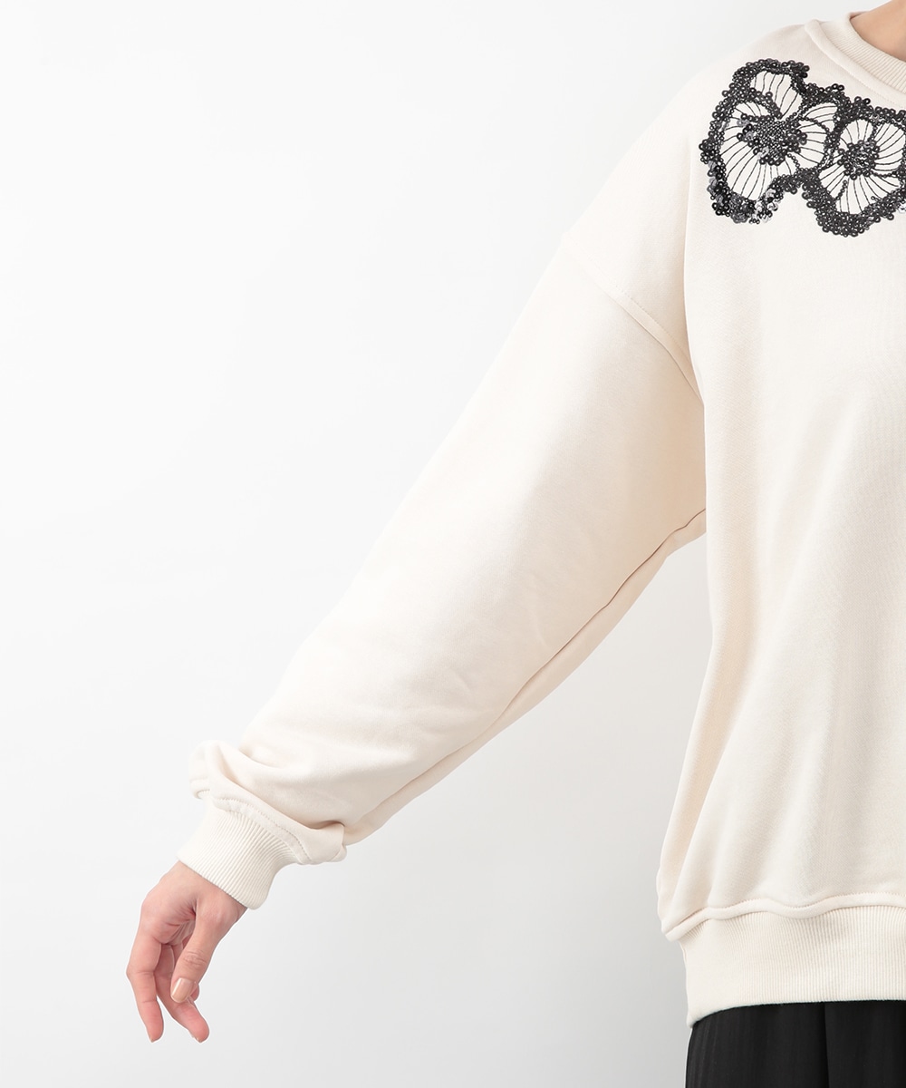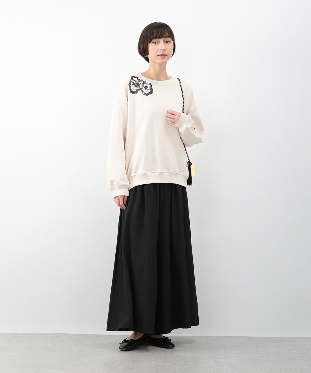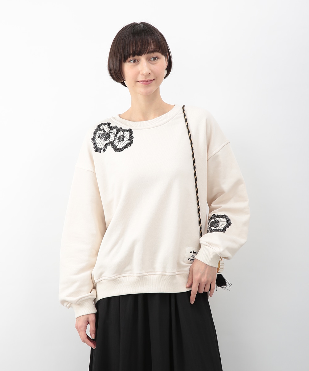 スパンコールで表現したフラワーモチーフが目を引くスウェット。立体感のあるデザインがさりげない華やかさを添え、カジュアルな中にも女性らしい印象をプラスします。ゆったりとしたシルエットでリラックス感のある着心地も魅力。スカートを合わせて上品に、デニムを穿いてラフにも取り入れやすい一枚です。