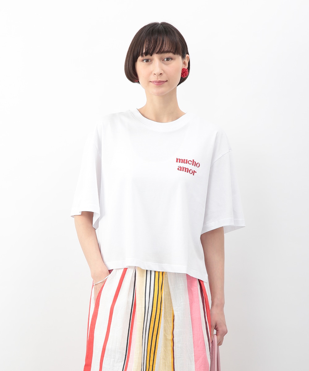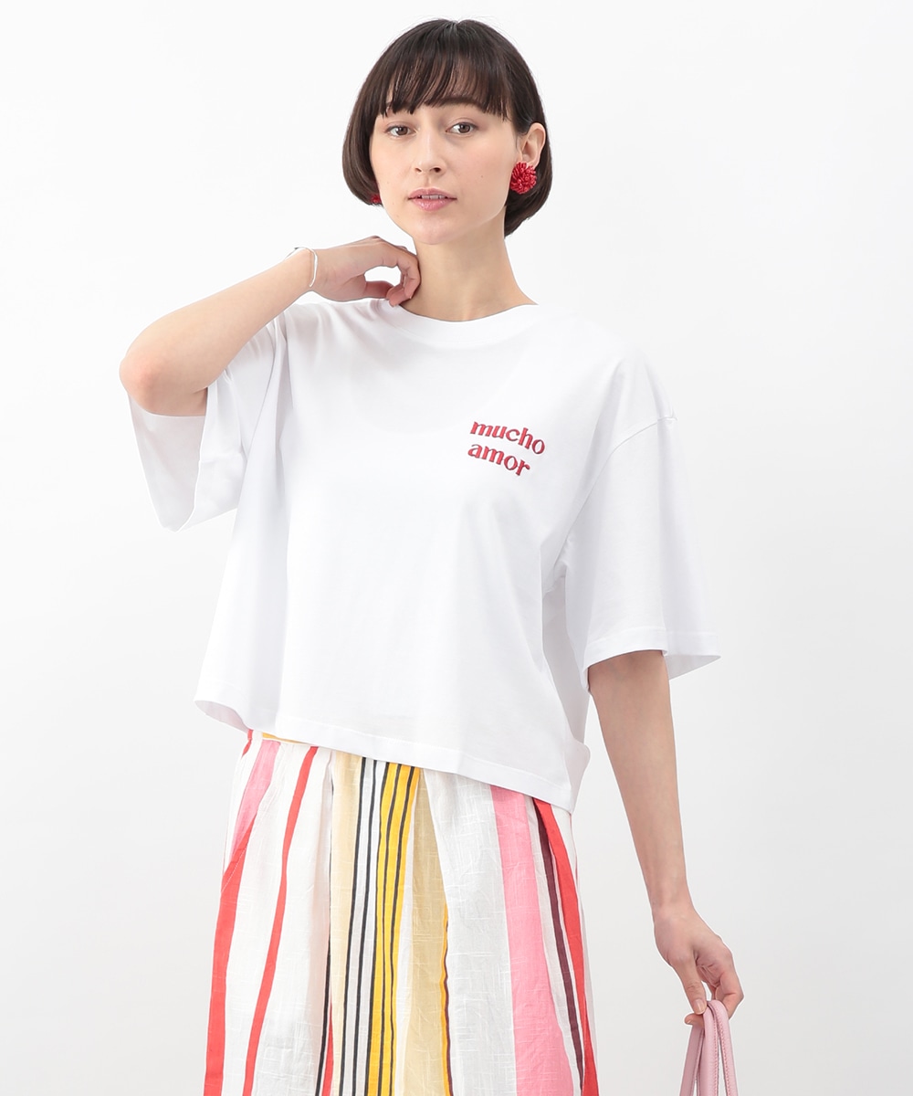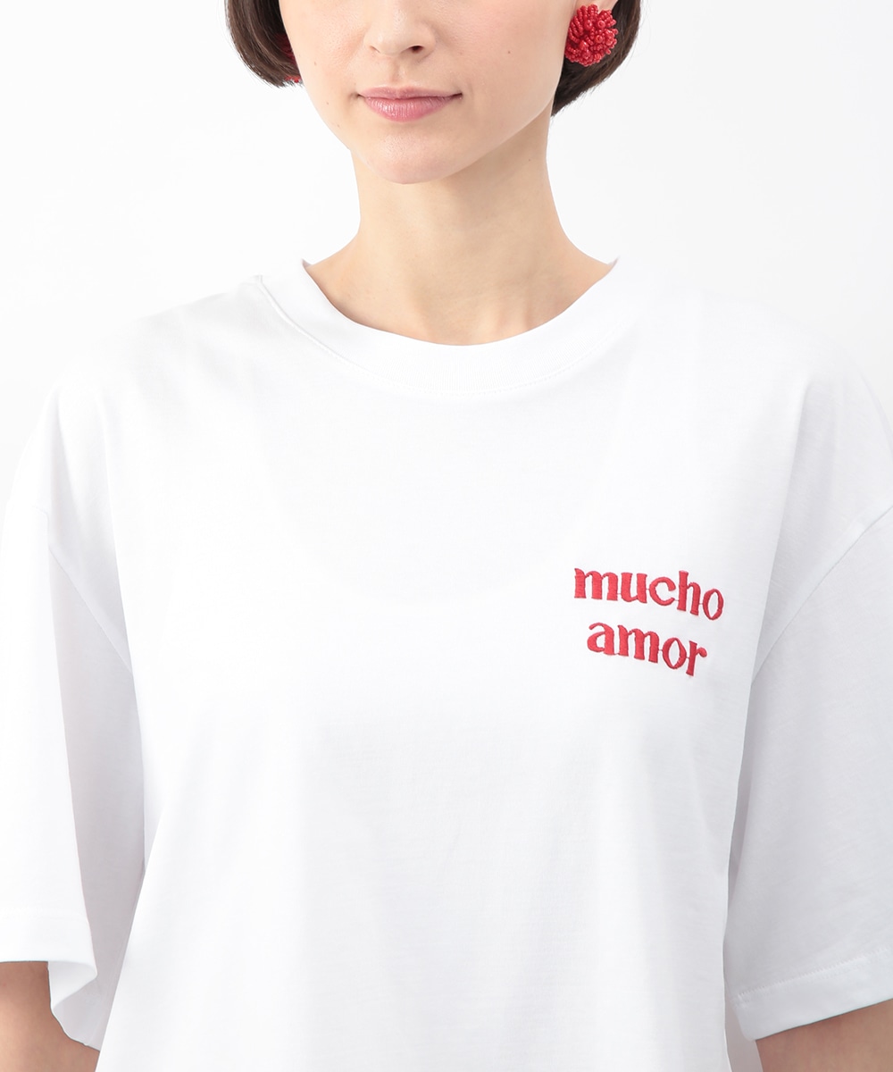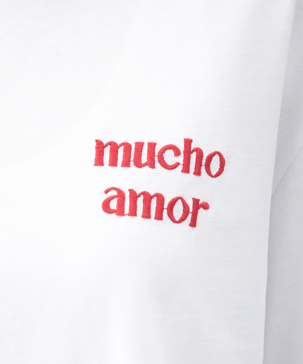 胸元にあしらったmucho amorの刺しゅうがポイントのTシャツ。スペイン語で「たくさんの愛」を意味するメッセージが、さりげないアクセントに。短めの着丈がバランスを取りやすく、ワイドパンツやスカートとも好相性です。シンプルながら程よく個性を添え、デイリーコーデに取り入れやすい一枚です。