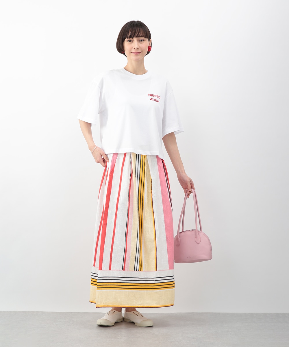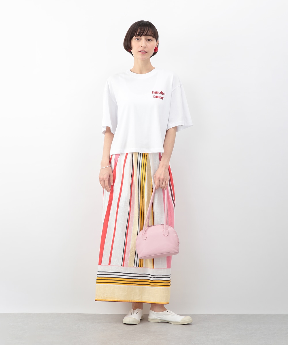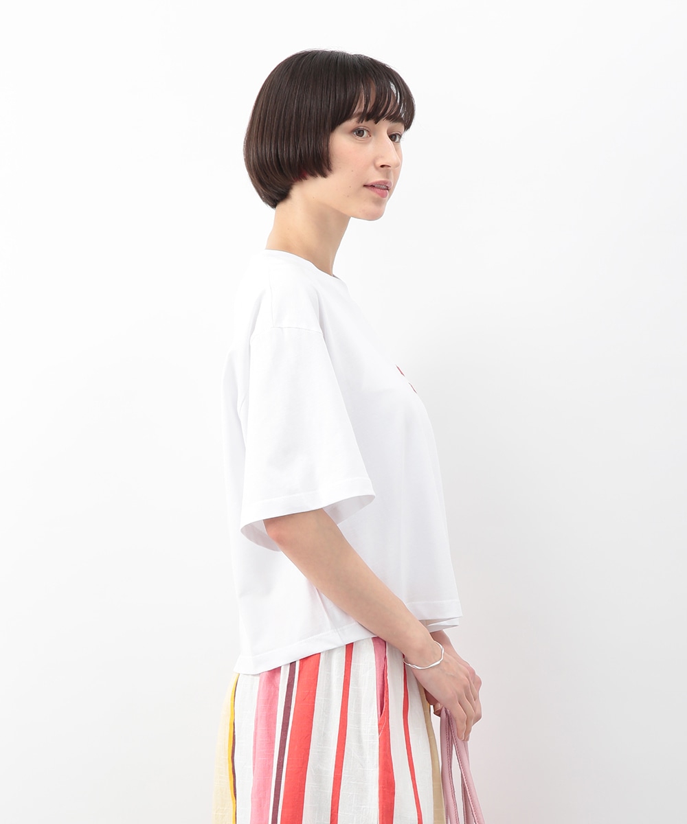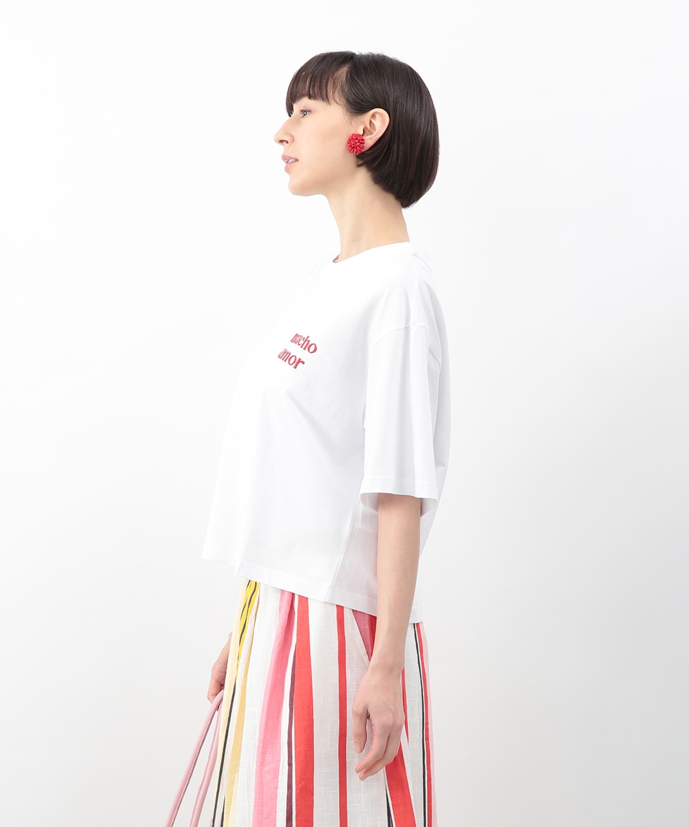 胸元にあしらったmucho amorの刺しゅうがポイントのTシャツ。スペイン語で「たくさんの愛」を意味するメッセージが、さりげないアクセントに。短めの着丈がバランスを取りやすく、ワイドパンツやスカートとも好相性です。シンプルながら程よく個性を添え、デイリーコーデに取り入れやすい一枚です。
