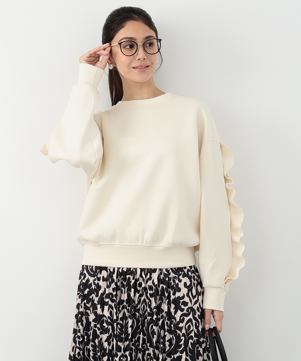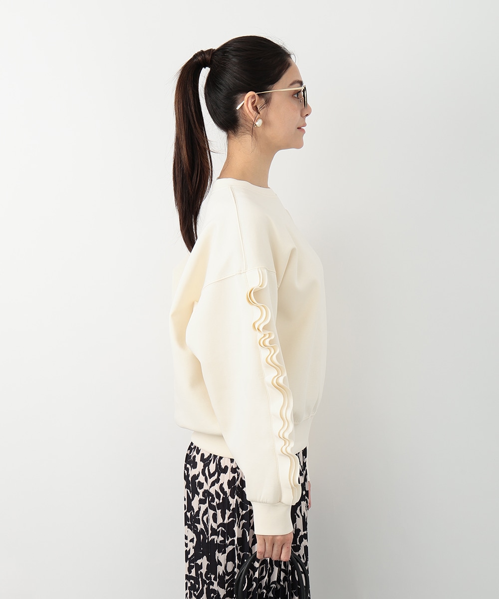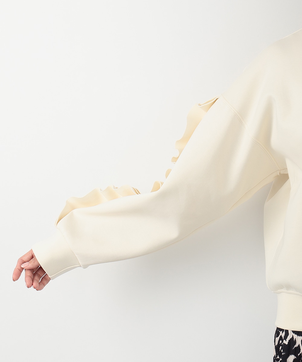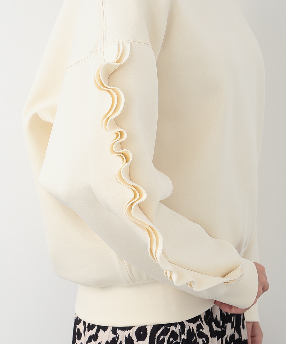 スリーブのフリルデザインがフェミニンなムードを演出するトップス。もちもちとしたスクーバ素材を使用し、立体感のあるシルエットに仕上げました。カジュアルになりすぎず、大人でも着やすいデザインにこだわっています。スカートはもちろん、パンツスタイルにも好相性のアイテムです。