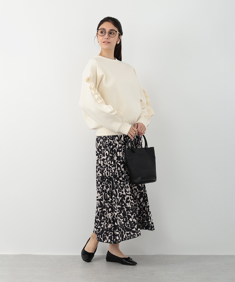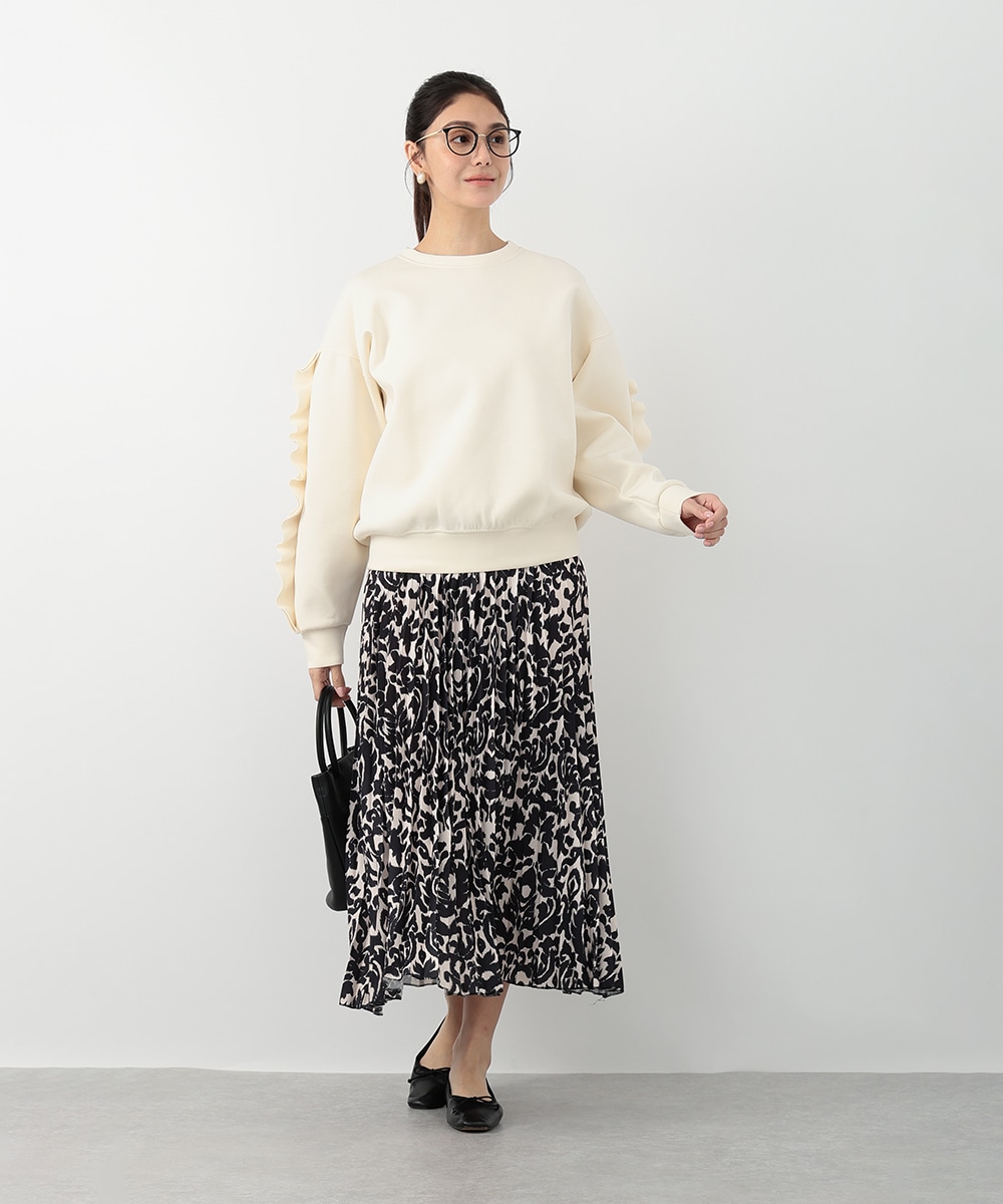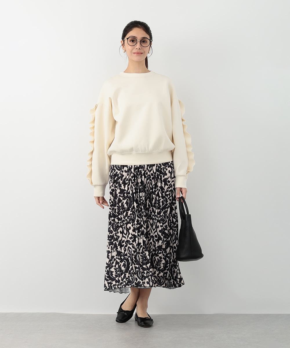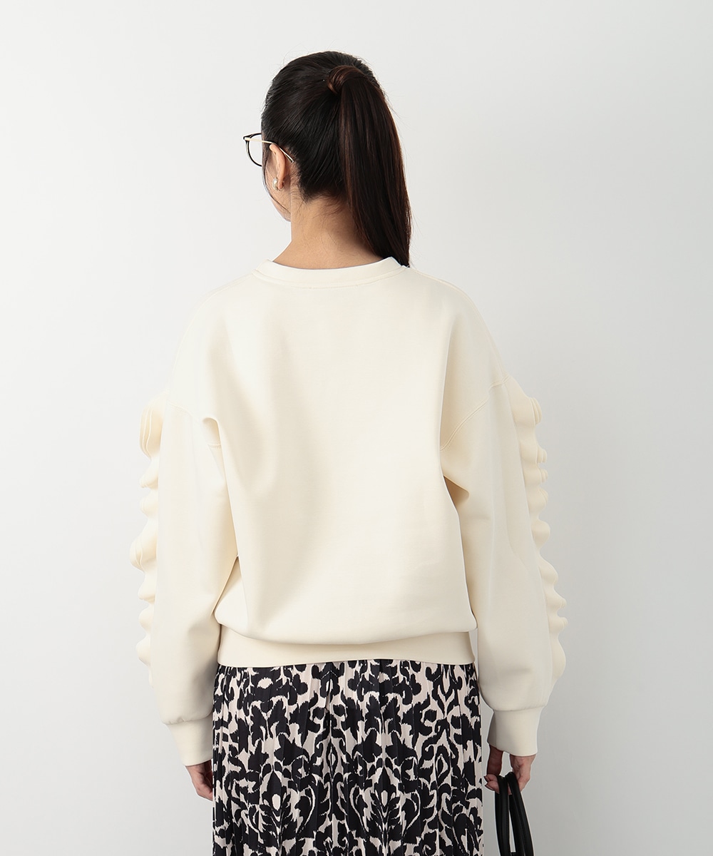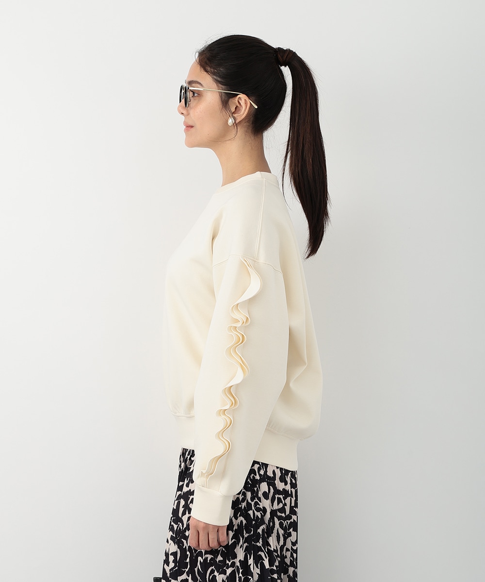 スリーブのフリルデザインがフェミニンなムードを演出するトップス。もちもちとしたスクーバ素材を使用し、立体感のあるシルエットに仕上げました。カジュアルになりすぎず、大人でも着やすいデザインにこだわっています。スカートはもちろん、パンツスタイルにも好相性のアイテムです。