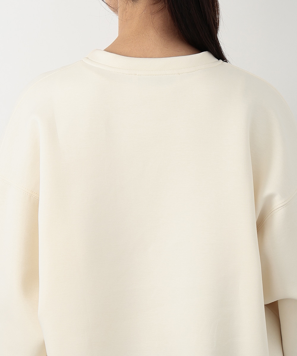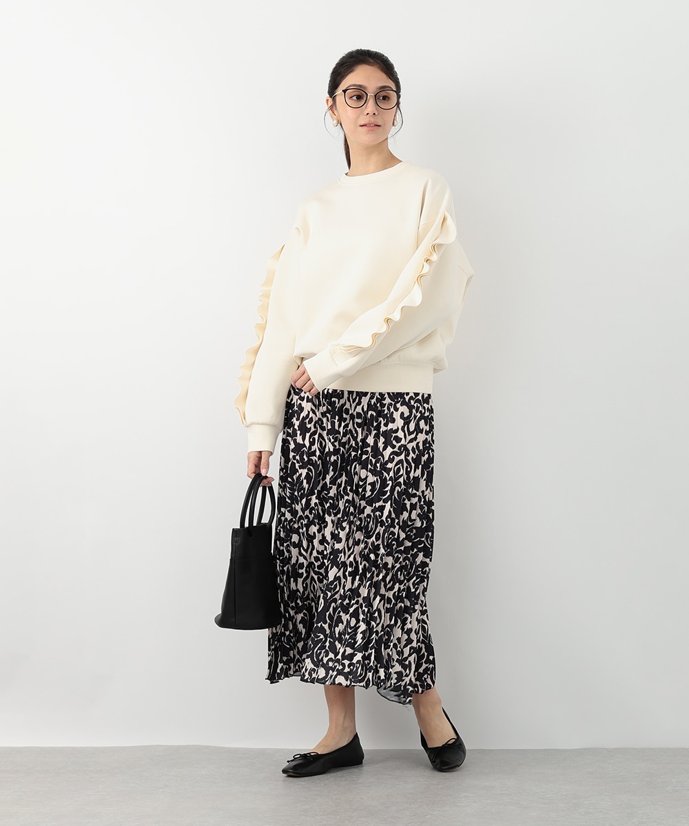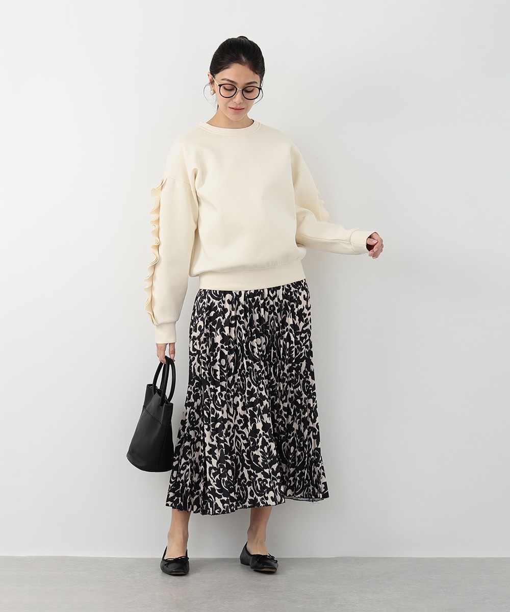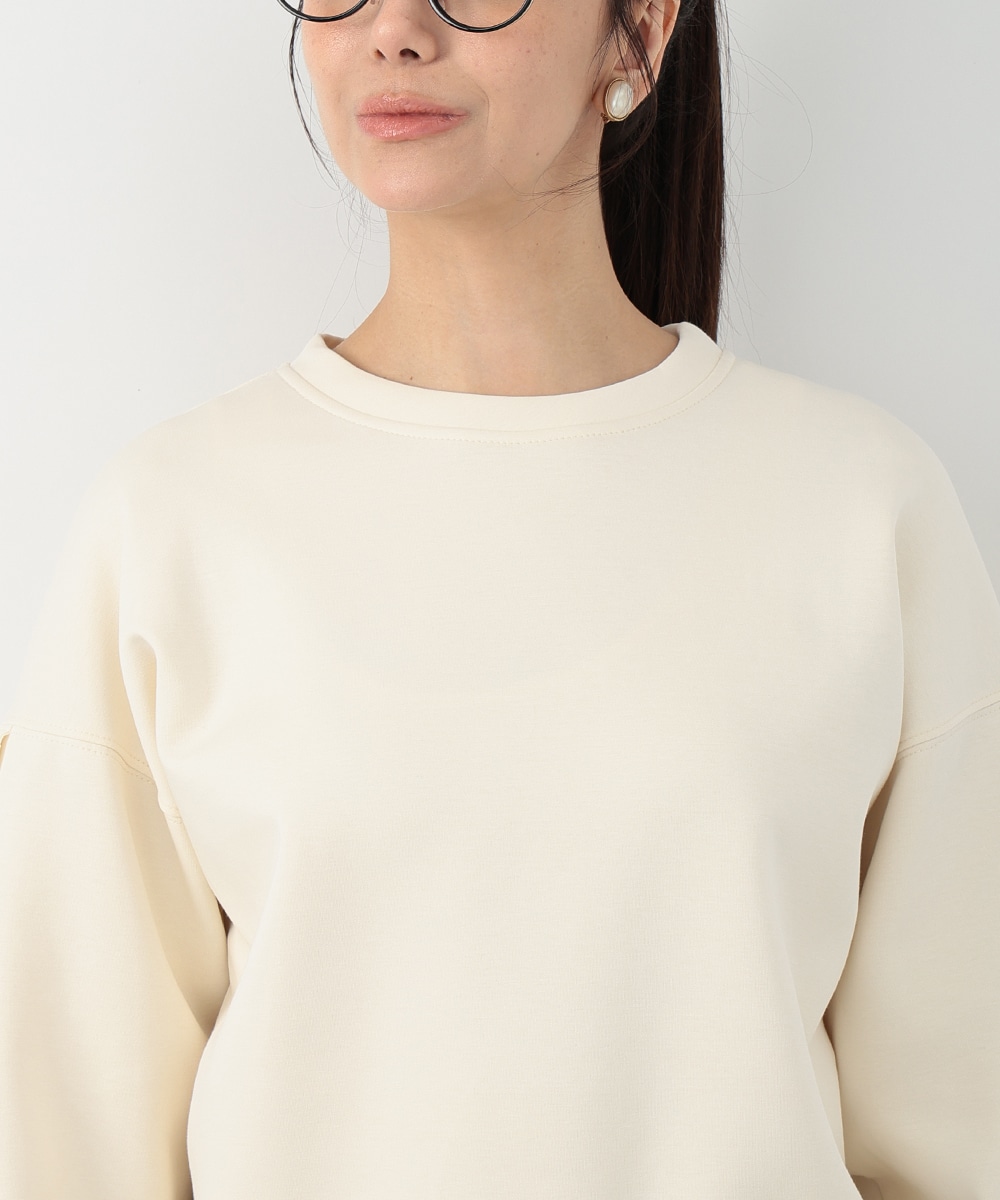 スリーブのフリルデザインがフェミニンなムードを演出するトップス。もちもちとしたスクーバ素材を使用し、立体感のあるシルエットに仕上げました。カジュアルになりすぎず、大人でも着やすいデザインにこだわっています。スカートはもちろん、パンツスタイルにも好相性のアイテムです。
