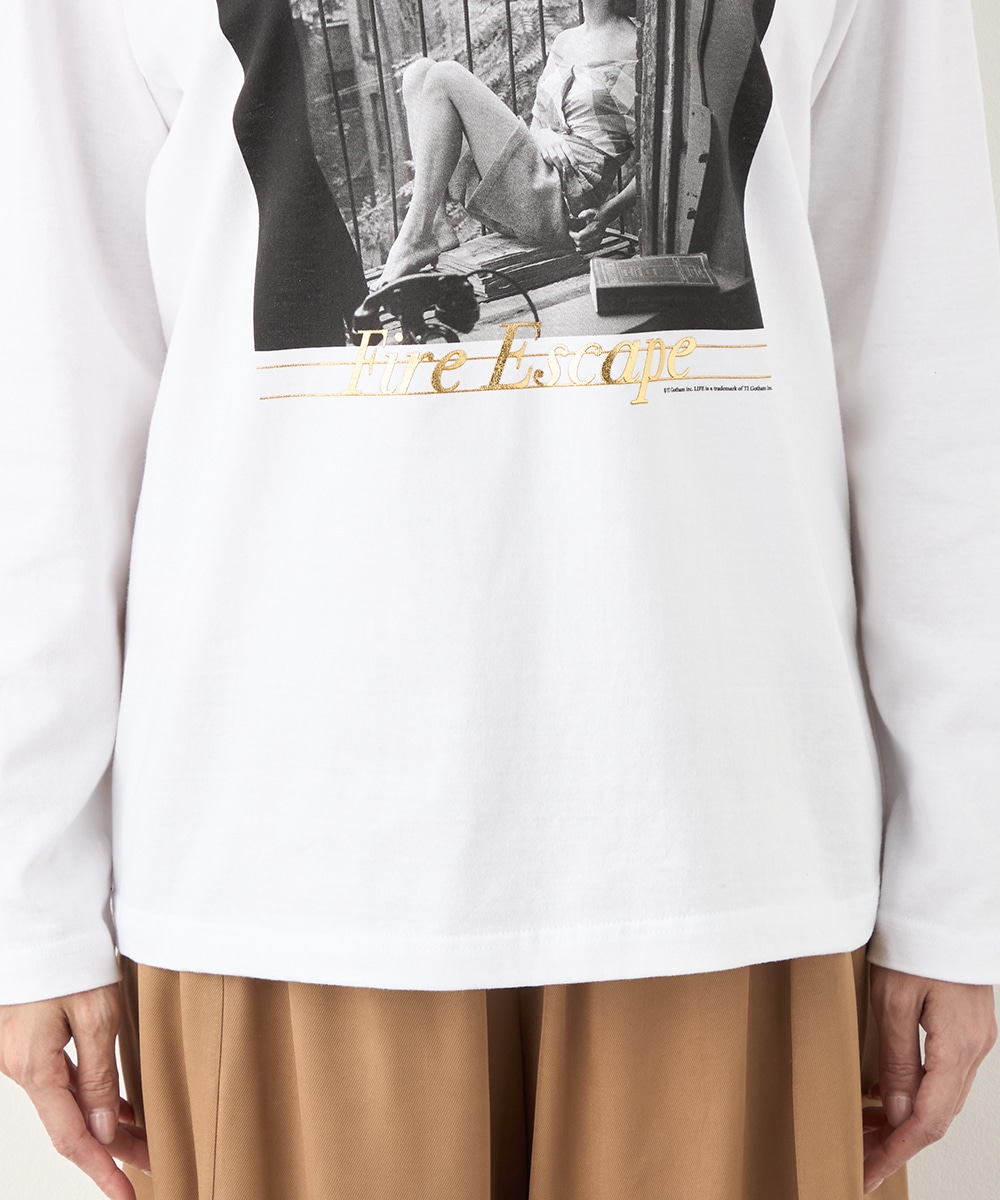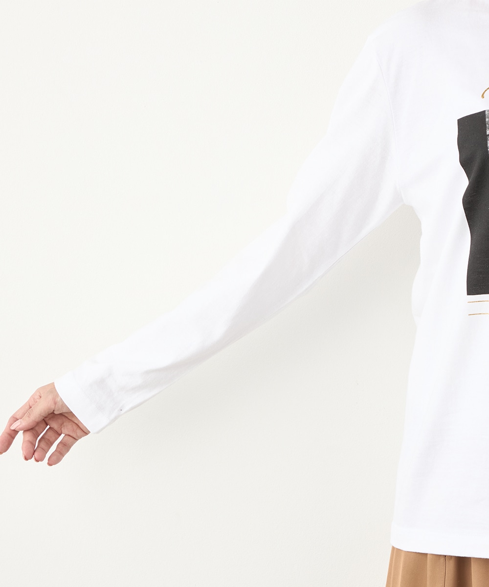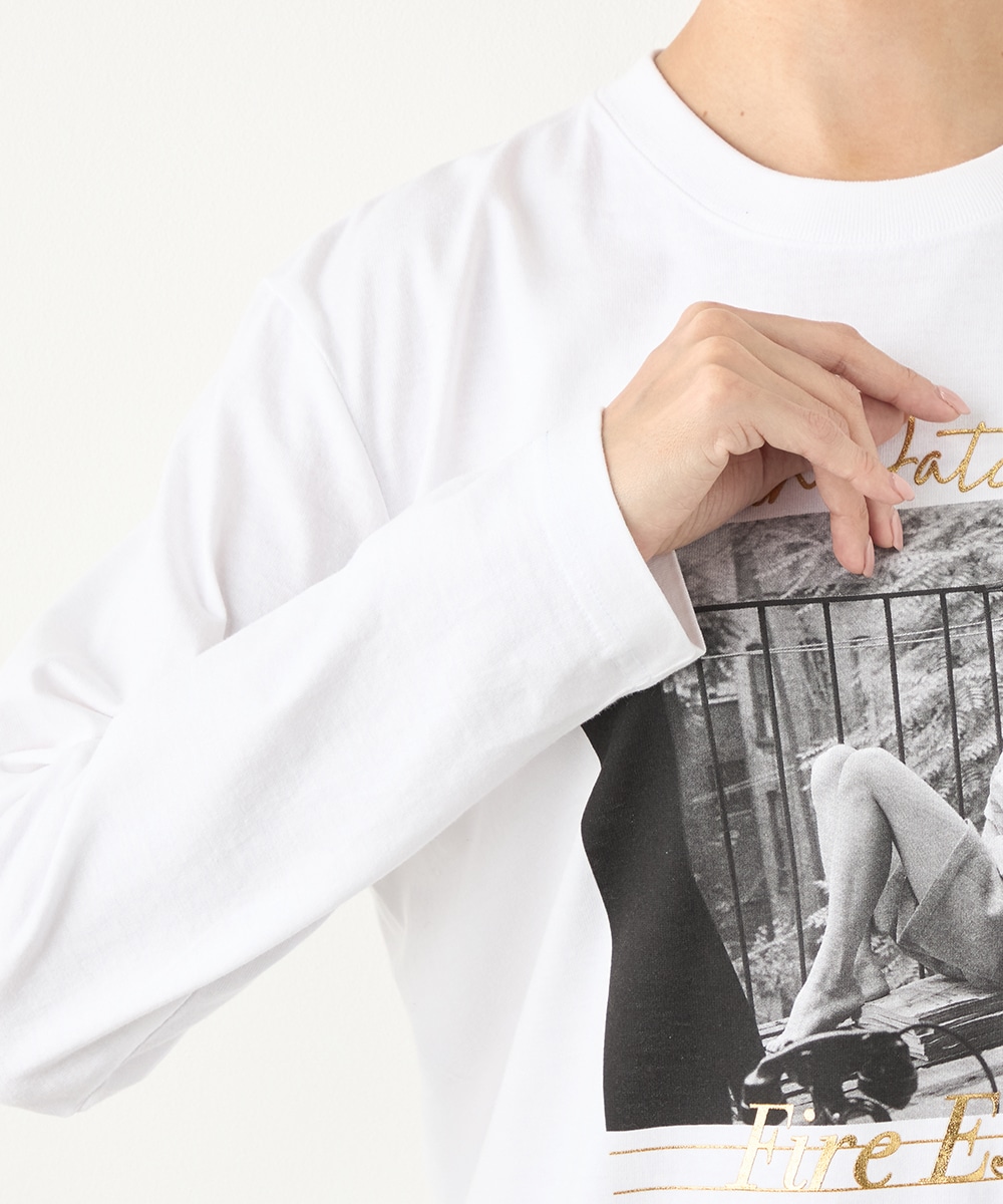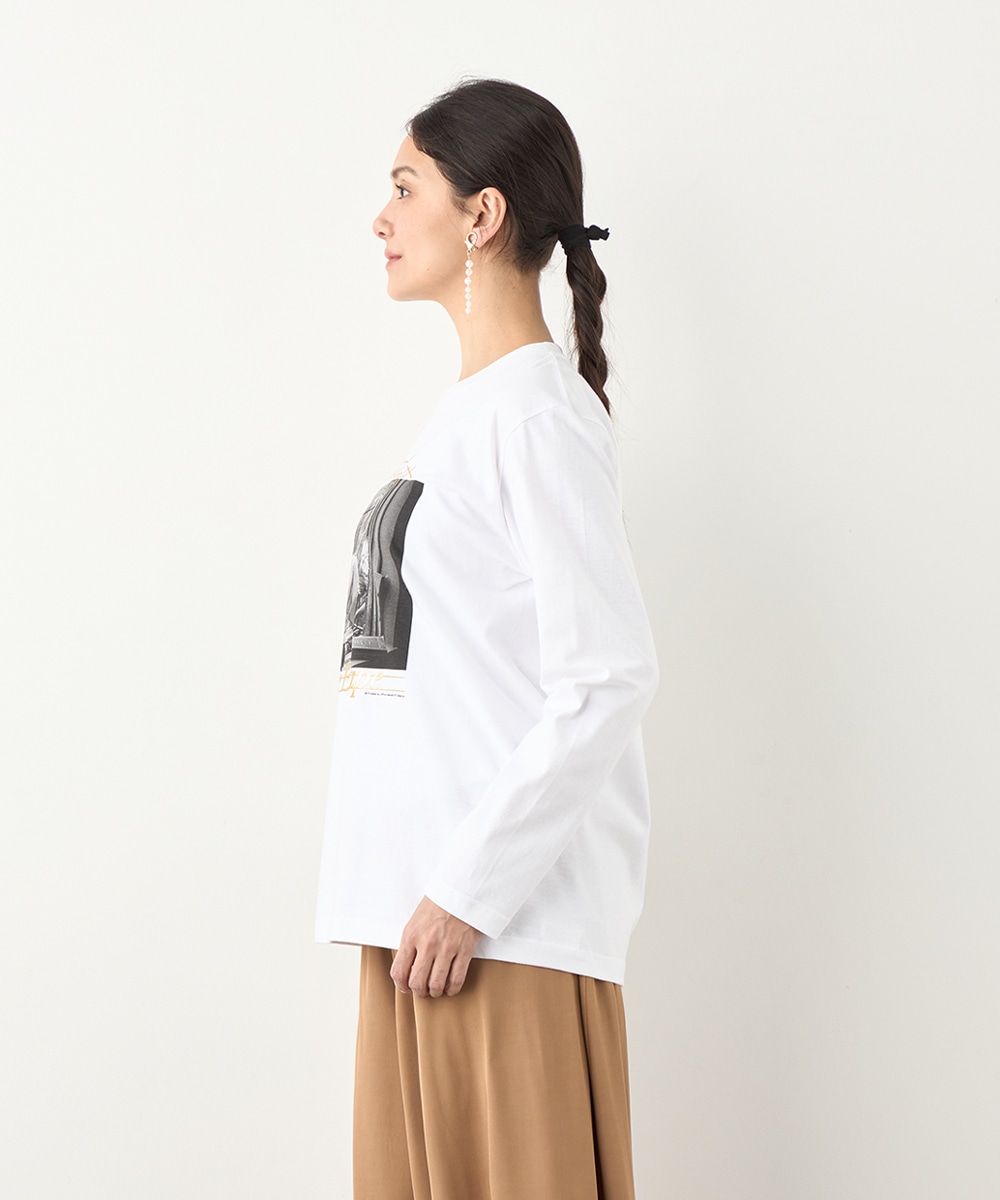 さまざまな物語が感じられる写真を転写しました。モノクロームのカラーのシックな雰囲気や大人っぽさも魅力です。箔プリントのロゴもバランス良くレイアウトしています。フロントに広くグラフィックがデザインされて、存在感十分のアイテム。カジュアルコーディネートの主役としてぴったりです。