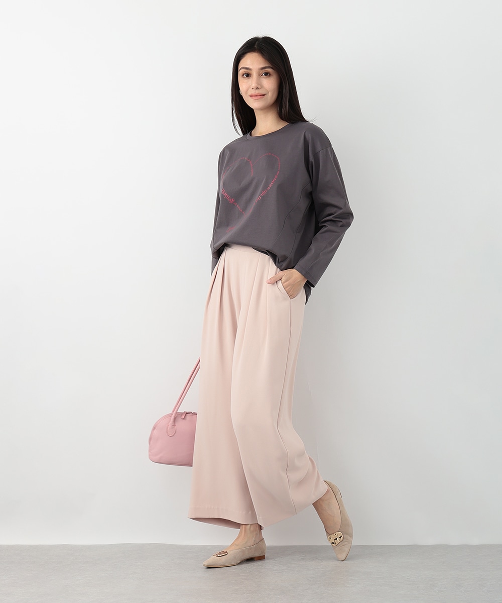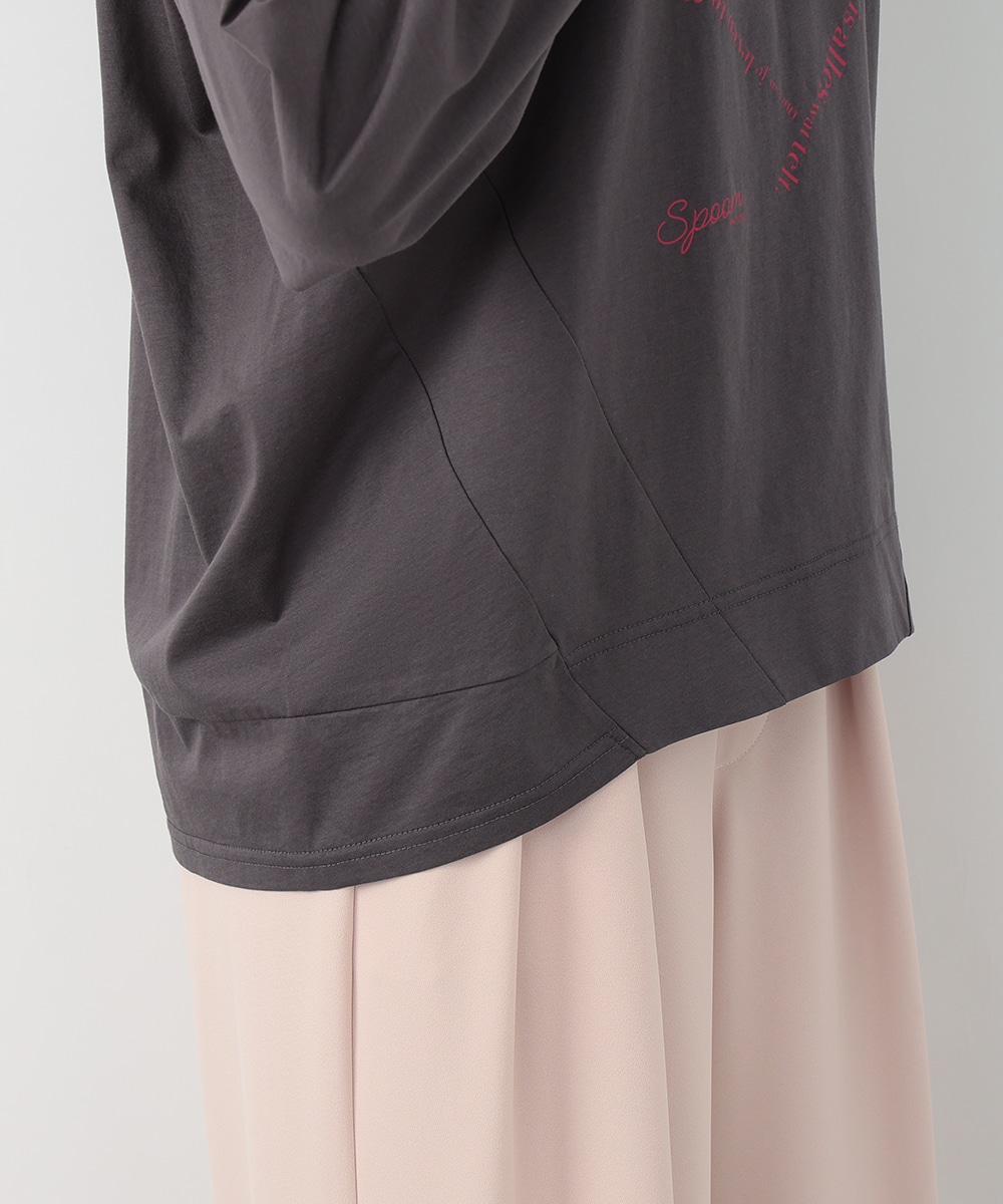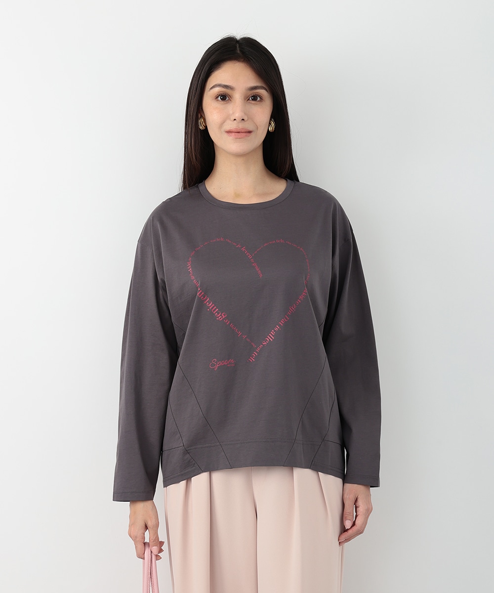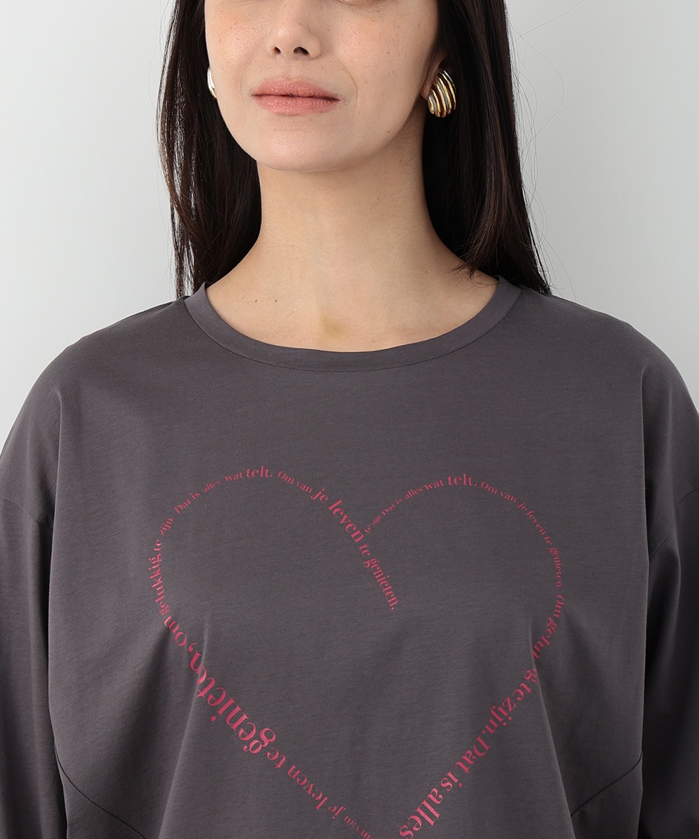 メッセージで描かれたハートプリントが印象的なロングTシャツ。落ち着いたカラーが甘さを程よく抑え、大人でも取り入れやすい一枚です。前後差のある着丈と切り替えデザインで、さりげなく体型をカバー。きれいめボトムと合わせれば、カジュアルすぎない着こなしが楽しめます。