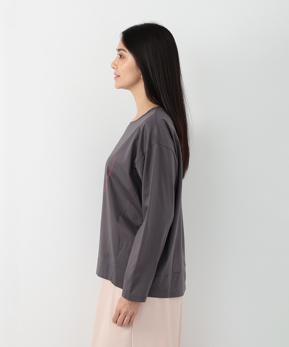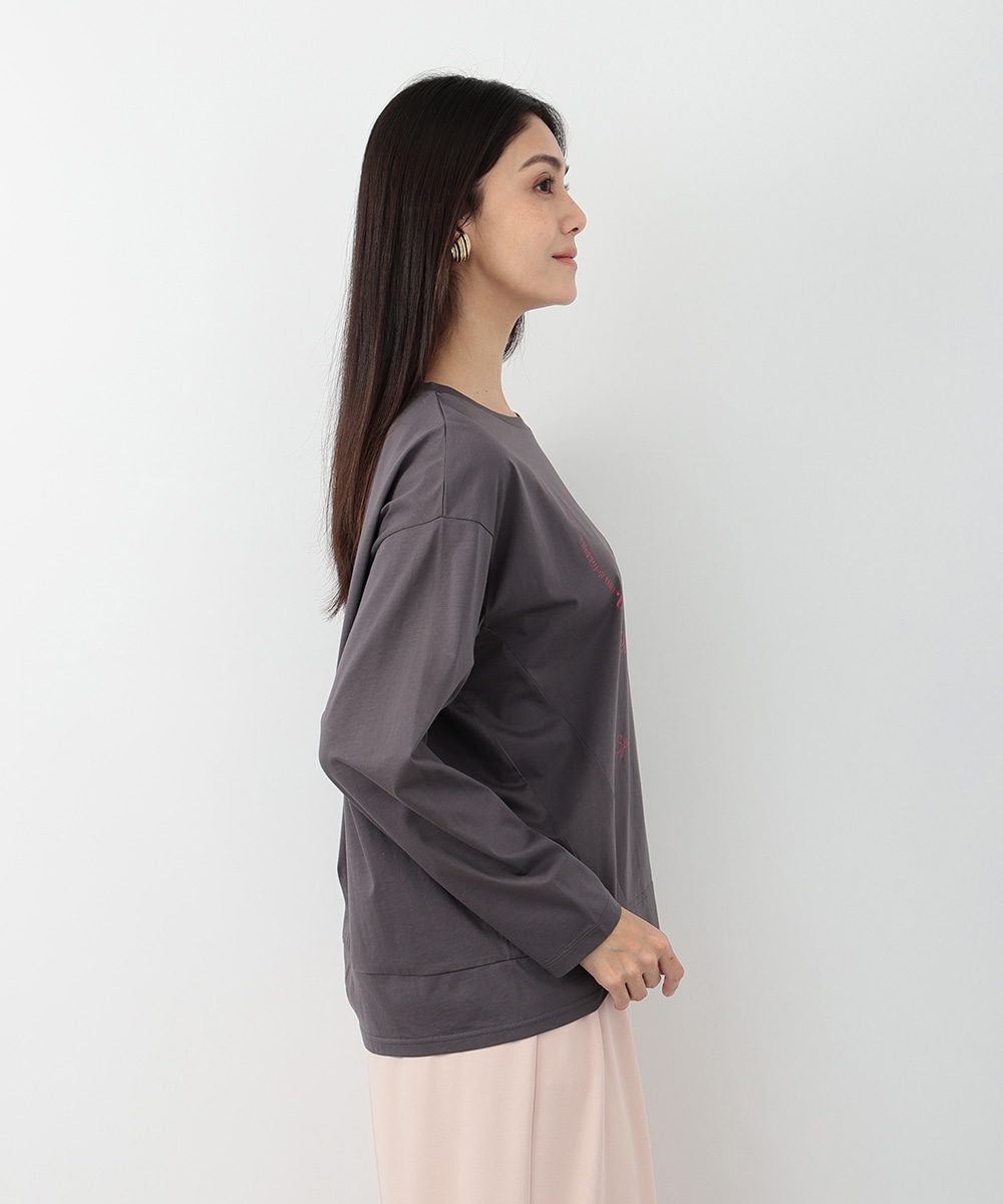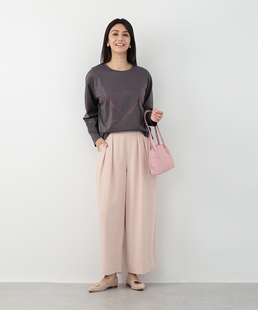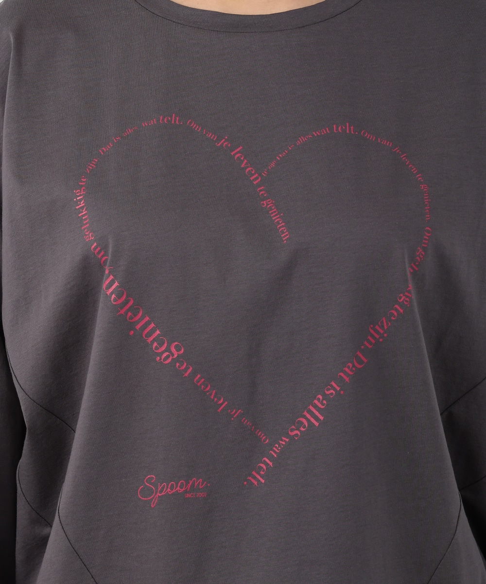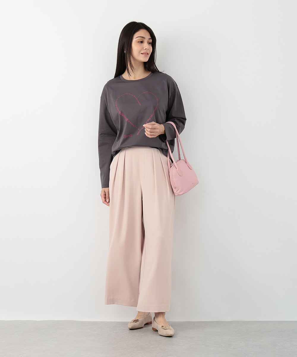 メッセージで描かれたハートプリントが印象的なロングTシャツ。落ち着いたカラーが甘さを程よく抑え、大人でも取り入れやすい一枚です。前後差のある着丈と切り替えデザインで、さりげなく体型をカバー。きれいめボトムと合わせれば、カジュアルすぎない着こなしが楽しめます。