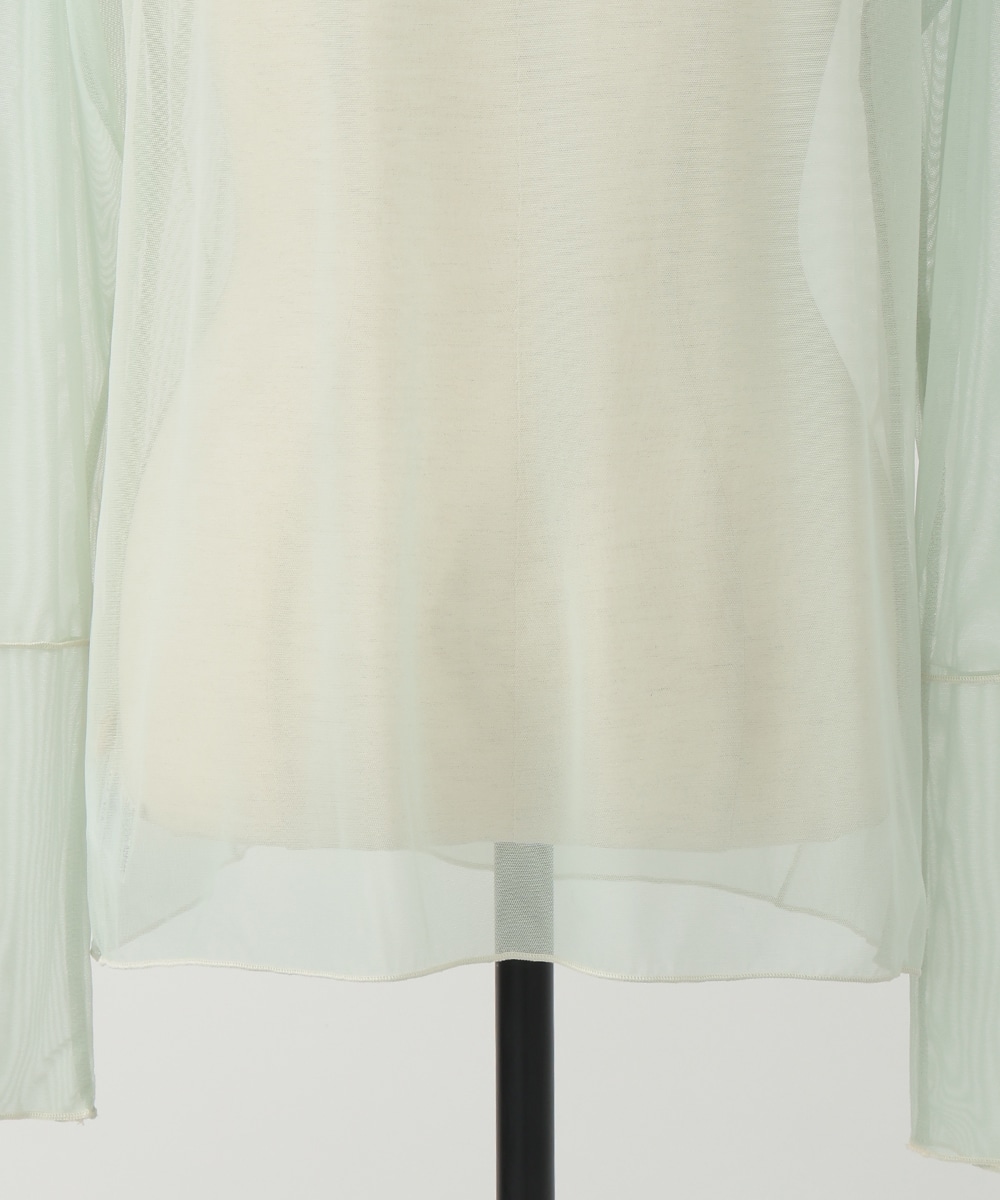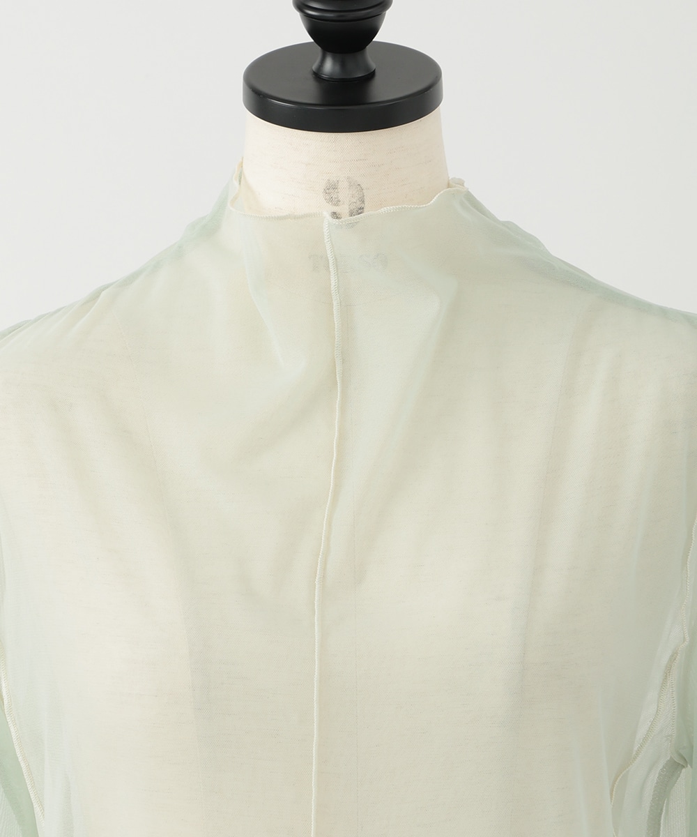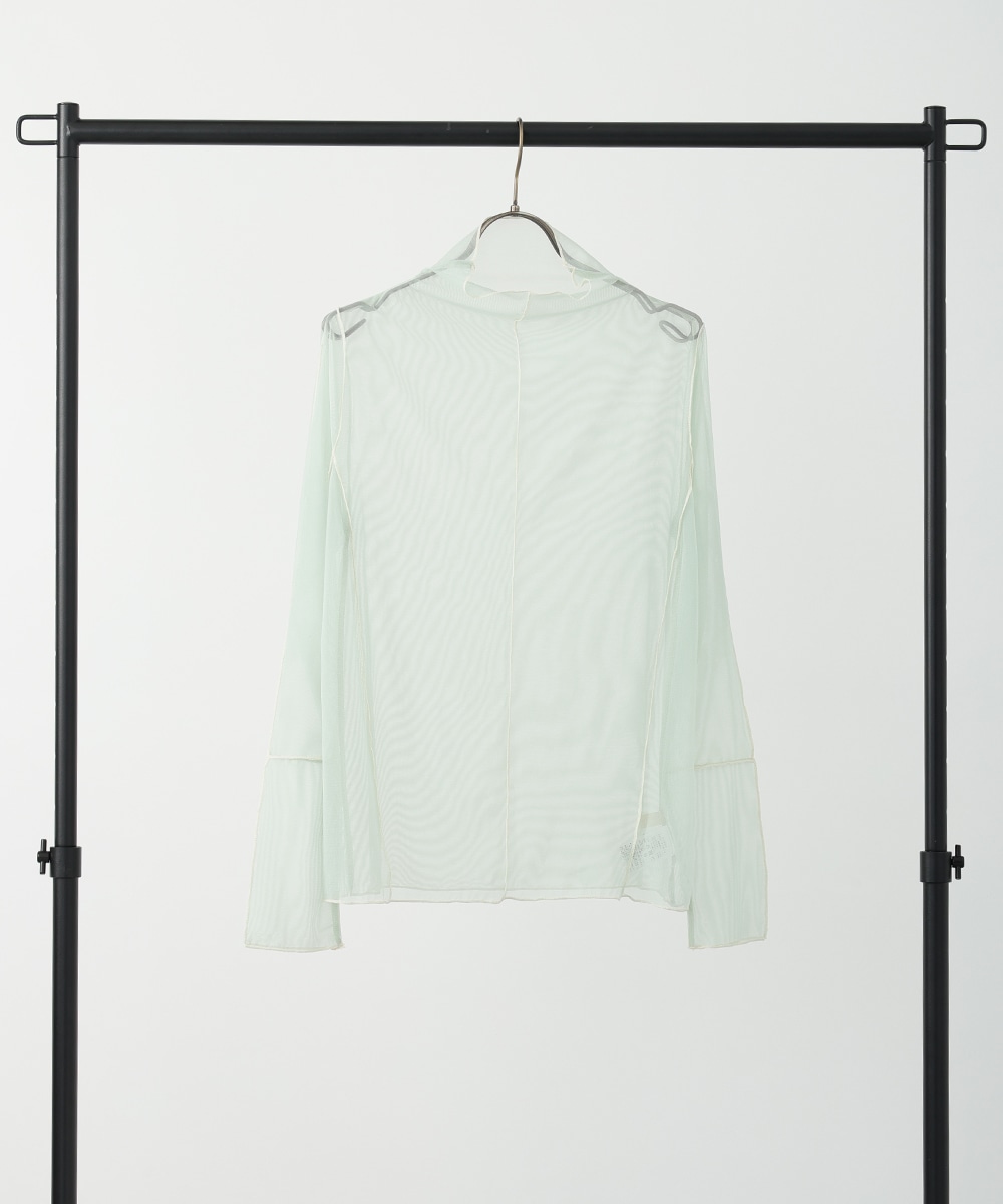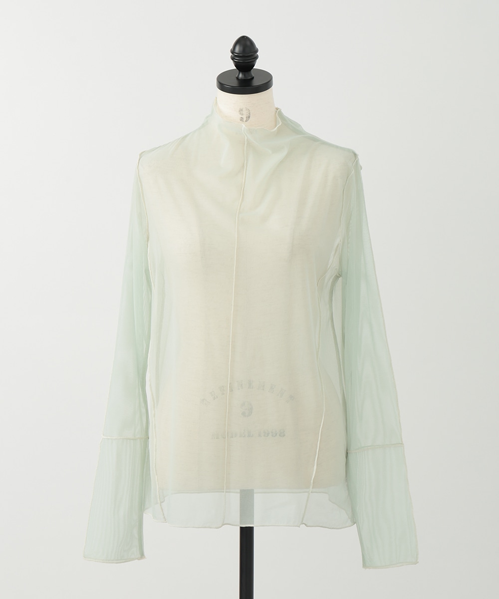 淡いカラーに配色メローを効かせた、シアーなメッシュ素材のハイネックトップス。首元と袖口のラインがさりげなく映え、コーデに軽やかさを添えます。すっきりとしたシルエットとなめらかな着心地で、レイヤードしやすいのもポイント。季節の変わり目にも重宝する一枚です。