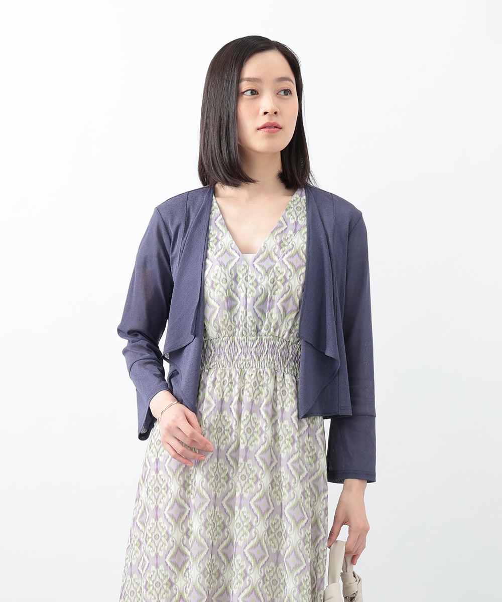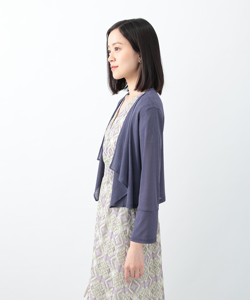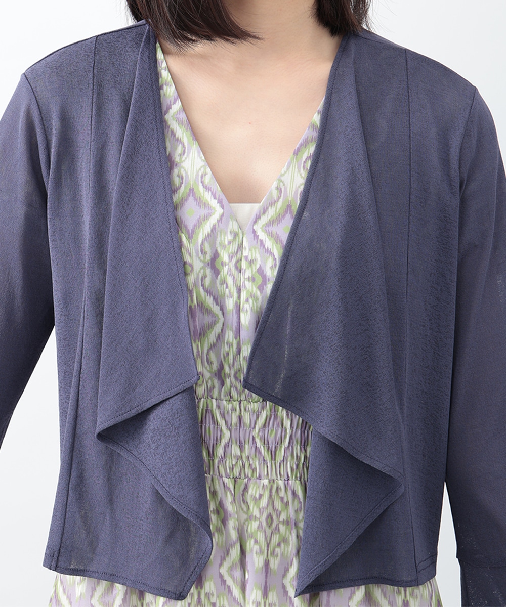 ボタンレスでひらりとなびくデザインが女性らしさを演出するカーディガン。袖口はゆとりのあるシルエットになっており、エレガントな風合いをプラスします。ほんのりとした透け感を楽しめるシアー素材がポイント。お手持ちのワンピースやキャミソールに重ねたスタイリングがおすすめです。