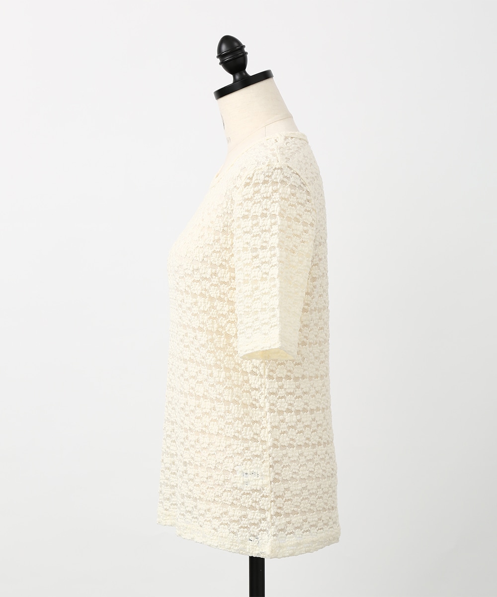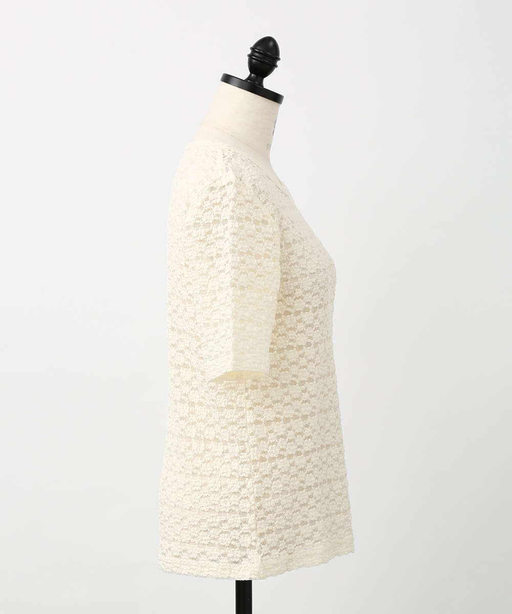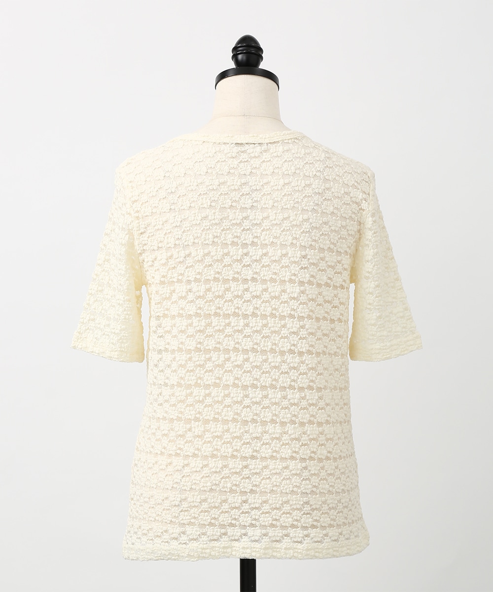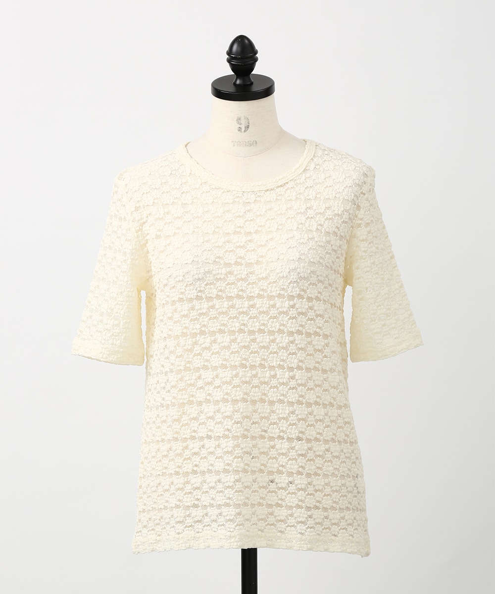 凹凸のある繊細なレース調の編みが特徴のストレッチプルオーバー。表情のある素材感でシンプルながらも一枚で着映えし、身体のラインを拾いにくい程よいゆとりも魅力です。サロペットやキャミワンピースのインナーとして重ねれば奥行きのある着こなしに仕上がります。
