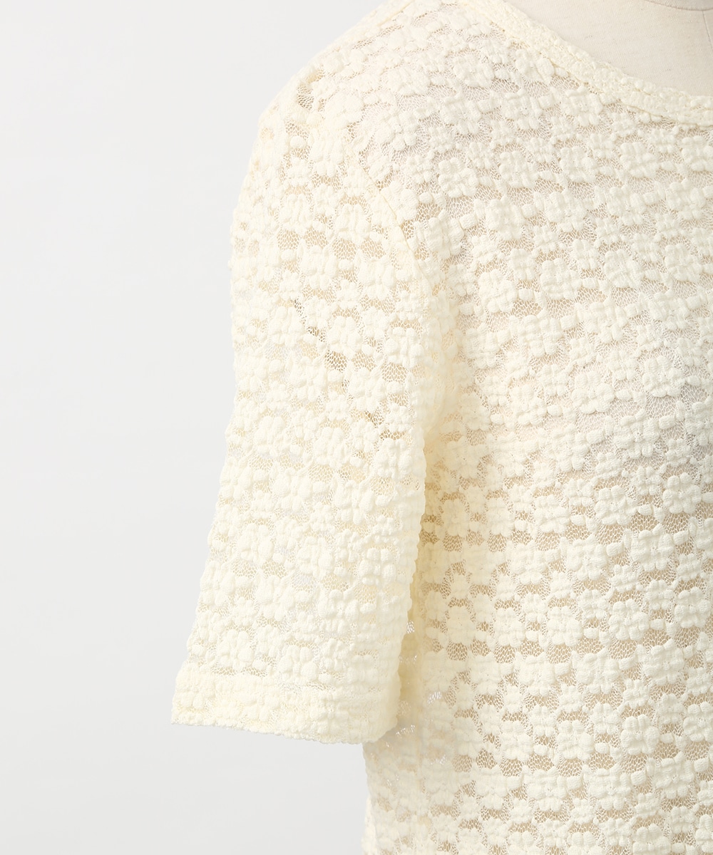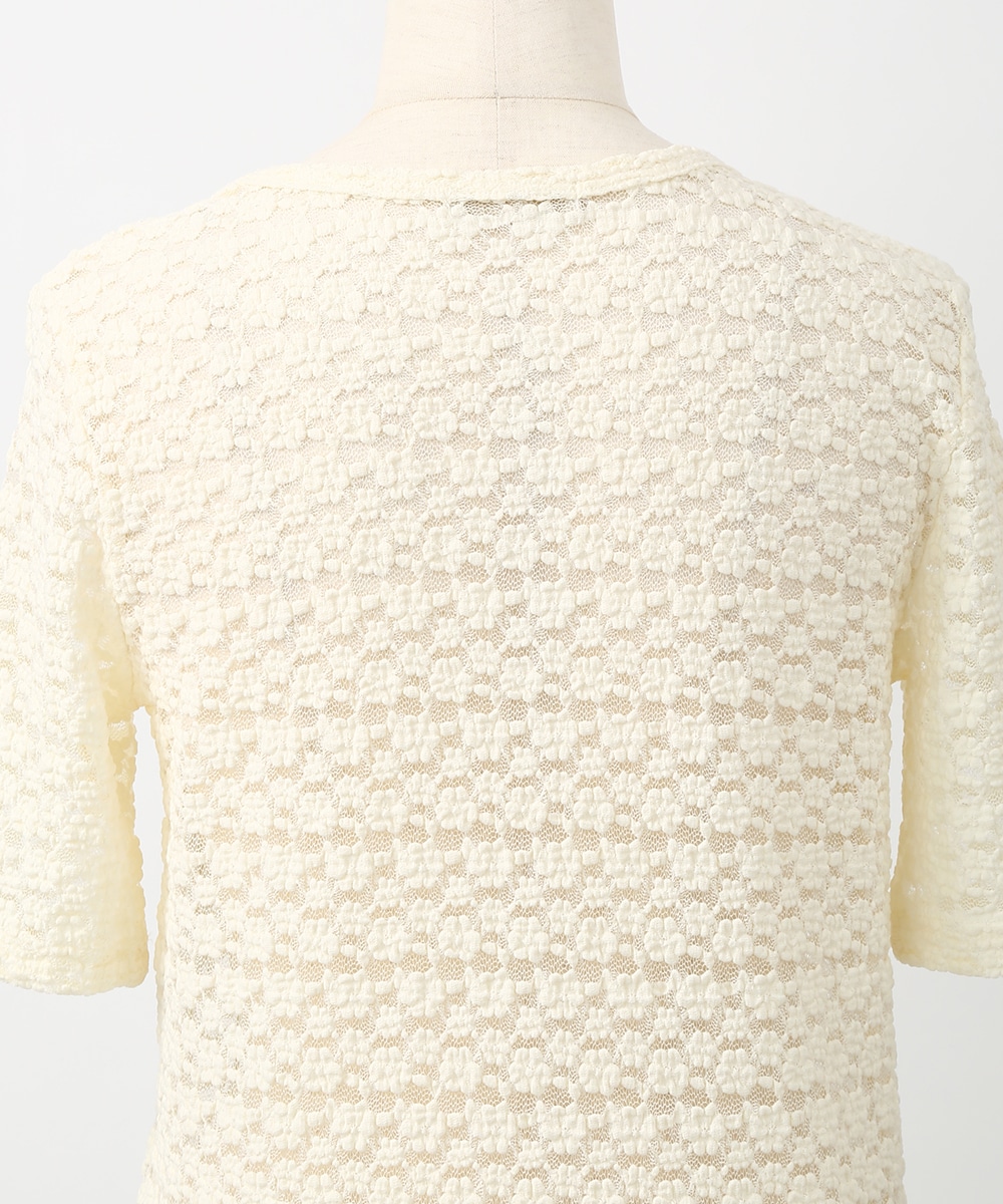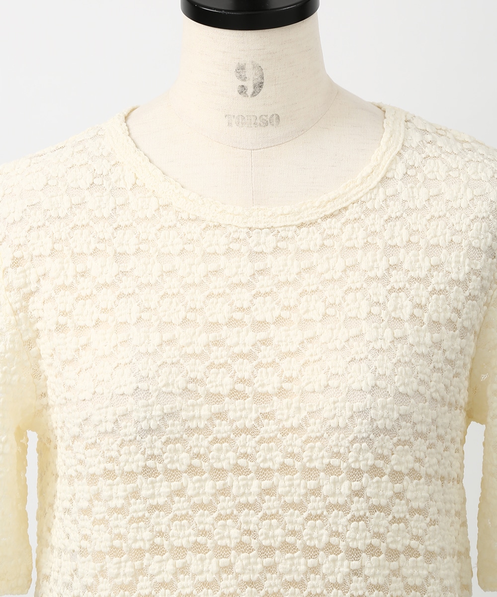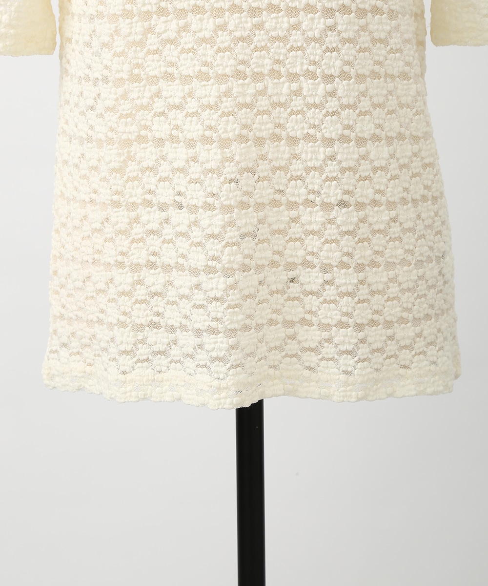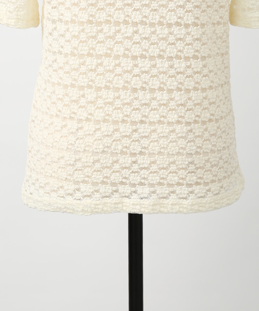 凹凸のある繊細なレース調の編みが特徴のストレッチプルオーバー。表情のある素材感でシンプルながらも一枚で着映えし、身体のラインを拾いにくい程よいゆとりも魅力です。サロペットやキャミワンピースのインナーとして重ねれば奥行きのある着こなしに仕上がります。