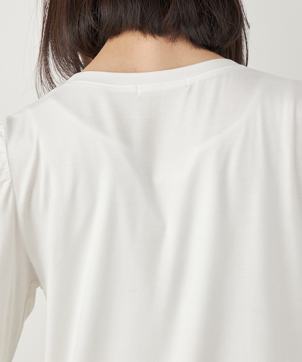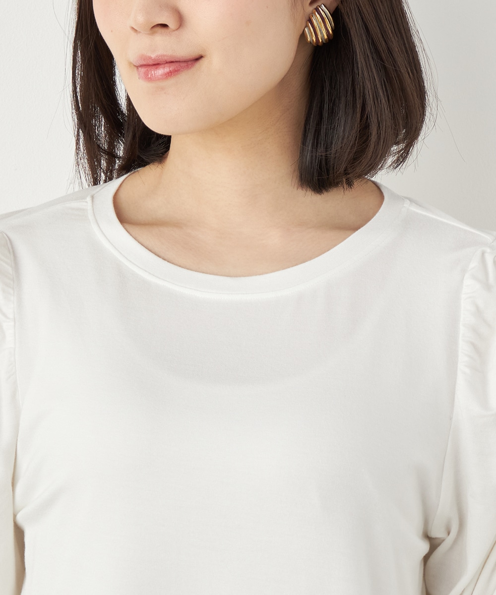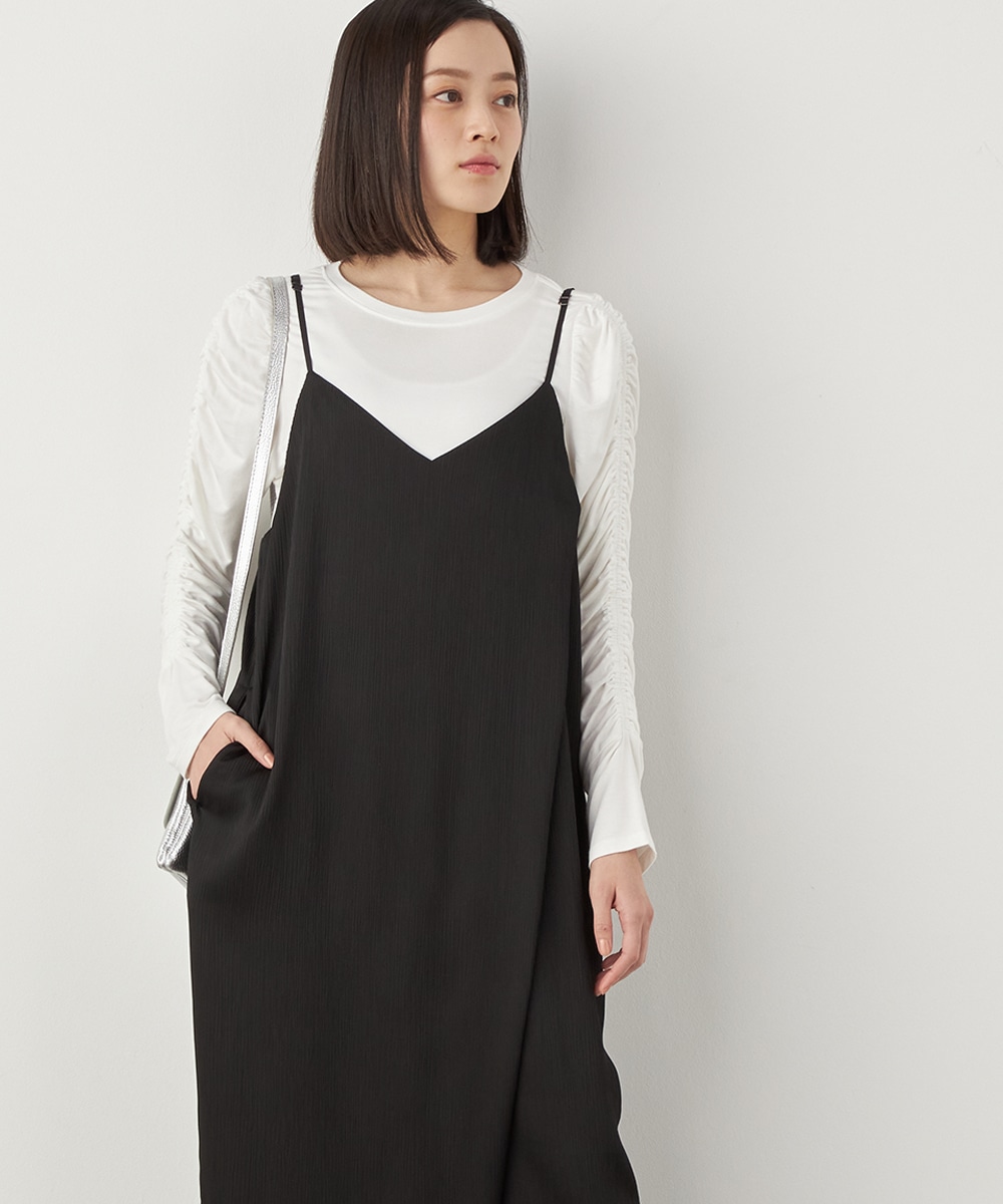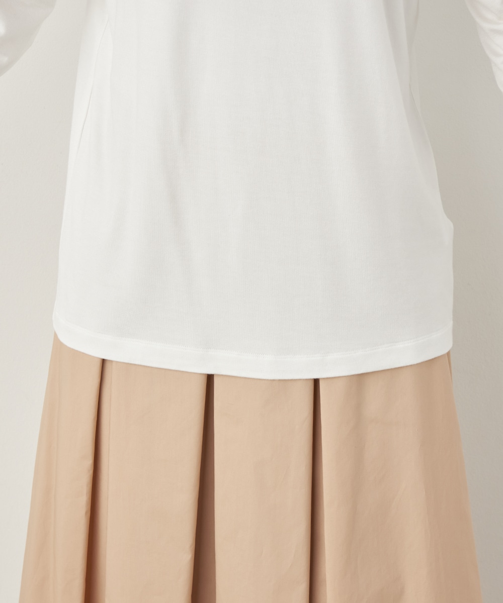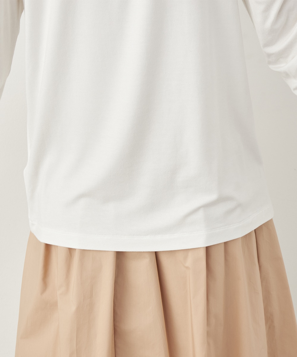 使い勝手が良いベーシックな無地のデザインながらも、印象的なアイテムです。ネックの開きはほどよく、デコルテラインがきれいに見えます。身頃はゆとりを出しすぎず、すっきりとした印象のシルエットを採用。一枚着として活用するのはもちろん、キャミワンピースのインナーにもおすすめです。