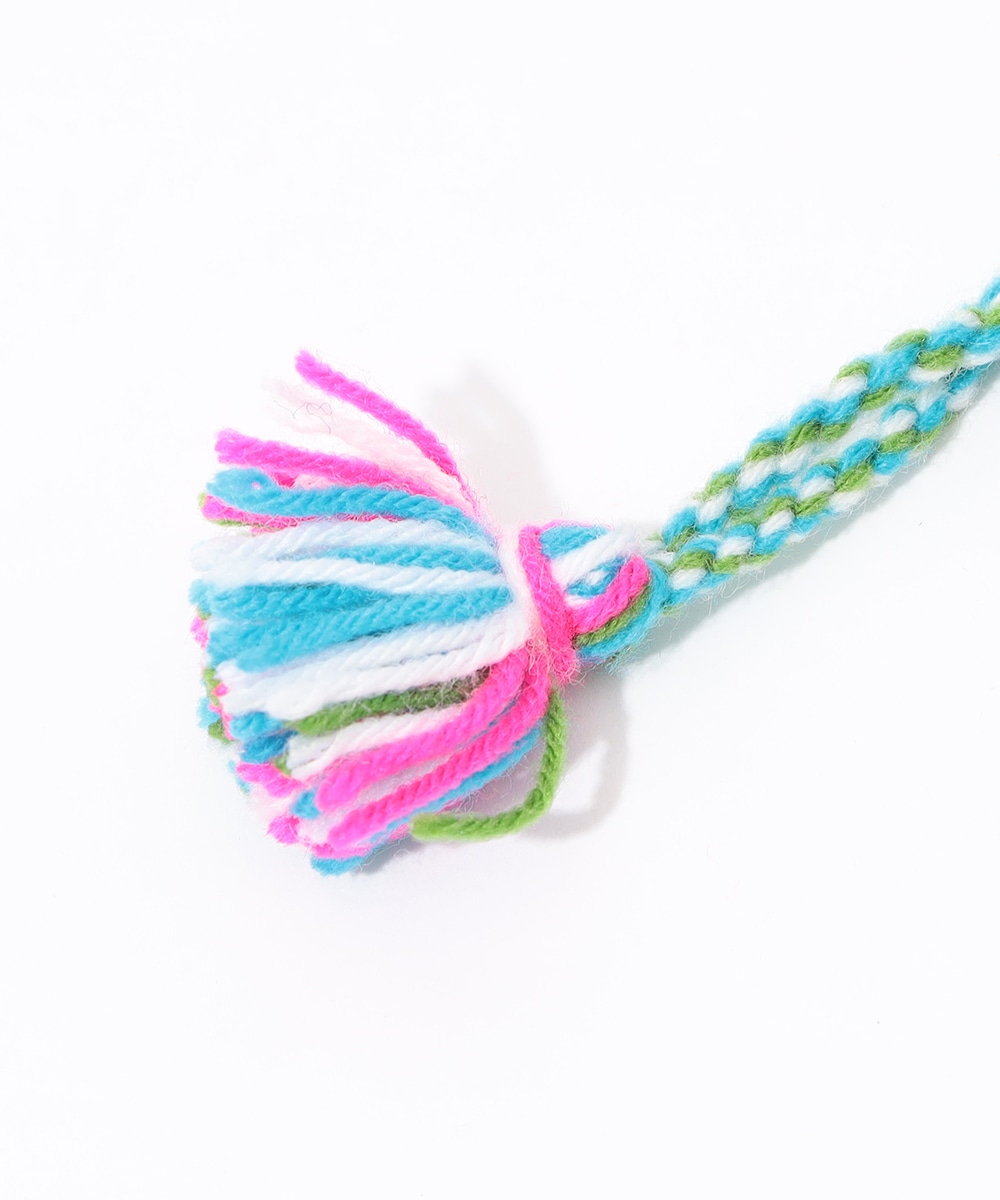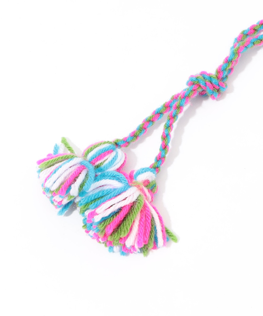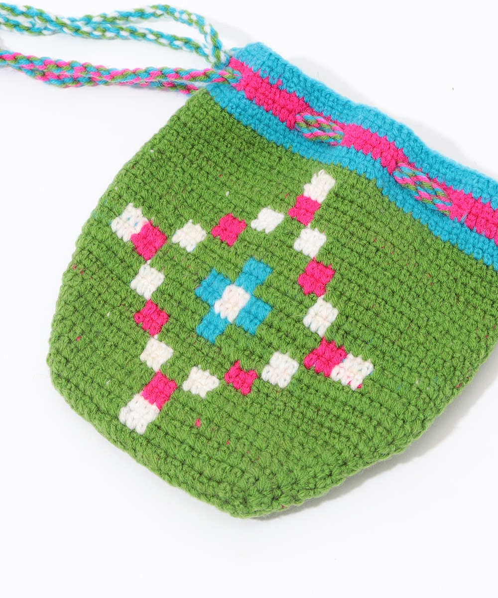 幾何学柄を編み入れた民族調のデザインです。口部分のコードはミックスカラーでポップな雰囲気に仕上げています。両端にあしらったタッセルもキュートさのポイント。モバイルアクセサリーやサプリメントなどの収納にも適した小ぶりのサイズ感。プレゼントにもおすすめです。