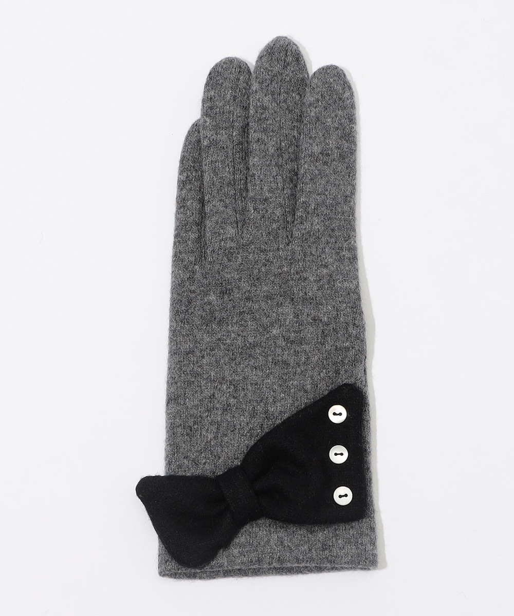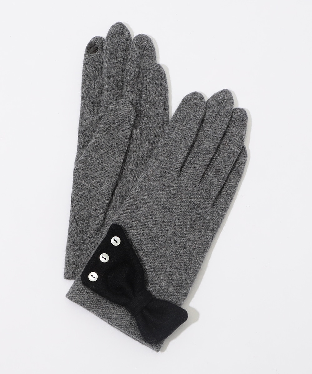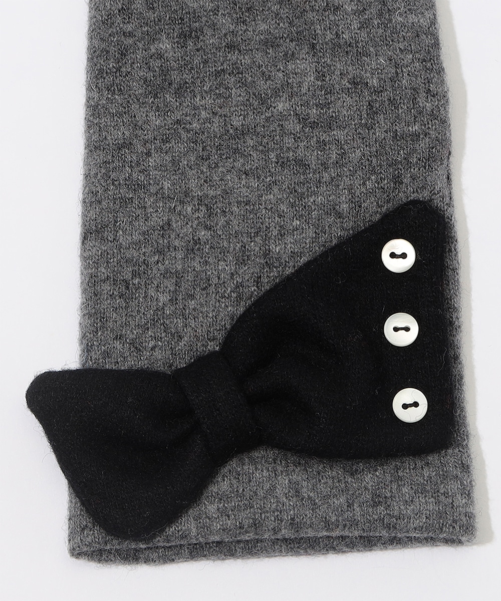 配色のリボンモチーフが目を惹くニットグローブです。フェミニンでありながら気品も漂い、カジュアルからきれいめまで様々な装いに取り入れられます。親指と人差し指がタッチパネル対応なため、身につけたままスマホ操作も可能。暖かなニット生地でフィット感もよく、手元の防寒対策に最適なアイテムです。