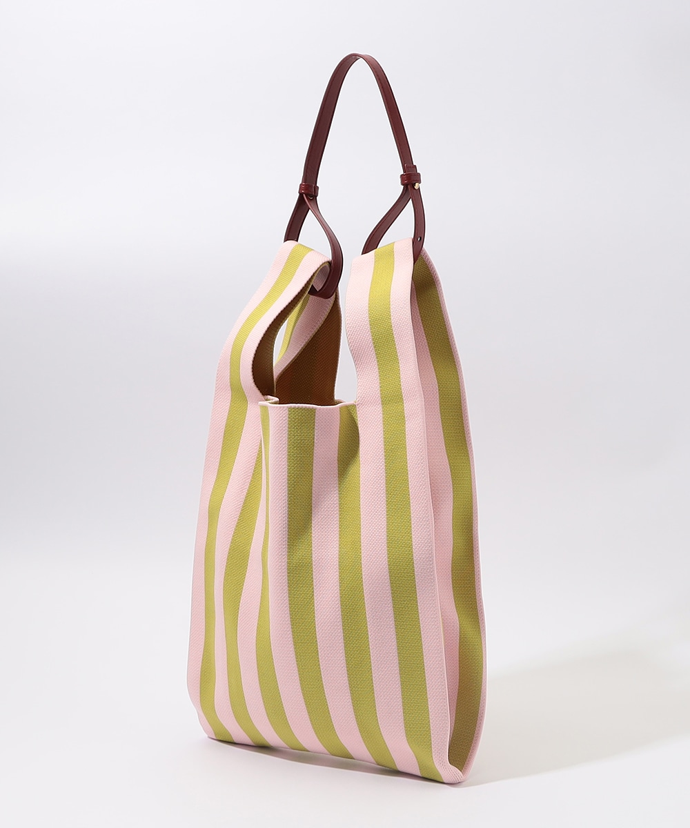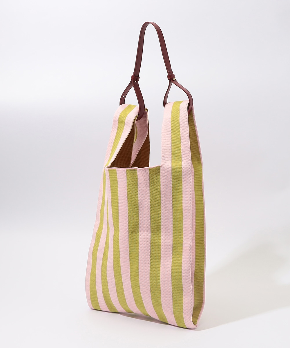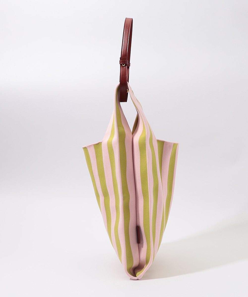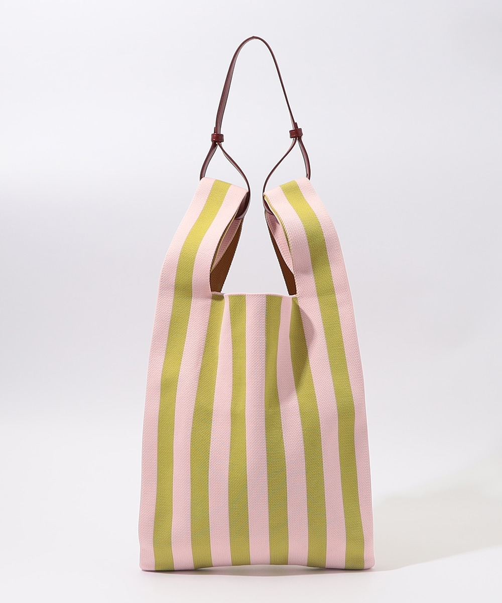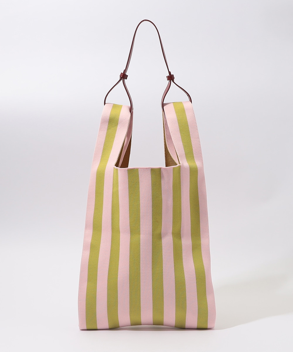 カラフルなストライプ柄が視線を誘うニットバッグです。タフで柔らかく、軽やかな持ち心地のニット生地を使用。ブランドタグやストラップには異素材を用い、高級感を高めています。そのまま手持ちするほか、ストラップを装着すると肩がけも可能。コンパクトに畳めるためサブバッグや持ち運びにも便利なアイテムです。