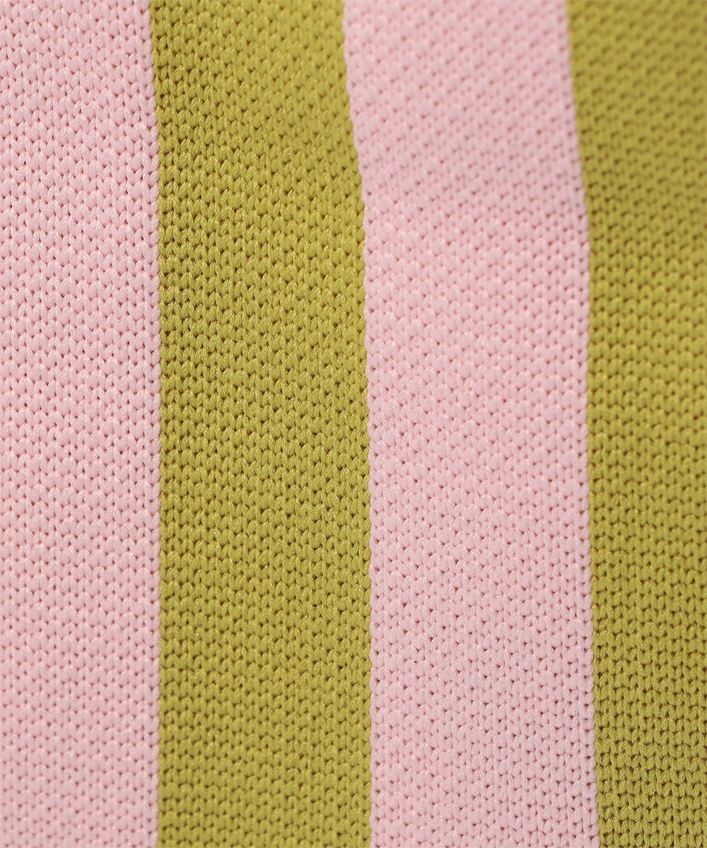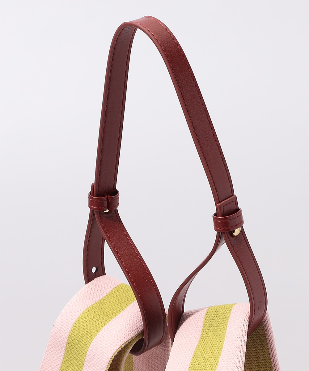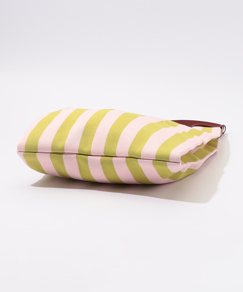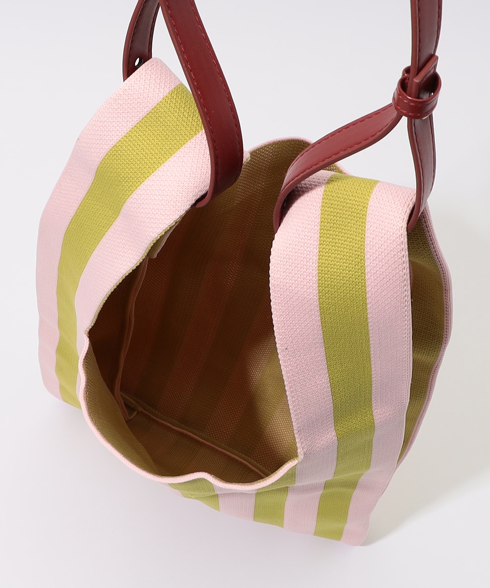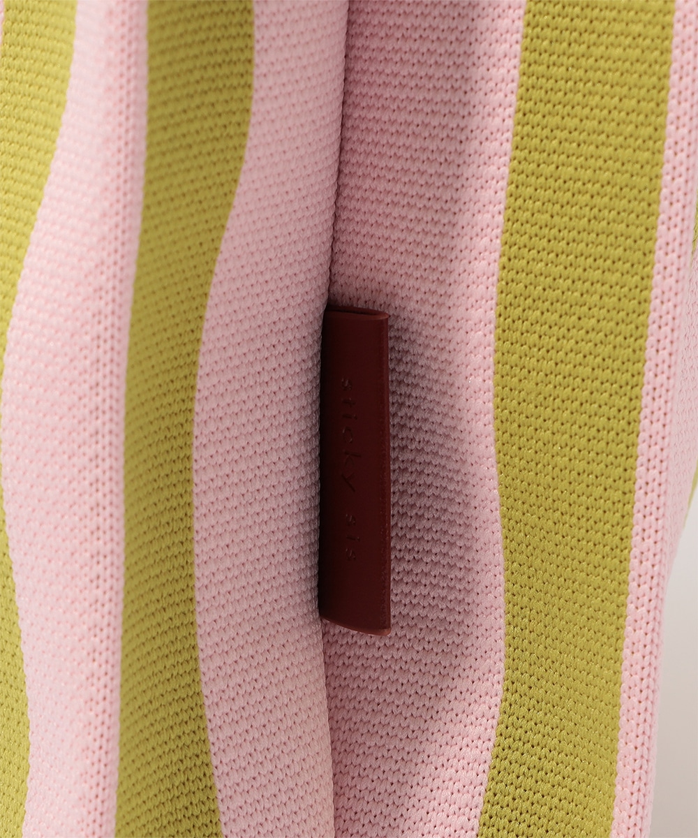 カラフルなストライプ柄が視線を誘うニットバッグです。タフで柔らかく、軽やかな持ち心地のニット生地を使用。ブランドタグやストラップには異素材を用い、高級感を高めています。そのまま手持ちするほか、ストラップを装着すると肩がけも可能。コンパクトに畳めるためサブバッグや持ち運びにも便利なアイテムです。