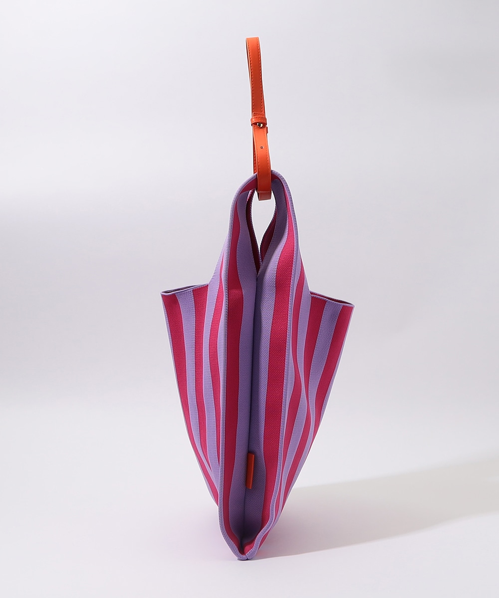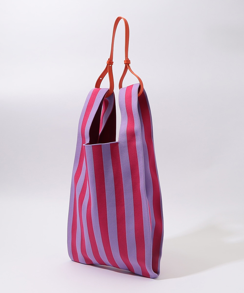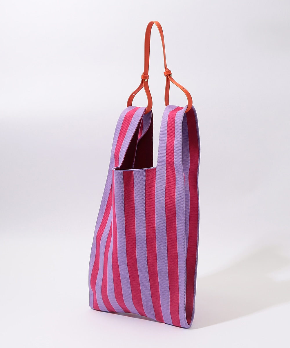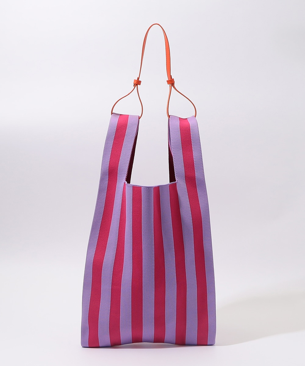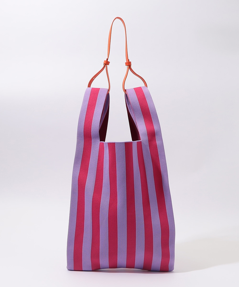 カラフルなストライプ柄が視線を誘うニットバッグです。タフで柔らかく、軽やかな持ち心地のニット生地を使用。ブランドタグやストラップには異素材を用い、高級感を高めています。そのまま手持ちするほか、ストラップを装着すると肩がけも可能。コンパクトに畳めるためサブバッグや持ち運びにも便利なアイテムです。