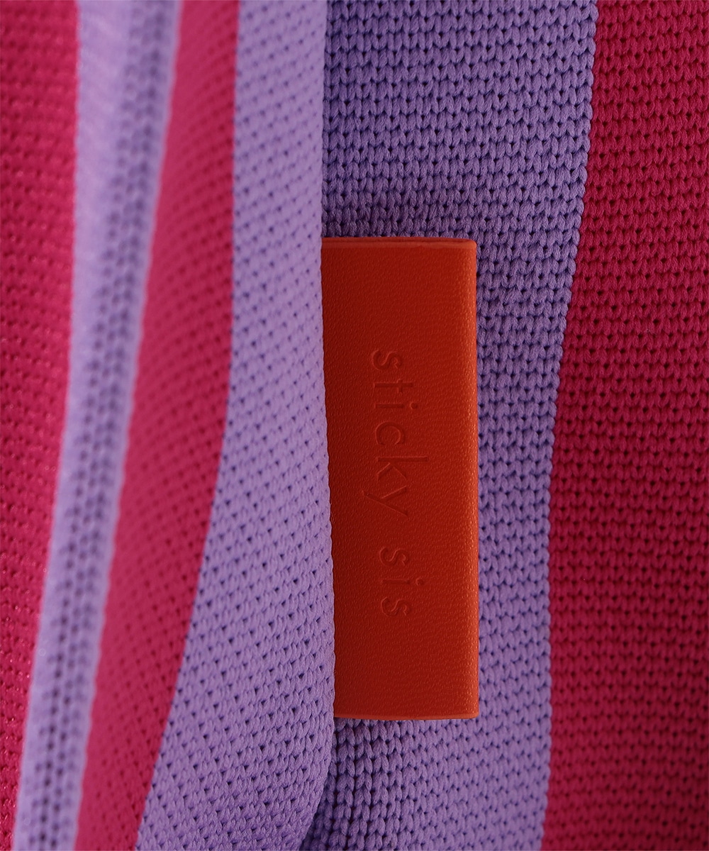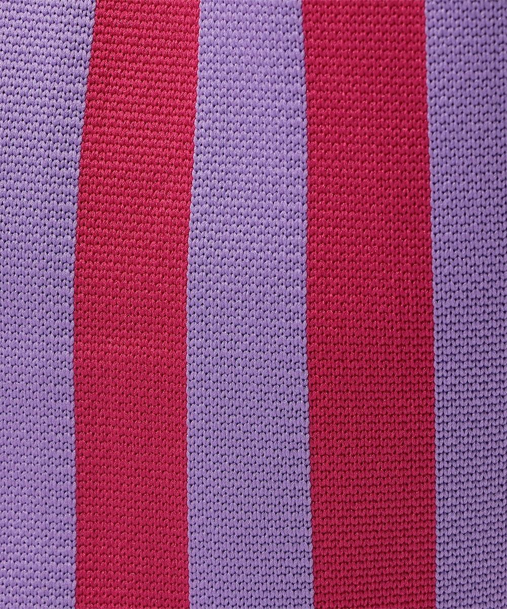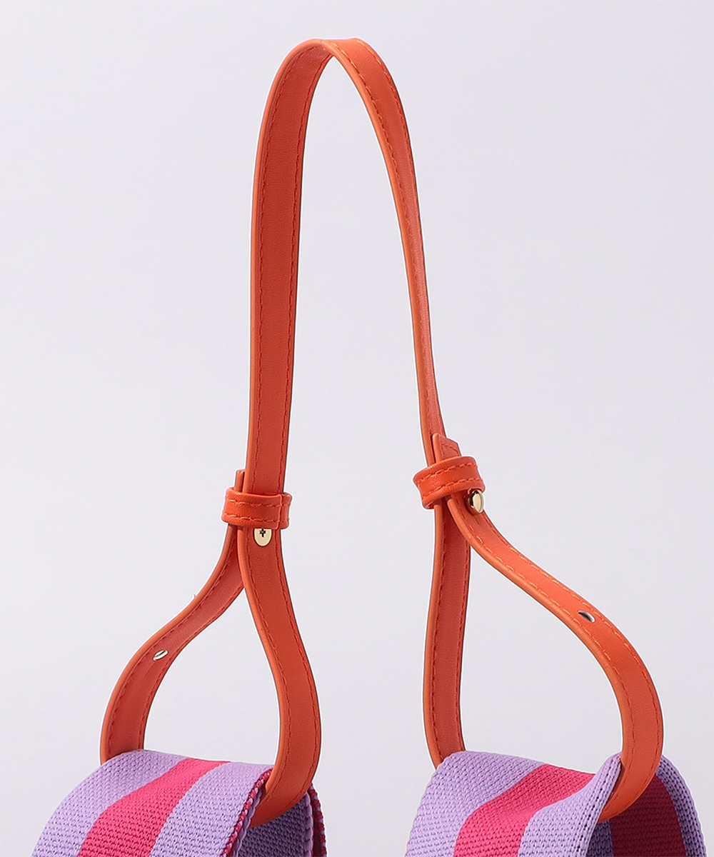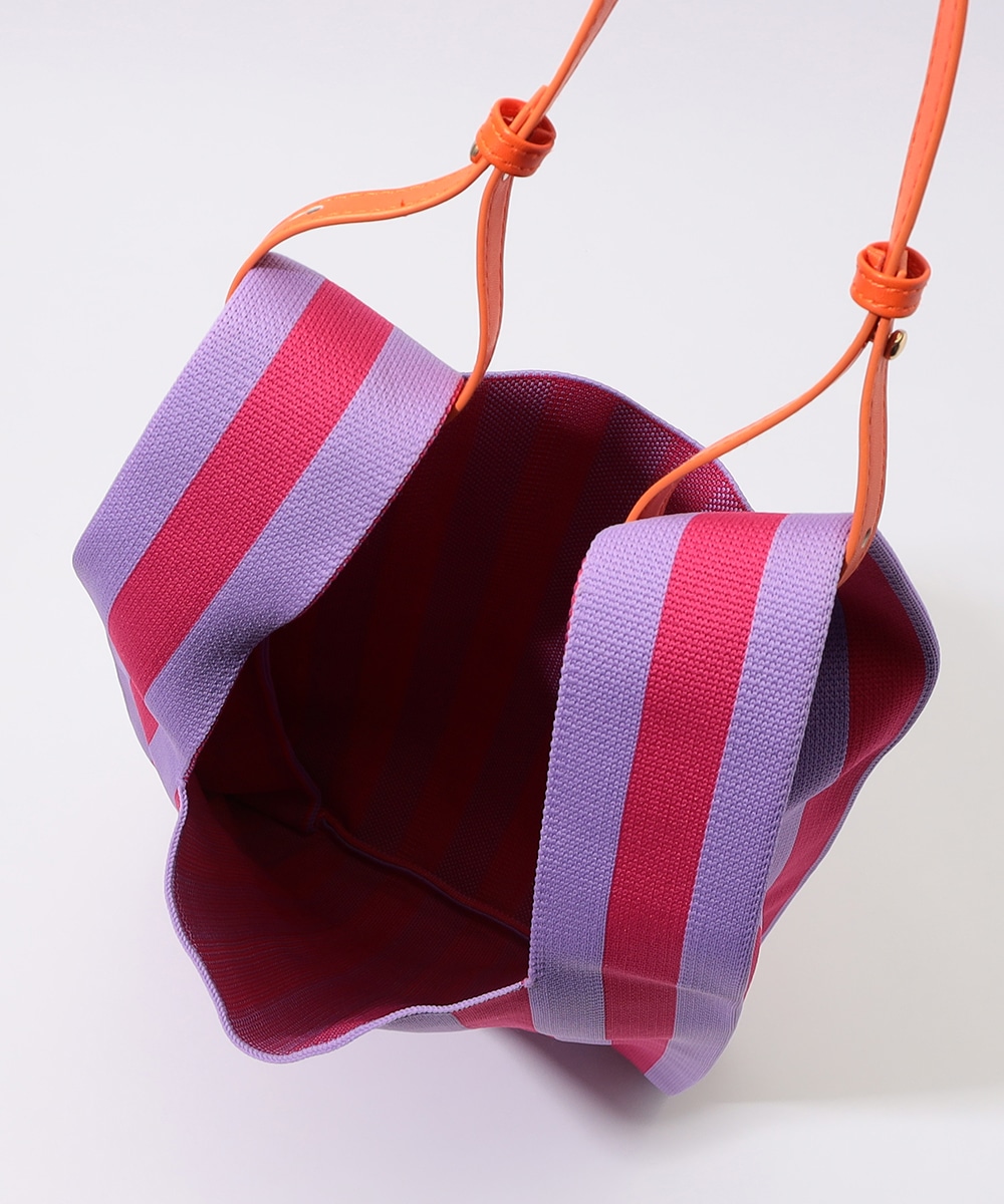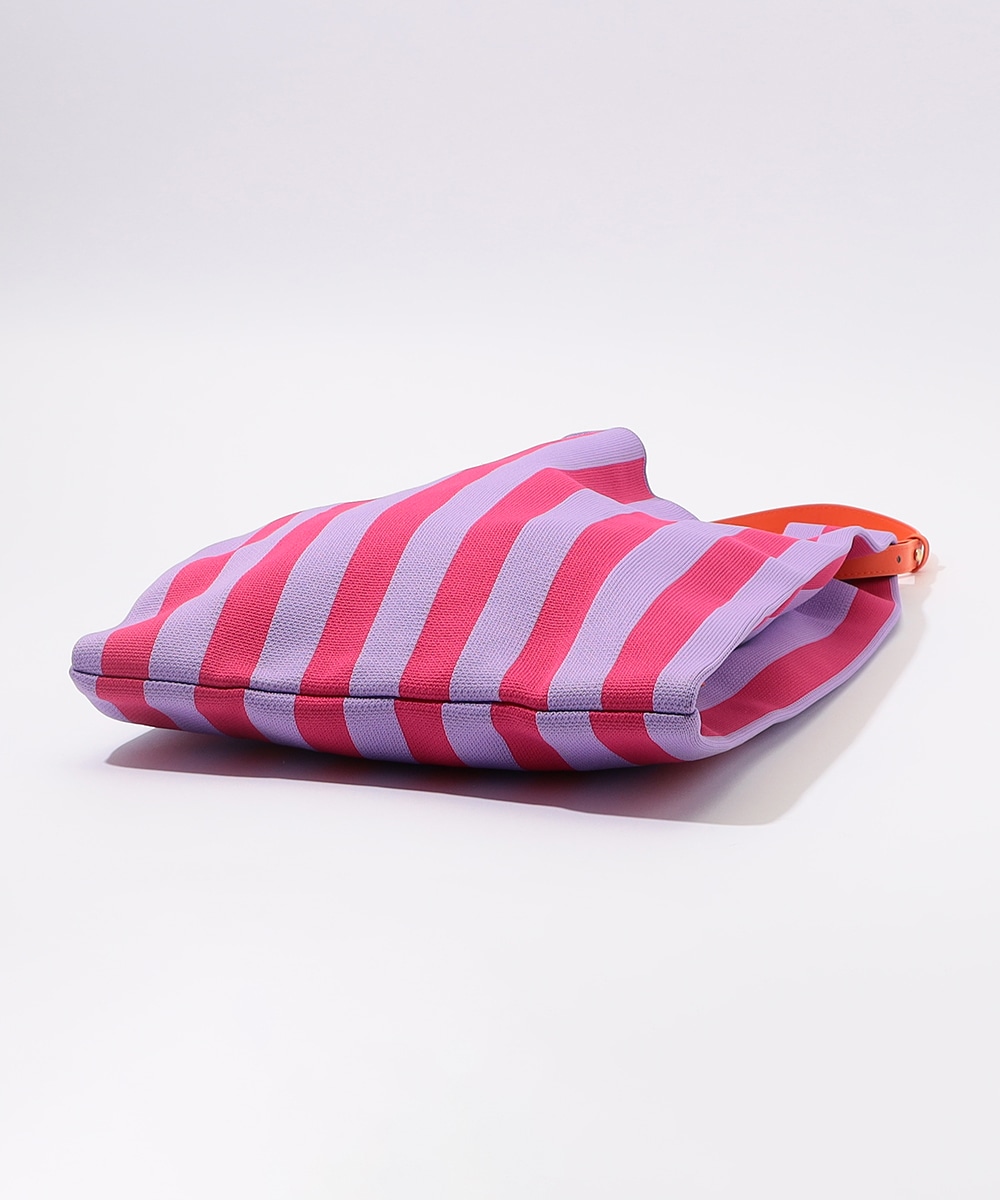カラフルなストライプ柄が視線を誘うニットバッグです。タフで柔らかく、軽やかな持ち心地のニット生地を使用。ブランドタグやストラップには異素材を用い、高級感を高めています。そのまま手持ちするほか、ストラップを装着すると肩がけも可能。コンパクトに畳めるためサブバッグや持ち運びにも便利なアイテムです。