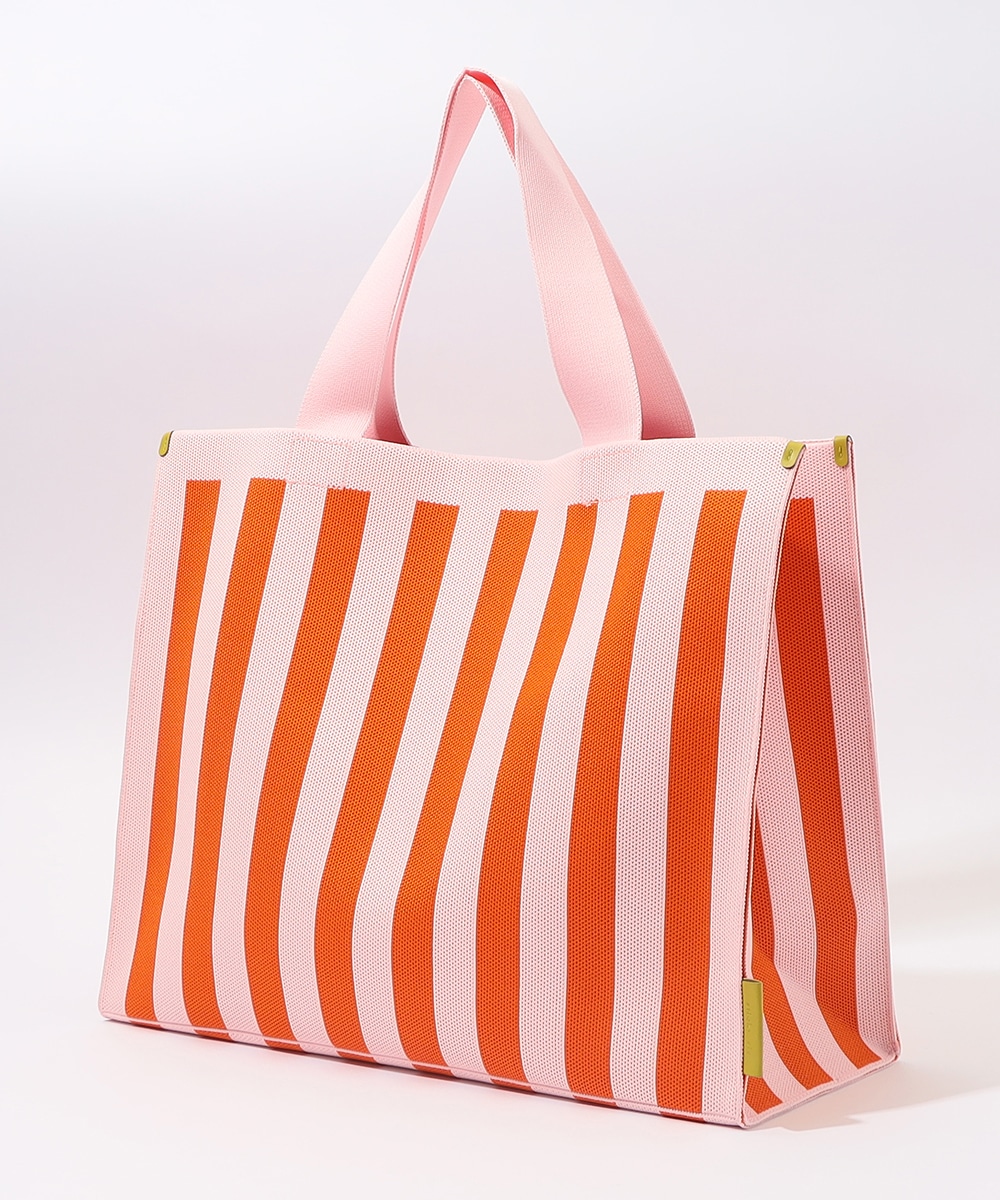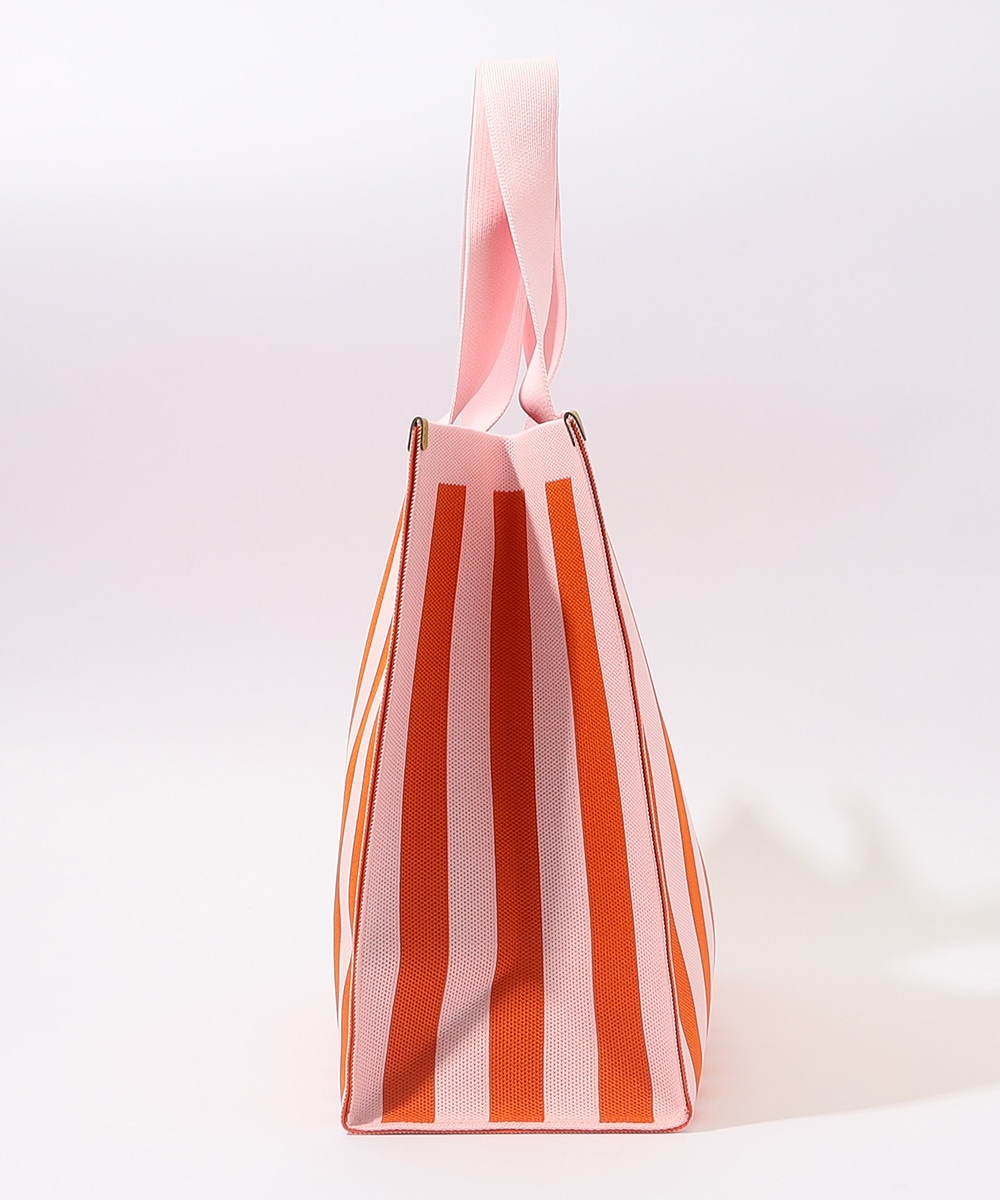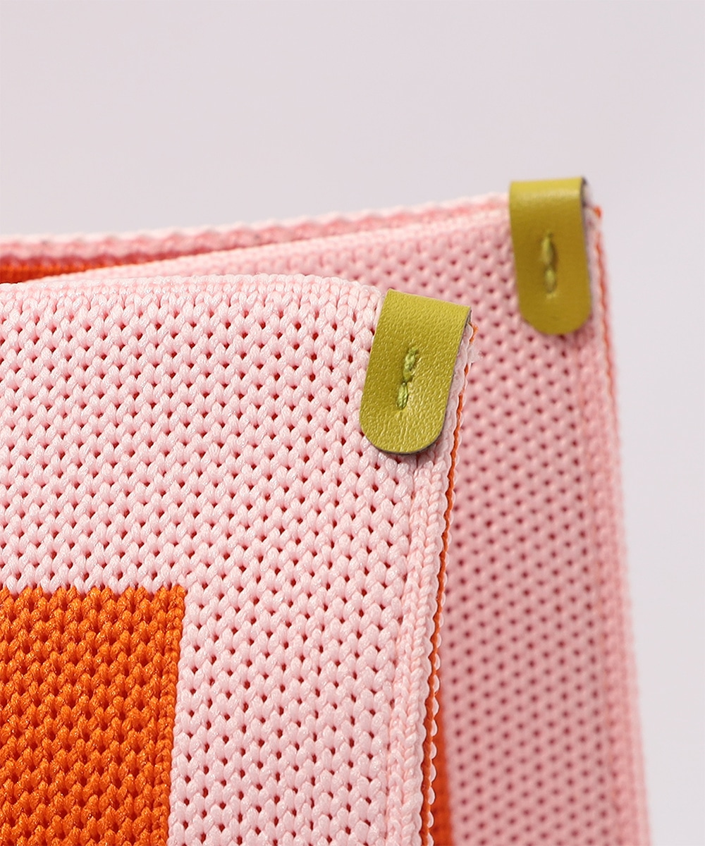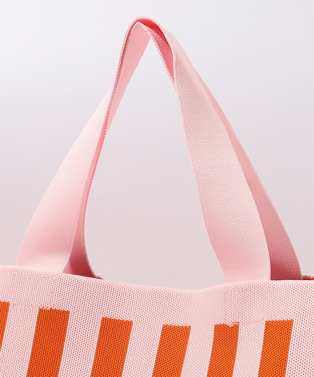 マチ幅をしっかり設けたスクエア型で、収納力抜群のトートバッグです。本体はタフで柔らかなニット生地を使用。ブランドタグには異素材を用い、高級感を高めています。着脱式のチャームポーチは、鍵や小物の収納に便利。オープンタイプの間口で荷物の出し入れがしやすく、ほどよい長さのハンドルで肩がけも手持ちも可能です。