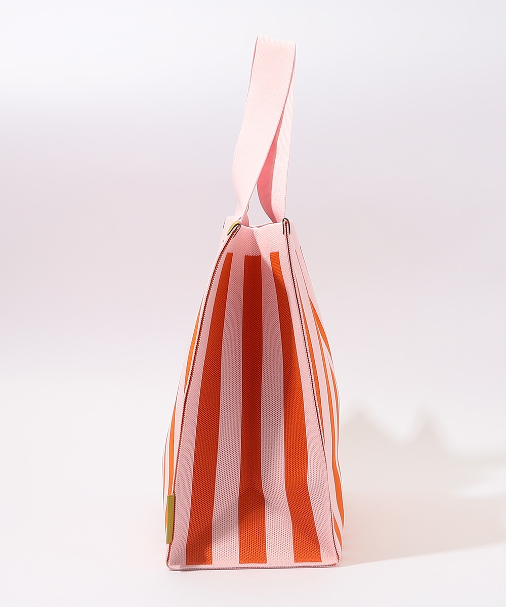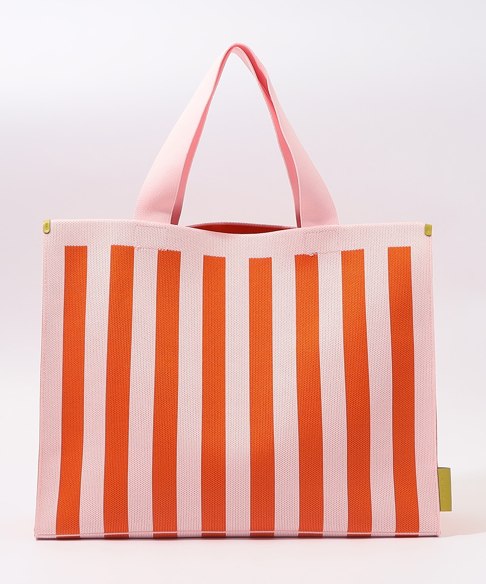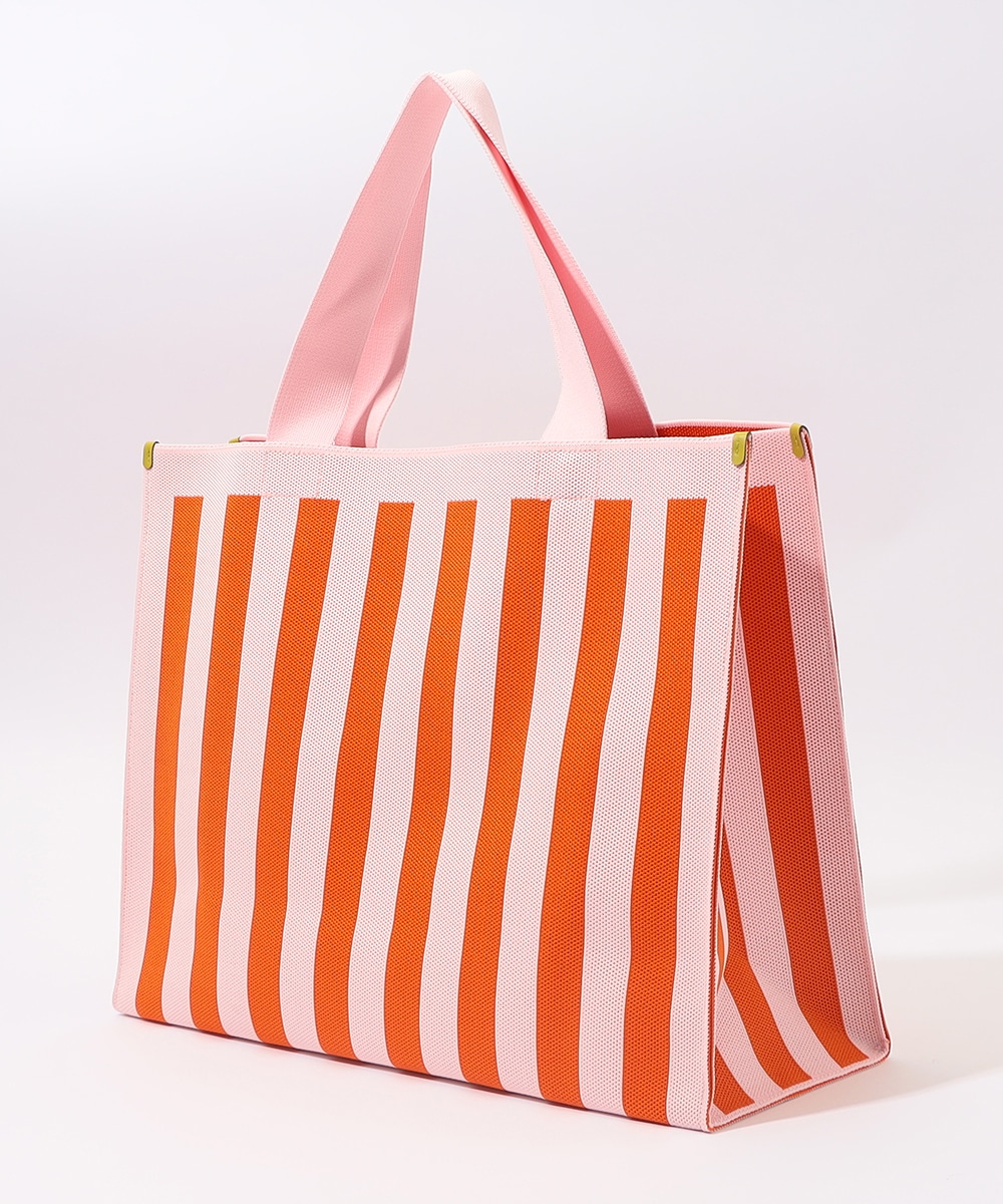マチ幅をしっかり設けたスクエア型で、収納力抜群のトートバッグです。本体はタフで柔らかなニット生地を使用。ブランドタグには異素材を用い、高級感を高めています。着脱式のチャームポーチは、鍵や小物の収納に便利。オープンタイプの間口で荷物の出し入れがしやすく、ほどよい長さのハンドルで肩がけも手持ちも可能です。
